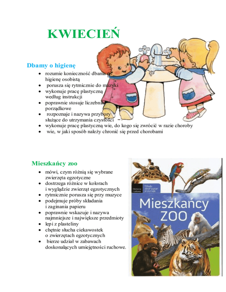 KWIECIEŃ Dbamy o higienę rozumie konieczność dbania o higienę osobistą porusza się rytmicznie do muzyki wykonuje pracę plastyczną według instrukcji poprawnie stosuje liczebniki porządkowe rozpoznaje i nazywa przybory służące do utrzymania czystości wykonuje pracę plastyczną wie, do kogo się zwrócić w razie choroby wie, w jaki sposób należy chronić się przed chorobami Mieszkańcy zoo mówi, czym różnią się wybrane zwierzęta egzotyczne dostrzega różnice w kolorach i wyglądzie zwierząt egzotycznych rytmicznie porusza się przy muzyce podejmuje próby składania i zaginania papieru poprawnie wskazuje i nazywa najmniejsze i największe przedmioty lepi z plasteliny chętnie słucha ciekawostek o zwierzętach egzotycznych bierze udział w zabawach doskonalących umiejętności ruchowe. Wielkanocne tradycje uczestniczy w zabawach ruchowych i ćwiczeniach: tułowia z elementem podskoku, przeskoku, równowagi wypowiada się na temat wiersza (o Wielkanocy) wypowiada się na temat zwyczajów związanych ze świętami wielkanocnymi wyszukuje rytm w ciągu przedmiotów (sylwet pisanek) i go kontynuuje wykonuje pisanki z wydmuszek dzieli nazwy związane z tematem na sylaby i głoski improwizuje wokalnie tekst (o pisankach) śpiewa fragment piosenki Cukrowy baranek poznaje budowę jaja kurzego ozdabia rysunki po lewej stronie karty tak samo jak na wzorze, a po prawej stronie dowolnie rysuje owal (jajko) poznaje tradycje związane z pisankami wykonuje papierowego zajączka z koszyczkiem na pisankę dodaje w zakresie dziewięciu podaje nazwy zwierząt, które wykluwają się z jajek czyta całościowo nazwy związane z tematem kończy zdania, dopowiadając rymujące się słowa rozwiązuje zagadki z wykorzystaniem zmysłu smaku rysuje w pętlach tyle samo elementów, ile jest kropek nazywa ciasta pieczone na Wielkanoc wykonuje papierowe pisanki dzieli na sylaby i głoski słowa związane z Wielkanocą układa obrazki historyjki według kolejności zdarzeń odwzorowuje wzory znajdujące się z lewej strony na elemencie, który jest z prawej strony składa życzenia kolegom i koleżankom z okazji świąt wielkanocnych Ekologia to ważna sprawa ocenia postępowanie dzieci względem przyrody stosuje słowo ekologia segreguje śmieci sprząta plac przedszkolny ilustruje wiersz ruchem realizuje tematy rytmiczne rysuje według tekstu (rysowany wierszyk) określa, co powiedziałyby rośliny na temat zniszczeń, gdyby potrafiły mówić wypowiada słowo idę w tempie poruszania się zwierząt dzieli nazwy (zwierząt leśnych) na głoski określa, co daje nam przyroda personifikuje rośliny działa twórczo, określając, co jest zielone, a co zielone i mokre omawia cykle rozwojowe żaby i motyla wymienia nazwy roślin (wybranych) spotykanych na łące wymienia nazwy zwierząt (wybranych) spotykanych na łące określa kolory łąki wiosną rozpoznaje i nazywa wybrane owady układa zagadki (o wybranym owadzie) wymyśla słowa rozpoczynające się taką sylabą, jaką kończy się usłyszane słowo wymienia przyczyny zanieczyszczenia powietrza filtruje zanieczyszczoną wodę rozpoznaje jaszczurki wie o zależności między roślinami i zwierzętami rysuje wspólnie z innymi na temat wymyślonej historyjki wskazuje wymienione części roślin poznaje nazwy wybranych kwiatów ogrodowych sadzi kwiaty na rabatce, wyhodowanego dębu na placu przedszkolnym obserwuje zasadzone kwiaty TEKSTY PIOSENEK I WIERSZY NA KWIECIEŃ ,,Bocian i żaby” Piosenka: Na łące bocian przystanął, „Nasze uszy słyszą świat” Na jednej nodze stanął. I Każdy z nas ma dwoje oczu, A żaby wkoło rechotały, Które widzą wszystko, Tak bardzo go denerwowały. Widzą wszystko. kle, kle, kle złapię je! Błękit nieba, biały domek, kle, kle, kle złapię je! zieleń traw i listków, He, He, He! He, He, He traw i listków. Na swej nodze złap bocianie mnie. Ref. Uszy słyszą ptaków śpiew, Kle, kle kle złapię cię Dzwonki deszczu, granie drzew, A nad stawem chóry żabNasze uszy słyszą świat! Wiersz - "GRZECZNE DZIECI" Stoły ślicznie nakryte, rączki czysto umyte, każdy cierpliwie czeka na swój kubek mleka. Nie ma plam na fartuszku, nie ma resztek w garnuszku. Pod stołem nie ma śmieci bo tu jadły grzeczne dzieci. II Każdy z nas ma jeden nosek Do wąchania kwiatków, Do wąchania. Czasem także do kichania, Do kichania. Lecz na szczęście rzadko. Pisanki Pisanki, pisanki jajka malowane, nie ma Wielkanocy bez barwnych pisanek. Pisanki, pisanki, jajka kolorowe, Na nich malowane bajki pisankowe. Na jednej kogucik a na drugiej słońce, Śmieją się na trzeciej laleczki tańczące. Na czwartej kwiatuszki a na piątej gwiazdki, Na każdej pisance piękne opowiastki !