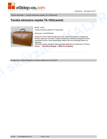 i k Utworzono : 08 marzec 2017 R P Teczki skórzane > Teczka skórzana męska Tk-163(camel) Teczka skórzana męska Tk-163(camel) Model : tk163 Teczka skórzana męska Tk-163(camel) K e Producent : KALPRODUS L A Tk-163 to męska teczka typu kufer. Na tylnym korpusie znajduje sie kieszeń zapinana na suwak.Teczka posiada trzy oddziene przegrody.Teczka wyposażona jest w dwie kieszenie(na telefon lub inne drobiazgi),futerał na długopisy. Wszystkie torebki skórzane oraz pozostała galanteria są wykonane w Polsce. n a Cena : 750,00 zł Brutto ( 609,76 zł Netto) z r ó k s Dostępność: Produkt dostępny w naszym sklepie od 24 maj 2012 kontakt : - [email protected] Strona 1/{nb}