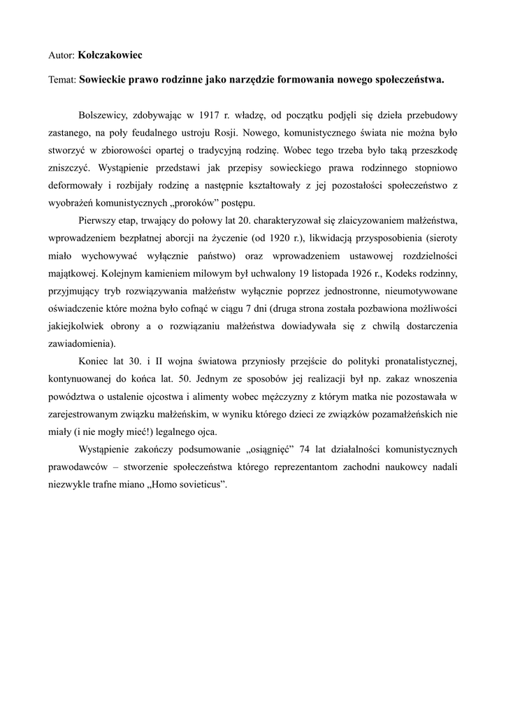 Autor: Kołczakowiec Temat: Sowieckie prawo rodzinne jako