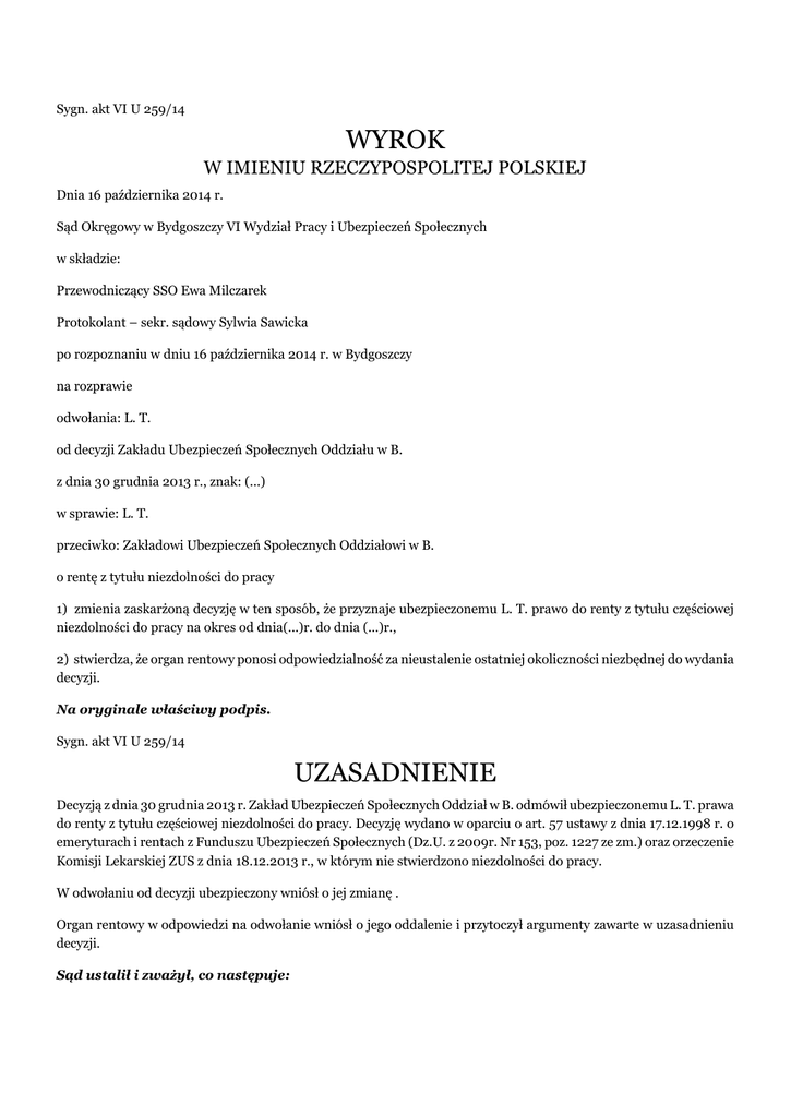 Sygn. akt VI U 259/14 WYROK W IMIENIU RZECZYPOSPOLITEJ POLSKIEJ Dnia 16 października 2014 r. Sąd Okręgowy w Bydgoszczy VI Wydział Pracy i Ubezpieczeń Społecznych w składzie: Przewodniczący SSO Ewa Milczarek Protokolant – sekr. sądowy Sylwia Sawicka po rozpoznaniu w dniu 16 października 2014 r. w Bydgoszczy na rozprawie odwołania: L. T. od decyzji Zakładu Ubezpieczeń Społecznych Oddziału w B. z dnia 30 grudnia 2013 r., znak: (...) w sprawie: L. T. przeciwko: Zakładowi Ubezpieczeń Społecznych Oddziałowi w B. o rentę z tytułu niezdolności do pracy 1) zmienia zaskarżoną decyzję w ten sposób, że przyznaje ubezpieczonemu L. T. prawo do renty z tytułu częściowej niezdolności do pracy na okres od dnia(...)r. do dnia (...)r., 2) stwierdza, że organ rentowy ponosi odpowiedzialność za nieustalenie ostatniej okoliczności niezbędnej do wydania decyzji. Na oryginale właściwy podpis. Sygn. akt VI U 259/14 UZASADNIENIE Decyzją z dnia 30 grudnia 2013 r. Zakład Ubezpieczeń Społecznych Oddział w B. odmówił ubezpieczonemu L. T. prawa do renty z tytułu częściowej niezdolności do pracy. Decyzję wydano w oparciu o art. 57 ustawy z dnia 17.12.1998 r. o emeryturach i rentach z Funduszu Ubezpieczeń Społecznych (Dz.U. z 2009r. Nr 153, poz. 1227 ze zm.) oraz orzeczenie Komisji Lekarskiej ZUS z dnia 18.12.2013 r., w którym nie stwierdzono niezdolności do pracy. W odwołaniu od decyzji ubezpieczony wniósł o jej zmianę . Organ rentowy w odpowiedzi na odwołanie wniósł o jego oddalenie i przytoczył argumenty zawarte w uzasadnieniu decyzji. Sąd ustalił i zważył, co następuje: W dniu 20.09.2013 r. ubezpieczony złożył wniosek o przyznanie prawa do renty. Do wniosku dołączył zaświadczenie o stanie zdrowia, dokumentację leczniczą oraz dokumenty potwierdzające staż pracy. Lekarz Orzecznik ZUS stwierdził w orzeczeniu z dnia 28.10.2013 r., że ubezpieczony nie jest niezdolny do pracy. Komisję Lekarską ZUS, w wydanym dnia 18.12.2013 r. orzeczeniu również nie stwierdziła niezdolności badanego do pracy. dowód: orzeczenie Lekarza Orzecznika ZUS – akta ZUS orzeczenie Komisji lekarskiej ZUS – akta ZUS Sąd poddał weryfikacji orzeczenie Komisji Lekarskiej ZUS dopuszczając dowód z opinii biegłych lekarzy sądowych o specjalnościach: neurolog i internista. Powołany zespół specjalistów po przeprowadzeniu badania, zebraniu wywiadu od ubezpieczonego oraz uwzględnieniu dokumentacji medycznej rozpoznał u badanego -wielopoziomową dyskopatię szyjna i lędźwiową , przewlekły zespół bólowy szyjny i lędźwiowo krzyżowy objawowy z zaostrzeniami oraz obecnymi objawami ubytkowymi o charakterze rwy kulszowej lewostronnej porażennej. - nadciśnienie tętnicze WHO i/II stopnia - przerost gruczołu krokowego W dalszej części orzeczenia biegli wskazali, że nie są zgodni z orzeczeniem Komisji Lekarskiej ZUS. W ocenie biegłych objawy chorobowe ze strony kręgosłupa są upośledzające istotnie sprawność ustroju pojawiły się 1,5 roku temu. Występują objawy ubytkowe o charakterze rwy kulszowej lewostronnej porażennej – chory porusza się o kuli. Zastosowane leczenie nie przyniosło poprawy. Odzyskanie sporności może nastąpić po leczeniu operacyjnym , Aktualnie powód jest niezdolny do pracy częściowo do dnia(...)r. dowód: opinia biegłych sądowych z dnia 10.07.2014 r. (k. 19-21 akt) Organ rentowy nie wniósł zastrzeżeń do opinii biegłych (k. 38 akt) Sąd podzielił wydaną opinię. Oceny stanu zdrowia powoda dokonał zespół doświadczonych specjalistów. Wydali oni opinię po przeprowadzeniu badania przedmiotowego i podmiotowego. Orzeczenie zostało prawidłowo uzasadnione, a wnioski w nim zawarte nie nasuwają wątpliwości co do ich trafności. Stąd też przedstawiona opinia jako rzetelny i fachowy dowód w sprawie została uznana za wystarczającą podstawę rozstrzygnięcia. Schorzenie kręgosłupa nie tylko uniemożliwia mu wykonywanie pracy ale również utrudnia zwykłe funkcjonowanie. Zgodnie a z art. 12 ust. 1 ustawy z dnia 17 grudnia 1998 r. o emeryturach i rentach z Funduszu Ubezpieczeń Społecznych (Dz.U. z 2004 r. Nr 39, poz. 353 ze zm.) niezdolną do pracy jest osoba, która całkowicie lub częściowo utraciła zdolność do pracy zarobkowej z powodu naruszenia sprawności organizmu i nie rokuje odzyskania zdolności po przekwalifikowaniu. Częściowo niezdolną do pracy jest zgodnie z ust. 3 cytowanego przepisu osoba, która w znacznym stopniu utraciła zdolność do pracy zgodnej z poziomem kwalifikacji. Oceniając stopień niezdolności do pracy należy, w myśl art. 13 wymienianej ustawy, uwzględnić stopień naruszenia sprawności organizmu, możliwość przywrócenia niezbędnej sprawności w drodze leczenia, możliwość wykonywania dotychczasowej pracy lub podjęcia innej oraz celowość przekwalifikowania zawodowego biorąc pod uwagę rodzaj i charakter dotychczas wykonywanej pracy, poziom wykształcenia, wiek i predyspozycje psychofizyczne. Dokonując analizy stanu zdrowia ubezpieczonego przez pryzmat wszystkich wymienionych wyżej przesłanek, Sąd doszedł do przekonania, że schorzenie ubezpieczonego w znaczny sposób ogranicza jego możliwości zarobkowania w dotychczasowy sposób i ogranicza możliwości przekwalifikowania, poszukiwania zatrudnienia i wykonywania pracy odpowiadającej poziomowi jego wykształcenia. Jak z powyższego wynika powód spełnia przesłanki uzasadniające przyznanie prawa do renty wymienione w art. 57 cytowanej ustawy na okres wskazany w opinii biegłych, tj. do (...). Mając na względzie powyższe, Sąd na zasadzie art. 47714 § 2 k.p.c. zmienił zaskarżoną decyzję orzekając jak w punkcie 1 wyroku. Przedmiotem rozstrzygnięcia pozostawało także w niniejszej sprawie, czy organ rentowy w ramach swoich uprawnień i kompetencji poczynił wszystkie możliwe ustalenia faktyczne i wyjaśnił wszystkie okoliczności konieczne do wydania decyzji. W zakresie tym