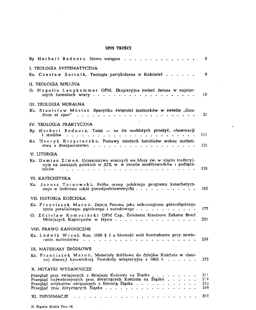 SPIS TREŚCI Bp H e r b e r t Bednorz, Słowo w s t ę p n e 5 I. TEOLOGIA SYSTEMATYCZNA Ks. Czesław Bartnik, Teologia p a r t y k u l a r n a w Kościele? 9 II. TEOLOGIA BIBLIJNA O. H u g o l i n L a n g k a m m e r szych formułach w i a r y OFM, Ekspiacyjna śmierć J e z u s a w n a j s t a r 19 III. TEOLOGIA MORALNA Ks. Stanisław Musiał, dium et spes" Specyfika świętości małżonków w świetle „Gau31 IV. TEOLOGIA PRAKTYCZNA Bp Herbert Bednorz, i studiów Taizé — na tle osobistych Ks. Henryk Krzysteczko, stwa a duszpasterstwo przeżyć, obserwacji 111 P o s t a w y młodych k a t o l i k ó w w o b e c małżeń121 V. LITURGIA Ks. D a m i a n Z i m o ń , Uczestnictwo wiernych w e Mszy św. w u j ę c i u t r a d y c y j n y m na ziemiach polskich w XIX w. w świetle modlitewników i podręczników . . . 135 VI. KATECHETYKA Ks. J a n u s z T a r n o w s k i , Próba oceny polskiego p r o g r a m u nego w (zakresie szkół p o n a d p o d s t a w o w y c h ) katechetycz165 VII. HISTORIA KOŚCIOŁA Ks. F r a n c i s z e k M a r o ń , Dzieje Pszowa jako mikroregionu górnośląskiego życia parafialnego, pątniczego i narodowego 177 O. Z d z i s ł a w K o m o s i ń s k i OFM Cap., Założenie klasztoru Z a k o n u Braci Mniejszych K a p u c y n ó w w N y s i e 231 VIII. PRAWO KANONICZNE Ks. L u d w i k W r z o ł , raniu małżeństwa Kan. 1086 § 2 a bierność woli k o n t r a h e n t a przy zawie255 IX. MATERIAŁY ŹRÓDŁOWE Ks. F r a n c i s z e k M a r o ń , M a t e r i a ł y źródłowe do dziejów Kościoła w obecn e j diecezji katowickiej. Protokoły w i z y t a c y j n e z 1665 r 275 X. NOTATKI WYDAWNICZE Przegląd Przegląd Przegląd Przegląd prac związanych z dziejami Kościoła na Śląsku n a j w a ż n i e j s z y c h p r a c dotyczących Kościoła n a Śląsku a r t y k u ł ó w związanych z historią Śląska prac dotyczących Śląska XI. INFORMACJE 21 Śląskie Studia Tom IX 311 3'4 315 316 31£ 322 SUMMARIA Czesław Bartnik, Partikulartheologie? Hugolin Langkammer, Glaubensformeln Stanisław Musiał, Christi Sühnetod 17 im Lichte der ältesten 30 Das Speziiikum der Heiligkeit der Eheleute Im Lichte „Gaudium et s p e s " Herbert Bednorz, 109 Taizé — impressions, observations et é t u d e s personelles Henryk Krzy steczko, Seelsorge Die Stellung j u n g e r Katholiken zur Ehe u n d die 120 134 D a m i a n Z i m o ń , Die Teilnahme der Gläubigen am Hl. Messopfer in Polen im XIX Jh. gemäss der damaligen Gebet-u. H a n d b ü c h e r 163 J a n u s z T a r n o w s k i , Essai d'une critique du programme polonais de catéchèse pour les écoles secondaires 175 F r a n c i s z e k M a r o n , Res gestae oppidi Pszów q u a m microregionis effecacitatis paroecialis, peregrinationis gentilisque Silesiae Superioris . . . . 230 Z d z i s ł a w K o m o s i ń s k i , Die Gründung des Klosters des Ordens der Brüder Minoriten Kapuziner in Neisse . . . . ? 253 L u d w i k W r z o l , Kan. 1086 § 2 und der passive W i l l e n s a k t des Kontrahenten bei Eheschliessung 274
