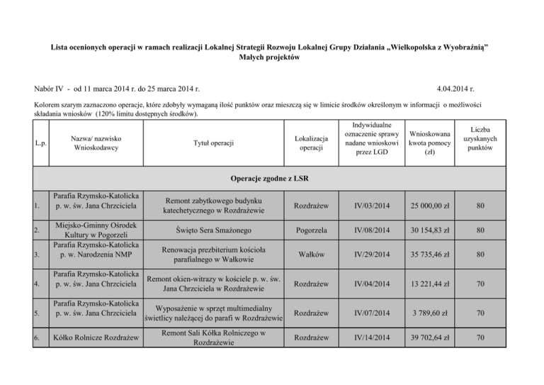 Lista ocenionych operacji w ramach realizacji Lokalnej Strategii Rozwoju Lokalnej Grupy Działania „Wielkopolska z Wyobraźnią” Małych projektów Nabór IV - od 11 marca 2014 r. do 25 marca 2014 r. 4.04.2014 r. Kolorem szarym zaznaczono operacje, które zdobyły wymaganą ilość punktów oraz mieszczą się w limicie środków określonym w informacji o możliwości składania wniosków (120% limitu dostępnych środków). L.p. Nazwa/ nazwisko Wnioskodawcy Tytuł operacji Lokalizacja operacji Indywidualne oznaczenie sprawy nadane wnioskowi przez LGD Wnioskowana kwota pomocy (zł) Liczba uzyskanych punktów Operacje zgodne z LSR 1. Parafia Rzymsko-Katolicka p. w. św. Jana Chrzciciela Remont zabytkowego budynku katechetycznego w Rozdrażewie Rozdrażew IV/03/2014 25 000,00 zł 80 Święto Sera Smażonego Pogorzela IV/08/2014 30 154,83 zł 80 Renowacja prezbiterium kościoła parafialnego w Wałkowie Wałków IV/29/2014 35 735,46 zł 80 3. Miejsko-Gminny Ośrodek Kultury w Pogorzeli Parafia Rzymsko-Katolicka p. w. Narodzenia NMP 4. Parafia Rzymsko-Katolicka p. w. św. Jana Chrzciciela Remont okien-witrazy w kościele p. w. św. Jana Chrzciciela w Rozdrażewie Rozdrażew IV/04/2014 13 221,44 zł 70 5. Parafia Rzymsko-Katolicka p. w. św. Jana Chrzciciela Wyposażenie w sprzęt multimedialny świetlicy należącej do parafi w Rozdrażewie Rozdrażew IV/07/2014 3 789,60 zł 70 6. Kółko Rolnicze Rozdrażew Remont Sali Kółka Rolniczego w Rozdrażewie Rozdrażew IV/14/2014 39 702,64 zł 70 2. 7. 8. 9. 10. 11. 12. 13. 14. 15. 16. 17. 18. 19. 20. Fundacja dla Wsi Parafia Rzymsko-Katolicka p. w. Narodzenia NMP "Świat w obiektywie" Gościejew IV/18/2014 21 786,24 zł 70 Renowacja więżby dachu kościoła parfialnego w Wałkowie Wałków IV/30/2014 35 962,37 zł 70 Borek Wlkp. IV/12/2014 14 074,08 zł 60 Pogorzela IV/19/2014 16 201,62 zł 60 Pogorzela IV/20/2014 15 244,00 zł 60 Pogorzela IV/22/2014 25 000,00 zł 60 Budy IV/28/2014 7 540,16 zł 60 Cegielnia IV/33/2014 7 181,44 zł 60 Mokronos IV/34/2014 11 432,00 zł 60 Szymanów IV/35/2014 5 203,25 zł 60 Rozdrażew IV/05/2014 5 042,72 zł 50 Rozdrażew IV/06/2014 4 663,27 zł 50 Borek Wlkp. IV/11/2014 18 544,00 zł 50 Gostyń IV/16/2014 16 703,30 zł 50 Renowacja boiska naturalnego na obiektach sportowych przy ul. Sportowej 6 w Borku Gmina Borek Wlkp. Wlkp. Zakup wyposażenia meblowego do Domu Gmina Pogorzela Strażaka w Pogorzeli Rozbudowa strefy aktywnego wypoczynku i Gmina Pogorzela rekreacji w parku miejskim w Pogorzeli Spotkania na zielonym skwerze zagospodarowanie przestrzeni wokół Gmina Pogorzela MGOK w Pogorzeli Gmina Rozdrażew Wyposażenie świetlicy wiejskiej w Budach Remont kuchni w świetlicy wiejskiej w Gmina Koźmin Wielkopolski Cegielni Budowa miejsca rekreacji dla mieszkańców Gmina Koźmin Wielkopolski wsi Mokronos Doposażenie świetlicy wiejskiej w Gmina Koźmin Wielkopolski miejscowości Szymanów Parafia Rzymsko-Katolicka Tańczymy z aniołami w Rozdrażewie p. w. św. Jana Chrzciciela warszaty taneczne Parafia Rzymsko-Katolicka p. w. św. Jana Chrzciciela Świat widziany przez obiektyw - warszaty fotograficzne Magazyn Samorządowy źródłem wiedzy dla mieszkańców Gminy Borek Wlkp. Stowarzyszenie Wspierania Zorganiozwanie cyklu szkoleń z zakresu Przedsiębiorczości Powiatu rzemiosła tradycyjnego i rozwoju turystyki Gostyńskiego wiejskiej Gmina Borek Wlkp. 21. 22. Stowarzysznie na rzecz Rozwoju Społeczności Lokalnej "Inspiracje" w Rozdrażewie Stowarzysznie Odnowy Wsi Kromolice Słoneczna gmina Rozdrażew IV/31/2014 5 770,00 zł 50 "Letnia przygoda z wodą"- organizacja warszatów nauki pływania dla dzieci Kromolice IV/32/014 7 039,58 zł 50 - - - Operacje niezgodne z LSR 1. - - -