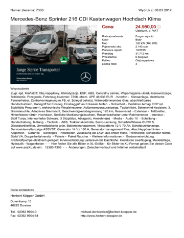 Numer zlecenia: 7306 Wydruk z: 08.03.2017 Mercedes-Benz Sprinter 216 CDI Kastenwagen Hochdach Klima Cena: 24.980,00 Rodzaj nadwozia Kolor Moc Pojemność sko. Pierwsza rejestr. Przebieg Przekładnia Paliwo Liczba foteli Furgon wysoki Biały 120 kW (163 KM) 2.143 ccm 10/2015 31.712 km 6-biegowa Olej napędowy 3 Udokum. p. VAT Wyposażenie Zugr.-lgd. Kraftstoff: Olej napędowy, Klimatyzacja, ESP, ABS, Centralny zamek, Wspomaganie układu kierowniczego, Schiebetür, Przegroda, Fahrzeug-Nummer: 7306, ehem. UPE 46.636 EUR - Komfort - Klimaanlage, elektrische Fensterheber, Zentralverriegelung m.FB, el. Spiegel beheizt, Wärmedämmendes Glas, abschließbares Handschuhfach, Haltegriff für Einstieg, Einstieggriff an Ecksäule hinten - Sicherheit - Beifahrer Airbag, ESP (el. Stabilitäts Programm), elektronische Wegfahrsperre, Außentemperaturanzeige, Tagfahrlicht, Seitenwind-Assistent, 3. Bremsleuchte, Adaptives Bremslicht, Geschwindigkeitsbegrenzung 120 km, Reserverad - Exterieur - Trittbretter, Hinterfedern härter, Hochdach, Seitliche Markierungsleuchten, Reserveradhalter unter Rahmenende - Interieur Stoff Tunja, Interieurfarbe Schwarz, 3 Sitzplätze, Ablage(n), Armlehne(n) - Media - Audio 10 - Schaltung Handschaltung, 6-Gang - Technik - ABS, Traktionskontrolle, Servo-Lenkung, Schadstoffklasse EURO 5, Dieselpartikelfilter, Umweltplakette grün, Batteriemanagement, Vliesbatterie 12 V 70 Ah, Schaltpunktanzeige, Serviceintervallanzeige ASSYST, Generator 14 V / 180 A, Generatormanagement Plus, Abschleppöse hinten Allgemein - Garantie - Sonstiges - Holzboden, Zulassung als LKW, aus erster Hand, Trennwand, Schiebetür rechts, Stabi VA, Doppelbeifahrersitz - Pakete - Paket Raucher - Weitere Informationen - Gurtwarneinrichtung, Kraftstoffpumpe elektrisch geregelt, Innenverkleidung Laderaum bis Dachhöhe, Hecktüren zweiflügelig, Modellpflege, Hydraulik - Wagenheber - - Hier finden Sie alle Bilder in XL-Größe - für Bilder im XL-Format geben Sie diesen Code auf www.aosXL.de ein: 12383-7306 - - Änderungen, Zwischenverkauf und Irrtümer vorbehalten! Dane kontaktowe Herbert Köpper GmbH Duvenkamp 10 46282 Dorsten Tel. 02362 9904-0 Fax 02362 9904-84 [email protected] http://www.herbert-koepper.de Numer zlecenia: 7306 Wydruk z: 08.03.2017 Mercedes-Benz Sprinter 216 CDI Kastenwagen Hochdach Klima Numer zlecenia: 7306 Wydruk z: 08.03.2017 Mercedes-Benz Sprinter 216 CDI Kastenwagen Hochdach Klima Numer zlecenia: 7306 Wydruk z: 08.03.2017 Mercedes-Benz Sprinter 216 CDI Kastenwagen Hochdach Klima