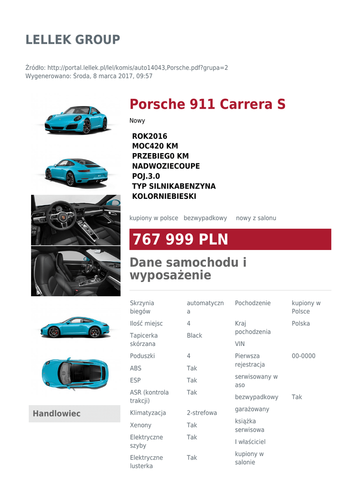LELLEK GROUP Źródło: http://portal.lellek.pl/lel/komis/auto14043,Porsche.pdf?grupa=2 Wygenerowano: Środa, 8 marca 2017, 09:57 Porsche 911 Carrera S Nowy ROK2016 MOC420 KM PRZEBIEG0 KM NADWOZIECOUPE POJ.3.0 TYP SILNIKABENZYNA KOLORNIEBIESKI kupiony w polsce bezwypadkowy nowy z salonu 767 999 PLN Dane samochodu i wyposażenie Handlowiec Skrzynia biegów automatyczn a Pochodzenie kupiony w Polsce Ilość miejsc 4 Polska Tapicerka skórzana Black Kraj pochodzenia Poduszki 4 ABS Tak ESP Tak ASR (kontrola trakcji) Tak Klimatyzacja 2-strefowa Xenony Tak Elektryczne szyby Tak Elektryczne lusterka Tak VIN Pierwsza rejestracja 00-0000 serwisowany w aso bezwypadkowy garażowany książka serwisowa I właściciel kupiony w salonie Tak Michał Knapik mobile +48 32 39 911 13 zapytaj +48 601 56 58 77 Charakterystyka spalania cykl miejski 10.1 l/100km cykl pozamiejski 6.4 l/100km cykl mieszany 7.7 l/100km emisja CO2 174 g/km Gwarancja mechaniczna 24 miesięcy perforacja nadwozia 144 miesięcy Ubezpieczenie Ubezpieczenie dostępne Kredyt Kredyt dostępny Wspomaganie kierownicy Tak Komputer Tak Radioodtwarza cz Tak Alarm Tak Immobilizer Tak Centralny zamek Tak Nawigacja satelitarna Tak Światła przeciwmgieln e Tak Czujnik deszczu Tak Czujniki parkowania Tak Kierownica wielofunkcyjna Tak Podgrzewane fotele Tak Tempomat Tak Asystent pasa ruchu Tak Kamera cofania Tak System Start-Stop Tak Asystent parkowania Tak Czujniki parkowania przód Tak Dach panoramiczny Tak Tuner TV Tak Napęd tylny Tak Światła LED Tak Alufelgi Tak Miejsce postoju Porsche Centrum Katowice tunning homologacja stan idealny właściciel niepalący Opis dodatkowy Kolor nadwozia: Miami Blue Tapicerka: Pakiet wykończenia wnętrza skórą w kolorze: Black Elementy wyposażenia dodatkowego: Zeskanuj kod, aby zobaczyć ofertę online ParkAssist (z przodu i z tyłu) z kamerą cofania Przednia szyba z szarym pasem przeciwsłonecznym Elektrycznie podnoszony/ odsuwany szklany dach Lusterka zewnętrzne SportDesign Porsche Doppelkupplung (PDK) Wspomaganie układu kierowniczego Plus System unoszenia przedniej osi Pakiet Sport Chrono Sportowy układ wydechowy Tempomat Asystent zmiany pasa ruchu (LCA) Wskaźnik ograniczenia prędkości Automatycznie przyciemniane lusterka ze zintegrowanym czujnikiem deszczu Pakiet Light Design Wielofunkcyjna podgrzewana kierownica Adaptacyjne fotele sportowe plus (elektryczna regulacja 18-pozycyjna) Podgrzewane fotele Dywaniki podłogowe Siatka w przestrzeni nóg pasażera System audio BOSE® Surround Sound Cyfrowe radio Opcje Exclusive: Lakierowane logo „PORSCHE” i oznaczenie modelu Wybrany kolor: Black Reflektory LED w kolorze czarnym z Porsche Dynamic Light System Plus (PDLS+) Przyciemnione tylne światła Przyciemniane szyby (tylne boczne szyby i tylna szyba) Lakierowany tylny zderzak Wybrany kolor: Black Osłony układu mycia reflektorów lakierowane na kontrastowy kolor nadwozia Wybrany kolor: Black Lusterka zewnętrzne SportDesign z dolnymi osłonami lakierowanymi na kolor czarny (wysoki połysk) Korek wlewu paliwa z wykończeniem aluminium-look 20-calowe koła Carrera Sport Koła lakierowane w kolorze Black (wysoki połysk) Lakierowany kluczyk i skórzane etui Obudowa kolumny kierownicy wykończona skórą Herb Porsche wytłoczony na zagłówkach Fotele sportowe plus, oparcia ze skóry Aluminiowa dźwignia zmiany biegów PDK Osłony progów ze stali szlachetnej, podświetlane Informacja nie stanowi oferty w rozumieniu art. 66 Kodeksu Cywilnego. Podane dane mają charakter wyłącznie informacyjny. Pełna informacja dostępna jest u handlowca. Sprzedający nie odpowiada za ewentualne błędy lub nieaktualność ogłoszenia. Nota prawna Informacja nie stanowi oferty w rozumieniu art. 66 Kodeksu Cywilnego. Podane dane mają charakter wyłącznie informacyjny. Pełna informacja dostępna jest u handlowca. Sprzedający nie odpowiada za ewentualne błędy lub nieaktualność ogłoszenia.