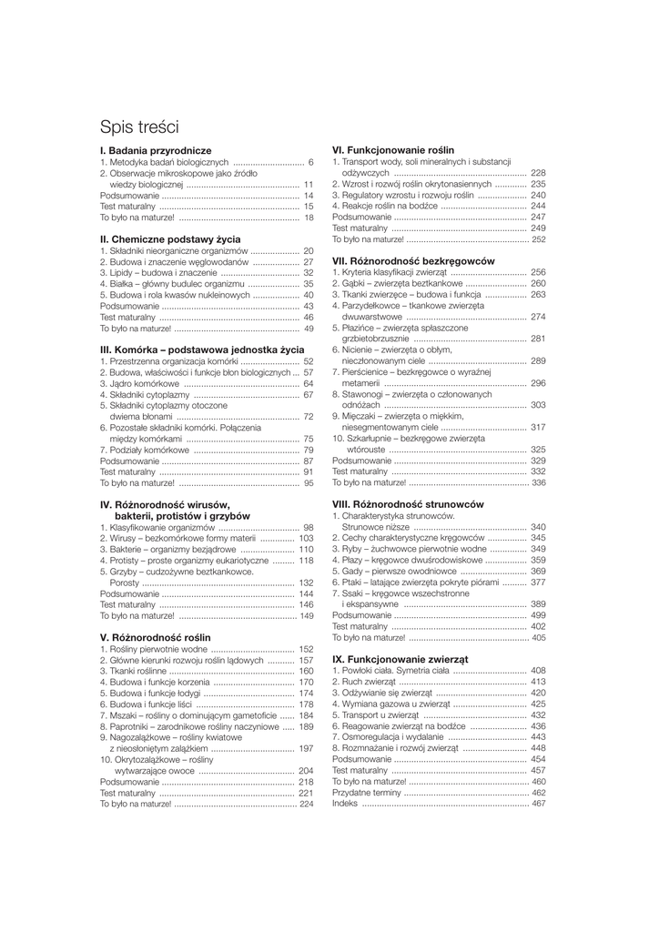 Spis treści I. Badania przyrodnicze VI. Funkcjonowanie roślin 1. Metodyka badań biologicznych ............................. 6 2. Obserwacje mikroskopowe jako źródło wiedzy biologicznej .............................................. 11 Podsumowanie ........................................................ 14 Test maturalny ......................................................... 15 To było na maturze! ................................................. 18 1. Transport wody, soli mineralnych i substancji odżywczych ...................................................... 228 2. Wzrost i rozwój roślin okrytonasiennych ............. 235 3. Regulatory wzrostu i rozwoju roślin .................... 240 4. Reakcje roślin na bodźce ................................... 244 Podsumowanie ...................................................... 247 Test maturalny ....................................................... 249 To było na maturze! .................................................. 252 II. Chemiczne podstawy życia 1. Składniki nieorganiczne organizmów .................... 2. Budowa i znaczenie węglowodanów ................... 3. Lipidy – budowa i znaczenie ................................ 4. Białka – główny budulec organizmu ..................... 5. Budowa i rola kwasów nukleinowych ................... Podsumowanie ........................................................ Test maturalny ......................................................... To było na maturze! ................................................... 20 27 32 35 40 43 46 49 III. Komórka – podstawowa jednostka życia 1. Przestrzenna organizacja komórki ........................ 2. Budowa, właściwości i funkcje błon biologicznych ... 3. Jądro komórkowe ............................................... 4. Składniki cytoplazmy ........................................... 5. Składniki cytoplazmy otoczone dwiema błonami .................................................. 6. Pozostałe składniki komórki. Połączenia między komórkami .............................................. 7. Podziały komórkowe ........................................... Podsumowanie ........................................................ Test maturalny ......................................................... To było na maturze! ................................................. 52 57 64 67 72 75 79 87 91 95 IV. Różnorodność wirusów, bakterii, protistów i grzybów 1. Klasyfikowanie organizmów ................................. 98 2. Wirusy – bezkomórkowe formy materii .............. 103 3. Bakterie – organizmy bezjądrowe ...................... 110 4. Protisty – proste organizmy eukariotyczne ......... 118 5. Grzyby – cudzożywne beztkankowce. Porosty .............................................................. 132 Podsumowanie ...................................................... 144 Test maturalny ....................................................... 146 To było na maturze! ................................................ 149 V. Różnorodność roślin 1. Rośliny pierwotnie wodne .................................. 152 2. Główne kierunki rozwoju roślin lądowych ........... 157 3. Tkanki roślinne ................................................... 160 4. Budowa i funkcje korzenia ................................. 170 5. Budowa i funkcje łodygi ..................................... 174 6. Budowa i funkcje liści ........................................ 178 7. Mszaki – rośliny o dominującym gametoficie ...... 184 8. Paprotniki – zarodnikowe rośliny naczyniowe ..... 189 9. Nagozalążkowe – rośliny kwiatowe z nieosłoniętym zalążkiem .................................. 197 10. Okrytozalążkowe – rośliny wytwarzające owoce ....................................... 204 Podsumowanie ...................................................... 218 Test maturalny ....................................................... 221 To było na maturze! .................................................. 224 VII. Różnorodność bezkręgowców 1. Kryteria klasyfikacji zwierząt ............................... 256 2. Gąbki – zwierzęta beztkankowe ......................... 260 3. Tkanki zwierzęce – budowa i funkcja ................. 263 4. Parzydełkowce – tkankowe zwierzęta dwuwarstwowe ................................................. 274 5. Płazińce – zwierzęta spłaszczone grzbietobrzusznie .............................................. 281 6. Nicienie – zwierzęta o obłym, nieczłonowanym ciele ........................................ 289 7. Pierścienice – bezkręgowce o wyraźnej metamerii .......................................................... 296 8. Stawonogi – zwierzęta o członowanych odnóżach .......................................................... 303 9. Mięczaki – zwierzęta o miękkim, niesegmentowanym ciele ................................... 317 10. Szkarłupnie – bezkręgowe zwierzęta wtórouste ........................................................ 325 Podsumowanie ...................................................... 329 Test maturalny ....................................................... 332 To było na maturze! ................................................. 336 VIII. Różnorodność strunowców 1. Charakterystyka strunowców. Strunowce niższe .............................................. 340 2. Cechy charakterystyczne kręgowców ................ 345 3. Ryby – żuchwowce pierwotnie wodne ............... 349 4. Płazy – kręgowce dwuśrodowiskowe ................. 359 5. Gady – pierwsze owodniowce ........................... 369 6. Ptaki – latające zwierzęta pokryte piórami .......... 377 7. Ssaki – kręgowce wszechstronne i ekspansywne .................................................. 389 Podsumowanie ...................................................... 499 Test maturalny .....................................................
