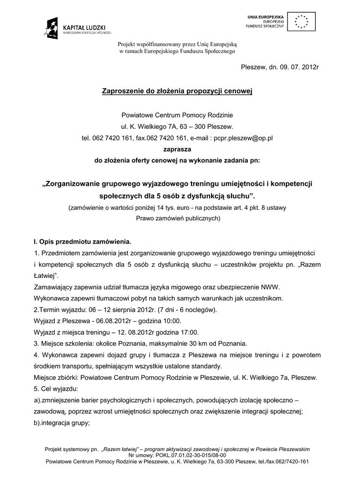 Projekt współfinansowany przez Unię Europejską w ramach Europejskiego Funduszu Społecznego Pleszew, dn. 09. 07. 2012r Zaproszenie do złożenia propozycji cenowej Powiatowe Centrum Pomocy Rodzinie ul. K. Wielkiego 7A, 63 – 300 Pleszew. tel. 062 7420 161, fax.062 7420 161, e-mail : [email protected] zaprasza do złożenia oferty cenowej na wykonanie zadania pn: „Zorganizowanie grupowego wyjazdowego treningu umiejętności i kompetencji społecznych dla 5 osób z dysfunkcją słuchu”. (zamówienie o wartości poniżej 14 tys. euro - na podstawie art. 4 pkt. 8 ustawy Prawo zamówień publicznych) I. Opis przedmiotu zamówienia. 1. Przedmiotem zamówienia jest zorganizowanie grupowego wyjazdowego treningu umiejętności i kompetencji społecznych dla 5 osób z dysfunkcją słuchu – uczestników projektu pn. „Razem Łatwiej”. Zamawiający zapewnia udział tłumacza języka migowego oraz ubezpieczenie NWW. Wykonawca zapewni tłumaczowi pobyt na takich samych warunkach jak uczestnikom. 2.Termin wyjazdu: 06 – 12 sierpnia 2012r. (7 dni - 6 noclegów). Wyjazd z Pleszewa - 06.08.2012r – godzina 10:00. Wyjazd z miejsca treningu – 12. 08.2012r godzina 17:00. 3. Miejsce szkolenia: okolice Poznania, maksymalnie 30 km od Poznania. 4. Wykonawca zapewni dojazd grupy i tłumacza z Pleszewa na miejsce treningu i z powrotem środkiem transportu, spełniającym wszystkie ustalone standardy. Miejsce zbiórki: Powiatowe Centrum Pomocy Rodzinie w Pleszewie, ul. K. Wielkiego 7a, Pleszew. 5. Cel wyjazdu: a).zmniejszenie barier psychologicznych i społecznych, powodujących izolację społeczno – zawodową, poprzez wzrost umiejętności społecznych oraz zwiększenie integracji społecznej; b).integracja grupy; Projekt systemowy pn. „Razem łatwiej” – program aktywizacji zawodowej i społecznej w Powiecie Pleszewskim Nr umowy: POKL.07.01.02-30-015/08-00 Powiatowe Centrum Pomocy Rodzinie w Pleszewie, u. K. Wielkiego 7a, 63-300 Pleszew, tel./fax.062/7420-161 Projekt współfinansowany przez Unię Europejską w ramach Europejskiego Funduszu Społecznego c).doskonalenie umiejętności interpersonalnych oraz praktyczne doskonalenie zachowań w różnych sytuacjach życiowych m.in: hotel, restauracja, zakupy, zakup biletów itp.; d). nauka samodzielności i radzenia sobie w różnych sytuacjach; 6. Zajęcia odbywać się będą dwutorowo: 1). Zajęcia teoretyczne: W ramach zajęć Wykonawca musi zapewnić minimum następującą tematykę (zajęcia z trenerem psychologiem): a). Nauka prawidłowej komunikacji (umiejętność określania własnych potrzeb i ich wyrażania w kontaktach interpersonalnych, przyjmowanie i wyrażanie krytyki, elementy komunikacji niewerbalnej, zachowania asertywne); b). Nauka radzenia sobie ze stresem i złością, w tym pozytywne metody rozładowywania napięć, techniki relaksacyjne; c).Aktywna postawa wobec życiowych trudności, w tym: zwiększenie motywacji do zmian, sposoby zmiany negatywnych przekonań; d). Nauka autoprezentacji-podstawowe elementy; e). Trening motywacji – określenie celu działania i jego realizacja (czynniki demotywujące, przeszkadzające w podjęciu działania, sposoby budowania motywacji, techniki motywacyjne). f). „Równe szanse” - tematyka nierówności, dyskryminacji, stereotypowe postrzeganie świata. 2). Zajęcia prowadzone metodami aktywizującymi (po zakończonych zajęciach teoretycznych lub zamiennie): - doskonalenie zachowań w różnych sytuacjach życiowych m.in: hotel, restauracja, zakupy, zakup biletów itp. podczas realizacji programu rekreacyjno-kulturalnego w warunkach miasta Poznania i jego okolic (w ramach zajęć odbędą się również: zajęcia integracyjne, zwiedzanie ciekawych miejsc np. wizyta w planetarium). - w przypadku wyjazdów całodniowych oprócz śniadania przed wyjazdem i kolacji po powrocie, wykonawca zapewni jeden gorący posiłek i suchy prowiant. 7. Zajęcia prowadzone będą w wymiarze 5 godzin lekcyjnych (45 minut) dziennie zajęć teoretycznych i 5 godzin dziennie zajęć praktycznych (60 minut). 8. Wykonawca zapewni uczestnikom korzystanie z różnorodnych kulturalnych i rekreacyjnych form spędzania czasu poza zajęciami. 9. Wykonawca zapewni udział opiekuna grupy - osoby, która będzie obecna podczas całego pobytu grupy i będzie troszczyła się o jego prawidłowy przebieg. 10.Wykonawca zorganizuje pobyt w ośrodku zapewniającym minimum: Projekt systemowy pn. „Razem łatwiej” – program aktywizacji zawodowej i społecznej w Powiecie Pleszewskim Nr umowy: POKL.07.01.02-30-015/08-00 Powiatowe Centrum Pomocy Rodzinie w Pleszewie, u. K. Wielkiego 7a, 63-300 Pleszew, tel./fax.062/7420-161 Projekt współfinansowany przez Unię Europejską w ramach Europejskiego Funduszu Społecznego - zakwaterowanie w pokojach maksymalnie 2 osobowych (w każdym pokoju wc, umywalka, prysznic); całodobowy dostęp do ciepłej i zimnej wody. Pokoje wyposażone w jednoosobowe łóżka z pościelą, ręczniki, szafy ubraniowe, krzesła i stoliki, szafki przy łóżkach (wyklucza się łóżka piętrowe) oraz czajnik bezprzewodowy (lub zamiennie dostęp do kuchni / pomieszczenia z czajnikiem / kuchenką). - stołówkę i pełne wyżywienie tj. urozmaicone 3 posiłki dziennie (śniadanie, obiad dwudaniowy, kolacja), suchy prowiant na wycieczki. Posiłki muszą spełniać wytyczone normy i ustalone standardy. W dniu przyjazdu na miejsce treningu Wykonawca zapewni obiad i kolację. W dniu powrotu wykonawca zapewni uczestnikom śniadanie, obiad oraz prowiant w związku z podróżą. W przypadku osób z zalecaną dietą wykonawca zapewnieni odpowiednie posiłki dostosowane do diety uczestników. - możliwość korzystania podczas zajęć z sali konferencyjnej wyposażonej w sprzęt audio-video, rzutnik multimedialny, ekran; - możliwość korzystania z infrastruktury sportowo-rekreacyjnej zlokalizowanej w okolicach miejsca zakwaterowania. 9. Wykonawca zobowiązany będzie w ramach instrumentu aktywizacji spo