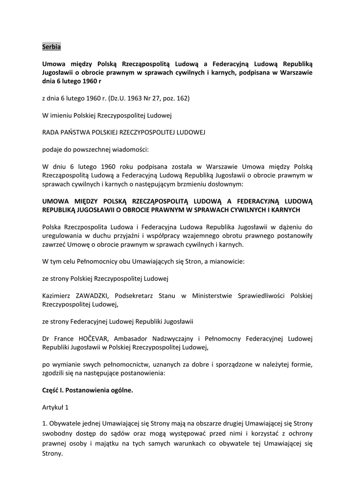 Serbia Umowa między Polską Rzecząpospolitą Ludową a Federacyjną Ludową Republiką Jugosławii o obrocie prawnym w sprawach cywilnych i karnych, podpisana w Warszawie dnia 6 lutego 1960 r z dnia 6 lutego 1960 r. (Dz.U. 1963 Nr 27, poz. 162) W imieniu Polskiej Rzeczypospolitej Ludowej RADA PAŃSTWA POLSKIEJ RZECZYPOSPOLITEJ LUDOWEJ podaje do powszechnej wiadomości: W dniu 6 lutego 1960 roku podpisana została w Warszawie Umowa między Polską Rzecząpospolitą Ludową a Federacyjną Ludową Republiką Jugosławii o obrocie prawnym w sprawach cywilnych i karnych o następującym brzmieniu dosłownym: UMOWA MIĘDZY POLSKĄ RZECZĄPOSPOLITĄ LUDOWĄ A FEDERACYJNĄ LUDOWĄ REPUBLIKĄ JUGOSŁAWII O OBROCIE PRAWNYM W SPRAWACH CYWILNYCH I KARNYCH Polska Rzeczpospolita Ludowa i Federacyjna Ludowa Republika Jugosławii w dążeniu do uregulowania w duchu przyjaźni i współpracy wzajemnego obrotu prawnego postanowiły zawrzeć Umowę o obrocie prawnym w sprawach cywilnych i karnych. W tym celu Pełnomocnicy obu Umawiających się Stron, a mianowicie: ze strony Polskiej Rzeczypospolitej Ludowej Kazimierz ZAWADZKI, Podsekretarz Stanu w Ministerstwie Sprawiedliwości Polskiej Rzeczypospolitej Ludowej, ze strony Federacyjnej Ludowej Republiki Jugosławii Dr France HOČEVAR, Ambasador Nadzwyczajny i Pełnomocny Federacyjnej Ludowej Republiki Jugosławii w Polskiej Rzeczypospolitej Ludowej, po wymianie swych pełnomocnictw, uznanych za dobre i sporządzone w należytej formie, zgodzili się na następujące postanowienia: Część I. Postanowienia ogólne. Artykuł 1 1. Obywatele jednej Umawiającej się Strony mają na obszarze drugiej Umawiającej się Strony swobodny dostęp do sądów oraz mogą występować przed nimi i korzystać z ochrony prawnej osoby i majątku na tych samych warunkach co obywatele tej Umawiającej się Strony. 2. Postanowienie ustępu 1 stosuje się odpowiednio do osób prawnych. Artykuł 2 Sądy Umawiających się Stron porozumiewają się za pośrednictwem Ministerstwa Sprawiedliwości Polskiej Rzeczypospolitej Ludowej z jednej strony oraz sekretariatów stanu do spraw sądownictwa Republik Ludowych Serbii, Chorwacji, Słowenii, Bośni i Hercegowiny, Macedonii i Czarnogóry z drugiej strony, jeżeli Umowa niniejsza nie stanowi inaczej. Artykuł 3 1. Sądy Umawiających się Stron we wzajemnym obrocie przewidzianym w niniejszej Umowie posługują się językiem polskim lub serbo-chorwackim, słoweńskim i macedońskim, jeżeli Umowa niniejsza nie stanowi inaczej. 2. Dokumenty i pisma wystawiane przez sądy jednej Umawiającej się Strony na wniosek sądów drugiej Umawiającej się Strony sporządza się w języku Strony wezwanej. Artykuł 4 Postanowienia niniejszej Umowy dotyczące sądów stosuje się odpowiednio również do innych organów, które według prawa swego Państwa właściwe są w sprawach cywilnych i karnych. Artykuł 5 Ministerstwo Sprawiedliwości Polskiej Rzeczypospolitej Ludowej i Sekretariat Związkowej Rady Wykonawczej do Spraw Sądownictwa Federacyjnej Ludowej Republiki Jugosławii udzielają sobie na wniosek tekstów przepisów, które obowiązują lub obowiązywały na obszarze ich Państwa, a w razie potrzeby także informacji co do określonych zagadnień prawnych. Część II. Sprawy cywilne. Rozdział 1. Zwolnienie od zabezpieczenia kosztów procesu i opłat sądowych. Artykuł 6 1. Od obywateli jednej Umawiającej się Strony, występujących w charakterze stron przed sądami drugiej Umawiającej się Strony, nie można żądać zabezpieczenia kosztów procesu ani składania zaliczki na opłaty sądowe z tego powodu, że są cudzoziemcami lub że nie mają na obszarze tej Strony miejsca zamieszkania ani pobytu - jeżeli na obszarze jednej z Umawiających się Stron posiadają miejsce zamieszkania lub stałego pobytu. 2. Jednakże zaliczki na koszty, którą strona obowiązana jest złożyć w toku postępowania, można żądać od obywateli drugiej Umawiającej się Strony na tych samych warunkach i w takim samym zakresie jak od obywateli własnych. 3. Postanowienia ustępów 1 i 2 stosuje się odpowiednio do osób prawnych. Artykuł 7 1. Jeżeli osoba, która w myśl artykułu 6 była zwolniona od złożenia zabezpieczenia kosztów procesu lub zaliczki na opłaty sądowe, zostanie prawomocnym i wykonalnym orzeczeniem sądu zobowiązana do pokrycia kosztów procesu lub uiszczenia opłat sądowych, wówczas na wniosek orzeczenie to podlega wykonaniu na obszarze drugiej Umawiającej się Strony co do wspomnianych kosztów i opłat - niezależnie od wykonania tego orzeczenia co do roszczenia głównego. 2. Wniosek o zapłatę kosztów procesu składa strona, na rzecz której zostały one zasądzone, wniosek zaś o uiszczenie kosztów i opłat sądowych - sąd, któremu one przypadają. Wniosek składa się w sposób określony w artykule 53 ustępy 1 i 2. 3. Do wniosku dołącza się: a) uwierzytelniony odpis tej części orzeczenia, która dotyczy kosztów procesu lub opłat sądowych, wraz z poświadczeniem prawomocności i wykonalności; b) tłumaczenie dokumentu wymienionego w punkcie a) na język Umawiającej się Strony, na której obszarze orzeczenie ma być wykonane. Tłumaczenie powinno być poświadczone w sposób określony w artykule 53 ustęp 3 punkt d). 4. Orzeczenie, o którym mowa w ustępie 1, wykonuje się jak orzeczenie sądu własnego, bez uprzedniego wysłuchania stron. 5. Pobrane koszty i opłaty sądowe przekazuje się przedstawicielstwu dyplomatycznemu lub urzędowi konsularnemu Umawiającej się Strony, od której sądu pochodził wniosek o wykonanie. Rozdział 2. Zwolnienie od kosztów i opłat sądowych. Artykuł 8 Obywatele jednej Umawiającej się Strony korzystają na obszarze drugiej Umawiającej się Strony ze zwolnienia od kosztów i opłat sądowych oraz z bezpłatnego zastępstwa procesowego na tych samych warunkach i w takim samym zakresie jak jej obywatele. Artykuł 9 1. Dla uzyskania uprawnień określo