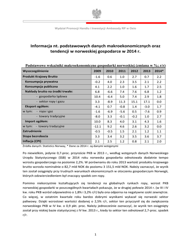 Wydział Promocji Handlu i Inwestycji Ambasady RP w Oslo Informacja nt. podstawowych danych makroekonomicznych oraz tendencji w norweskiej gospodarce w 2014 r. Podstawowe wskaźniki makroekonomiczne gospodarki norweskiej (zmiana w %; r/r) Wyszczególnienie 2009 2010 2011 2012 2013 2014* Produkt Krajowy Brutto -1.6 0.6 1.0 2.7 0.7 2.2 Konsumpcja prywatna -0.2 4.0 2.3 3.5 2.1 2.2 Konsumpcja publiczna 4.1 2.2 1.0 1.6 1.7 2.5 Nakłady brutto na środki trwałe: 6.8 -6.6 7.4 7.6 6.8 1.2 - gospodarka lądowa 10.4 -6.4 5.0 7.4 2.9 1.8 - sektor ropy i gazu 3.3 -8.9 11.3 15.1 17.1 0.0 -4.1 0.7 -0.8 1.4 -3.0 1.7 - ropa i gaz -1.6 -6.9 -5.6 0.5 -7.6 0.9 - towary tradycyjne -8.0 3.3 -0.1 -0.2 1.0 2.7 10.0 8.3 4.0 3.1 4.3 1.6 w tym: - towary tradycyjne -12.1 9.2 4.6 2.6 3.2 0.0 Zatrudnienie -0.5 -0.5 1.5 2.1 1.2 1.1 Stopa bezrobocia 3.3 3.4 3.2 3.5 3.6 3.7 Inflacja (CPI) 2.1 2.5 1.2 0.8 2.1 2.0 Eksport ogółem: w tym: Import ogółem: Żródła danych: Statistics Norway, * Dane za 2014 r. są danymi wstępnymi Po niewielkim, jedynie 0,7-proc. przyroście PKB w 2013 r., według wstępnych danych Norweskiego Urzędu Statystycznego (SSB) w 2014 roku norweska gospodarka odnotowała dodatnie tempo wzrostu gospodarczego na poziomie 2,2%. W porównaniu do roku 2013 wartość produktu krajowego brutto wzrosła nominalnie o 82,7 mld NOK do poziomu 3 151,5 mld NOK. Należy zaznaczyć, że wynik ten został osiągnięty przy trudnych warunkach ekonomicznych w otoczeniu gospodarczym Norwegii, których odzwierciedleniem był znaczący spadek cen ropy. Pomimo niekorzystnie kształtujących się tendencji na globalnych rynkach ropy, wzrost PKB norweskiej gospodarki w poszczególnych kwartałach pokazuje, że w drugiej połowie 2014 r. (w III i IV kw. roku PKB wzrósł odpowiednio o 1,8% i 3,2% r/r) była ona odporna na negatywne szoki zewnętrze. Co więcej, w ostatnim kwartale roku bardzo dobrymi wynikami wykazał się norweski sektor paliwowy. Dzięki wzrostowi wartości dodanej o 2,5% r/r, sektor ten przyczynił się do zwiększenia norweskiego PKB w IV kw. o 0,9 pkt. proc. Należy jednocześnie zaznaczyć, że wynik ten osiągnięty został przy niskiej bazie statystycznej z IV kw. 2013 r., kiedy to sektor ten odnotował 2,7-proc. spadek r/r. 1 Wydział Promocji Handlu i Inwestycji Ambasady RP w Oslo Wśród kluczowych składowych wzrostu gospodarczego Norwegii w 2014 r. największy wpływ na jego skalę miał popyt wewnętrzny, którego kontrybucja we wzrost PKB wyniosła 2,1 pkt. proc. Głównym czynnikiem pro-wzrostowym w tej kategorii była konsumpcja prywatna i publiczna – odpowiadające za ponad 60% wartości PKB ogółem, które wzrosły w analizowanym okresie odpowiednio o 2,2% (kontrybucja +1,0 pkt. proc) oraz 2,5% (kontrybucja +0,5 pkt. proc). Popyt inwestycyjny – odpowiadający za niemalże 30% norweskiego PKB, wzrósł o 2,3% (kontrybucja we wzrost PKB na poziomie 0,6 pkt. proc.). Wykres 1. PKB Norwegii w poszczególnych kwartałach 2013-2014 (zmiana %, r/r) 5 4,1 4 3,2 3 2,5 2,3 1,8 2 1,2 1 0 -0,1 -1 -2 -3 -2,9 4K 4 20 1 4K 3 20 1 4K 2 20 1 4K 1 20 1 3K 4 20 1 3K 3 20 1 3K 2 20 1 20 1 3K 1 -4 Źródło: Opracowanie WPHI Oslo na podstawie danych SSB Popyt zagraniczny tj. bilans handlowy (eksport-import) wykazał się jedynie 0,1 pkt. proc. wkładu we wzrost gospodarczy Norwegii w 2014 r. osiągając wartość 85,3 mld NOK. Inflacja w 2014 r. nie stanowiła zagrożenia dla stabilności norweskiej gospodarki zarówno pod względem zakresu zmienności (1,8%-2,3%), jak i samej wartości wskaźnika. Stopa bezrobocia na koniec 2014 r. wyniosła 3,7%. W 2015 r. oczekuje się spadku tego wskaźnika do poziomu 3,6%. Wśród głównych zagrożeń dla perspektyw wzrostu gospodarczego Norwegii w 2015 r. wymienia się oczekiwaną, 15,0-proc. redukcję nakładów inwestycyjnych w sektorze ropy i gazu. Spadające ceny ropy zmniejszają bowiem atrakcyjność planowanych wcześniej inwestycji, przez co dochodzi do rewizji planów produkcyjnych. Rodzi to ryzyko zmniejszenia zatrudnienia w sektorze paliwowym, co w dalszej kolejności może negatywnie przełożyć się na wzrost stopy bezrobocia i naturalnie na spadek konsumpcji gospodarstw domowych. 2 Wydział Promocji Handlu i Inwestycji Ambasady RP w Oslo Spadek cen ropy na światowych rynkach zwiększa ponadto presję na kosztową stronę prowadzenia działalności w sektorze paliwowym, co prowadzi do konieczności optymalizacji procesów produkcyjnych w celu utrzymania cenowej pozycji konkurencyjnej. W przypadku Norwegii rodzi to problemy głównie po stronie rynku pracy, który charakteryzują wysokie koszty zatrudnienia. W efekcie tego, dostosowanie poziomu zatrudnienia do rzeczywistego zapotrzebowania widoczne było już w IV kwartale 2014 r., kiedy to zatrudnienie w norweskim sektorze paliwowym spadło o 2,7% w skali roku. Warto tu zaznaczyć, że był to pierwszy od III kw. 2009 – kryzysowego - roku spadek tego wskaźnika w ujęciu rocznym (wówczas zatrudnienie w sektorze paliwowym spadło o 1,4%). Pomimo spadku cen ropy oraz niekorzystnych perspektyw inwestycyjnych w sektorze paliwowym, norweski rząd nie zdecydował się na rewizję założeń do budżetu na rok 2015, wg których średnia cena baryłki ropy w ciągu roku wyniesie 650 NOK (aktualnie ok. 380 NOK). Decyzję tę tłumaczy się gotowością do podjęcia działań stymulujących gospodarkę w razie rzeczywistej potrzeby. Ministerstwo Finansów wskazuje m.in. na podjęte już działania w strefie fiskalnej, gdzie stopy procentowe obniżone zostały do poziomu 1,25%. Wykres 2. Dzienne kursy NOK do PLN, USD oraz EUR w 2014 r. 0,5400 0,2000 NOK/USD NOK/EUR NOK/PLN (prawa oś) 0,1900 0,5200 0,1800 0,5000 0,1700 0,1600 0,4800 0,1500 0,4600 0,1400 0,1300 0,4400 0,1200 0,4200 0,1100 02/12/2014 02/11/2014 02/10/2014 02/09/2014 02/08/2014 02/07/2014 02/06/2014 02/05/2014 02/04/2014 02/03/2014 02/02/2014 0,4000 02/01/2014 0,1000 Źródło: Opracowanie WPHI Oslo na podstawie danych NBP Co więcej poz