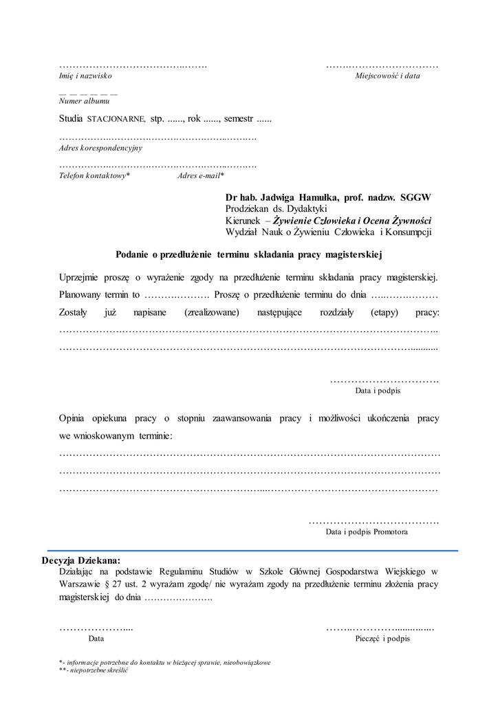………………………………..……. …….……………………… Imię i nazwisko Miejscowość i data __ __ __ __ __ __ Numer albumu Studia STACJONARNE, stp. ......, rok ......, semestr ...... ……………..………………………………..………. Adres korespondencyjny ……………..………………………………..………. Telefon kontaktowy* Adres e-mail* Dr hab. Jadwiga Hamułka, prof. nadzw. SGGW Prodziekan ds. Dydaktyki Kierunek – Żywienie Człowieka i Ocena Żywności Wydział Nauk o Żywieniu Człowieka i Konsumpcji Podanie o przedłużenie terminu składania pracy magisterskiej Uprzejmie proszę o wyrażenie zgody na przedłużenie terminu składania pracy magisterskiej. Planowany termin to ……….………. Proszę o przedłużenie terminu do dnia …..…….……… Zostały już napisane (zrealizowane) następujące rozdziały (etapy) pracy: ……………….………………………………………………………………………………….. ……………………………………………………………………………………………........... …………………………. Data i podpis Opinia opiekuna pracy o stopniu zaawansowania pracy i możliwości ukończenia pracy we wnioskowanym terminie: …………………………………………………………………………………………………… …………………………………………………………………………………………………… ……………………………………………………...…………………………………………… ………………………………. Data i podpis Promotora Decyzja Dziekana: Działając na podstawie Regulaminu Studiów w Szkole Głównej Gospodarstwa Wiejskiego w Warszawie § 27 ust. 2 wyrażam zgodę/ nie wyrażam zgody na przedłużenie terminu złożenia pracy magisterskiej do dnia …………………. ……………….... Data *- informacje potrzebne do kontaktu w bieżącej sprawie, nieobowiązkowe **- niepotrzebne skreślić ……..…………............... Pieczęć i podpis ………………………………..……. …….……………………… Imię i nazwisko Miejscowość i data __ __ __ __ __ __ Numer albumu Studia NIESTACJONARNE, stopień …..., rok ......, semestr ...... ……………..………………………………..………. Adres korespondencyjny ……………..………………………………..………. Telefon kontaktowy* Adres e-mail* Dr inż. Robert Zaremba Prodziekan ds. Dydaktyki Kierunek – Żywienie Człowieka i Ocena Żywności Wydział Nauk o Żywieniu Człowieka i Konsumpcji Podanie o przedłużenie terminu składania pracy magisterskiej Uprzejmie proszę o wyrażenie zgody na przedłużenie terminu składania pracy magisterskiej. Planowany termin to ……….………. Proszę o przedłużenie terminu do dnia …..…….……… Zostały już napisane (zrealizowane) następujące rozdziały (etapy) pracy: ……………….………………………………………………………………………………….. ……………………………………………………………………………………………........... …………………………. Data i podpis Opinia opiekuna pracy o stopniu zaawansowania pracy i możliwości ukończenia pracy we wnioskowanym terminie: …………………………………………………………………………………………………… …………………………………………………………………………………………………… ……………………………………………………...…………………………………………… ………………………………. Data i podpis Promotora Decyzja Dziekana: Działając na podstawie Regulaminu Studiów w Szkole Głównej Gospodarstwa Wiejskiego w Warszawie § 27 ust. 2 wyrażam zgodę/ nie wyrażam zgody na przedłużenie terminu złożenia pracy magisterskiej do dnia …………………. ……………….... Data *- informacje potrzebne do kontaktu w bieżącej sprawie, nieobowiązkowe **- niepotrzebne skreślić ……..…………............... Pieczęć i podpis ………………………………..……. …….……………………… Imię i nazwisko Miejscowość i data __ __ __ __ __ __ Numer albumu Studia STACJONARNE / NIESTACJONARNE** , rok ......, semestr ...... ……………..………………………………..………. Adres korespondencyjny ……………..………………………………..………. Telefon kontaktowy* Adres e-mail* Dr hab. Jadwiga Hamułka, prof. nadzw. SGGW Prodziekan ds. Dydaktyki Kierunek – Dietetyka Wydział Nauk o Żywieniu Człowieka i Konsumpcji Podanie o przedłużenie terminu składania pracy magisterskiej Uprzejmie proszę o wyrażenie zgody na przedłużenie terminu składania pracy magisterskiej. Planowany termin to ……….………. Proszę o przedłużenie terminu do dnia …..…….……… Zostały już napisane (zrealizowane) następujące rozdziały (etapy) pracy: ……………….………………………………………………………………………………….. ……………………………………………………………………………………………........... …………………………. Data i podpis Opinia opiekuna pracy o stopniu zaawansowania pracy i możliwości ukończenia pracy we wnioskowanym terminie: …………………………………………………………………………………………………… …………………………………………………………………………………………………… ……………………………………………………...…………………………………………… ………………………………. Data i podpis Promotora Decyzja Dziekana: Działając na