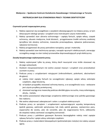 Medyczno – Społeczne Centrum Kształcenia Zawodowego i Ustawicznego w Toruniu INSTRUKCJA BHP DLA STANOWISKA PRACY: TECHNIK DENTYSTYCZNY Czynności przed rozpoczęciem pracy. 1. Należy zapoznać się szczegółowo z zasadami obowiązującymi na miejscu pracy, w tym dotyczącymi obsługi sprzętu i urządzeń oraz instrukcjami użycia materiałów. 2. Należy sprawdzić stan ubrania ochronnego – zapięty fartuch, spięte włosy, czepek ochronny, obuwie medyczne, brak biżuterii, przygotowane środki ochrony osobistej (przyłbica lub okulary ochronne, maseczka przeciwpyłowa, rękawice jednorazowe, rękawice termiczne). 3. Należy przygotować do pracy potrzebne narzędzia, sprzęt i materiały. 4. Należy sprawdzić stan techniczny sprzętu, narzędzi ręcznych i elektrycznych, zwracając szczególną uwagę na stan izolacji przewodów doprowadzających prąd elektryczny. Zasady bezpiecznego wykonywania pracy. 1. Należy wykonywać tylko tę pracę, którą zlecił nauczyciel oraz ściśle stosować się do jego wskazówek. 2. Osobom nieupoważnionym nie wolno używać maszyn i urządzeń oraz przeszkadzać uczniom w pracy. 3. Podczas pracy z urządzeniami rotującymi (mikrosilnikami, polerkami, obcinarkami do gipsu): a) należy mieć zapięty fartuch (w szczególności rękawy), spięte włosy osłonięte czepkiem, zdjąć biżuterię, b) w każdym przypadku stosować ochronę twarzy, a w szczególności oczu - wskazane jest użycie przyłbicy protetycznej, c) stosować wyciąg oraz maseczkę podczas obróbki gipsu na sucho, masy osłaniającej, akrylu, metalu. 4. Nie wolno pozostawiać włączonego urządzenia elektrycznego oraz palnika gazowego bez nadzoru. 5. Nie wolno zdejmować zabezpieczeń i osłon z urządzeń elektrycznych. 6. Podczas pracy ze sprzętem i urządzeniami wytwarzającymi wysoką temperaturę (palnik gazowy, palniczek spirytusowy lub mały palnik gazowy, wytwornica pary, wyparzarka do wosku, piec do ceramiki, piec do wygrzewania form, odlewarka do stopów) należy zachować szczególną ostrożność . 7. Podczas pracy z palnikiem gazowym Bunsena bezwzględnie należy mieć zapięte rękawy fartucha i spięte włosy osłonięte czepkiem. 8. Podczas pracy z materiałami łatwopalnymi (polimetakrylan metylu) nie należy używać ognia. 9. Należy unikać wdychania oparów materiałów szkodliwych, takich jak monomer (metakrylan metylu), lakiery dystansujące, utwardzacz do gipsu, utwardzacz do masy ogniotrwałej, masa ogniotrwała w trakcie mieszania, masa ogniotrwała w trakcie wygrzewania, elektrolit, odprężacz do wosku i silikonu. W tym celu należy korzystać z wyciągu miejscowego, dygestorium oraz używać maseczki. 10. Podczas pracy z akrylem w fazie plastyczności należy używać rękawiczek jednorazowych. 11. Na stanowisku pracy powinno znajdować się odpowiednie oświetlenie miejscowe, umieszczone w bezpiecznej oprawie, ustawione w sposób zabezpieczający przed olśnieniem. Źródło światła należy chronić przed uszkodzeniem. 12. Podczas pracy należy zapewnić w pomieszczeniu odpowiednią wentylację. Czynności po zakończeniu pracy. 1. Należy uporządkować miejsce pracy. 2. Należy zabezpieczyć sprzęt, narzędzia, materiały i środki ochrony osobistej w taki sposób, aby nie stanowiły zagrożenia po opuszczeniu przez ucznia stanowiska pracy. 3. Należy poinformować nauczyciela o zakończeniu pracy. Zasady postępowania w sytuacjach awaryjnych. 1. W przypadku wystąpienia zagrożenia należy wstrzymać pracę, zabezpieczyć stanowisko i poinformować o zagrożeniu nauczyciela. 2. Wypadek (zranienie, upadek, oparzenie, zasłabnięcie, omdlenie i in.) należy natychmiast zgłosić nauczycielowi. Osobie poszkodowanej należy udzielić pomocy. Miejsce wypadku trzeba zabezpieczyć. 3. W razie pożaru należy postępować zgodnie z instrukcją przeciwpożarową. W pierwszej kolejności należy zaalarmować nauczyciela i pozostałych uczniów oraz przystąpić spokojnie do ewakuacji. Jeśli to możliwe, należy ugasić pożar. Urządzenia elektryczne będące pod napięciem należy gasić gaśnicami śniegowymi.