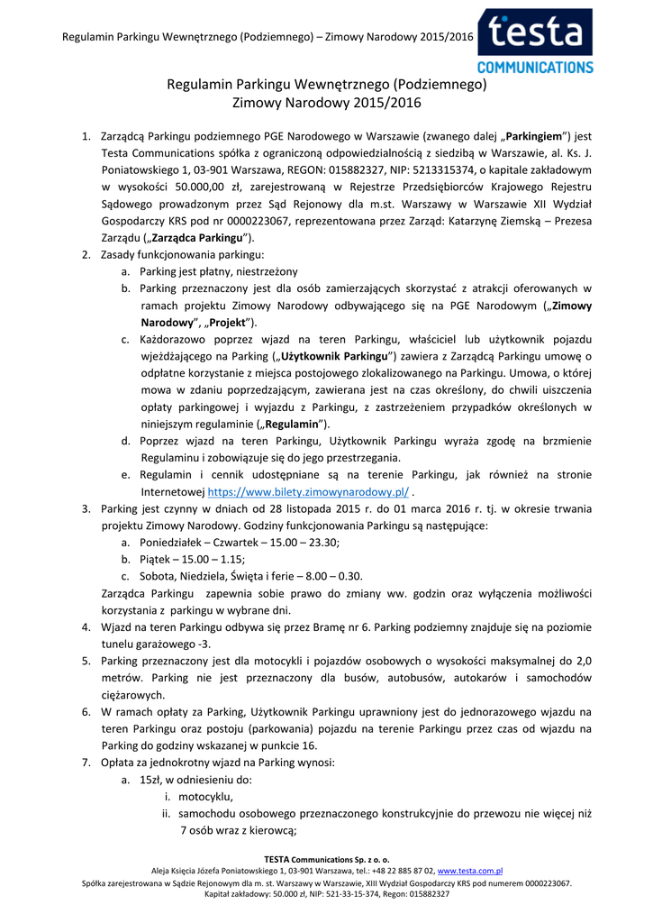 Regulamin Parkingu Wewnętrznego (Podziemnego) – Zimowy Narodowy 2015/2016 Regulamin Parkingu Wewnętrznego (Podziemnego) Zimowy Narodowy 2015/2016 1. Zarządcą Parkingu podziemnego PGE Narodowego w Warszawie (zwanego dalej „Parkingiem”) jest Testa Communications spółka z ograniczoną odpowiedzialnością z siedzibą w Warszawie, al. Ks. J. Poniatowskiego 1, 03-901 Warszawa, REGON: 015882327, NIP: 5213315374, o kapitale zakładowym w wysokości 50.000,00 zł, zarejestrowaną w Rejestrze Przedsiębiorców Krajowego Rejestru Sądowego prowadzonym przez Sąd Rejonowy dla m.st. Warszawy w Warszawie XII Wydział Gospodarczy KRS pod nr 0000223067, reprezentowana przez Zarząd: Katarzynę Ziemską – Prezesa Zarządu („Zarządca Parkingu”). 2. Zasady funkcjonowania parkingu: a. Parking jest płatny, niestrzeżony b. Parking przeznaczony jest dla osób zamierzających skorzystać z atrakcji oferowanych w ramach projektu Zimowy Narodowy odbywającego się na PGE Narodowym („Zimowy Narodowy”, „Projekt”). c. Każdorazowo poprzez wjazd na teren Parkingu, właściciel lub użytkownik pojazdu wjeżdżającego na Parking („Użytkownik Parkingu”) zawiera z Zarządcą Parkingu umowę o odpłatne korzystanie z miejsca postojowego zlokalizowanego na Parkingu. Umowa, o której mowa w zdaniu poprzedzającym, zawierana jest na czas określony, do chwili uiszczenia opłaty parkingowej i wyjazdu z Parkingu, z zastrzeżeniem przypadków określonych w niniejszym regulaminie („Regulamin”). d. Poprzez wjazd na teren Parkingu, Użytkownik Parkingu wyraża zgodę na brzmienie Regulaminu i zobowiązuje się do jego przestrzegania. e. Regulamin i cennik udostępniane są na terenie Parkingu, jak również na stronie Internetowej https://www.bilety.zimowynarodowy.pl/ . 3. Parking jest czynny w dniach od 28 listopada 2015 r. do 01 marca 2016 r. tj. w okresie trwania projektu Zimowy Narodowy. Godziny funkcjonowania Parkingu są następujące: a. Poniedziałek – Czwartek – 15.00 – 23.30; b. Piątek – 15.00 – 1.15; c. Sobota, Niedziela, Święta i ferie – 8.00 – 0.30. Zarządca Parkingu zapewnia sobie prawo do zmiany ww. godzin oraz wyłączenia możliwości korzystania z parkingu w wybrane dni. 4. Wjazd na teren Parkingu odbywa się przez Bramę nr 6. Parking podziemny znajduje się na poziomie tunelu garażowego -3. 5. Parking przeznaczony jest dla motocykli i pojazdów osobowych o wysokości maksymalnej do 2,0 metrów. Parking nie jest przeznaczony dla busów, autobusów, autokarów i samochodów ciężarowych. 6. W ramach opłaty za Parking, Użytkownik Parkingu uprawniony jest do jednorazowego wjazdu na teren Parkingu oraz postoju (parkowania) pojazdu na terenie Parkingu przez czas od wjazdu na Parking do godziny wskazanej w punkcie 16. 7. Opłata za jednokrotny wjazd na Parking wynosi: a. 15zł, w odniesieniu do: i. motocyklu, ii. samochodu osobowego przeznaczonego konstrukcyjnie do przewozu nie więcej niż 7 osób wraz z kierowcą; TESTA Communications Sp. z o. o. Aleja Księcia Józefa Poniatowskiego 1, 03-901 Warszawa, tel.: +48 22 885 87 02, www.testa.com.pl Spółka zarejestrowana w Sądzie Rejonowym dla m. st. Warszawy w Warszawie, XIII Wydział Gospodarczy KRS pod numerem 0000223067. Kapitał zakładowy: 50.000 zł, NIP: 521-33-15-374, Regon: 015882327 Regulamin Parkingu Wewnętrznego (Podziemnego) – Zimowy Narodowy 2015/2016 8. Zerowa stawka opłat za parkowanie obowiązuje: a. pojazdy służb ratowniczych; b. funkcjonariuszy organu powołanego do ochrony bezpieczeństwa publicznego, wykonujących na terenie PGE Narodowego czynności służbowe, inne niż zabezpieczenie Imprezy; c. osoby, które uzyskają zgodę Zarządcy Parkingu. d. osoby legitymujące się aktualną Kartą Parkingową dla Osób Niepełnosprawnych, pod warunkiem okazania jej w momencie wjazdu na teren Parkingu 9. Czas wynikający z przebywania pojazdu na Parkingu z takich przyczyn jak awaria lub nieprawidłowe funkcjonowanie pojazdu, kontrola policyjna lub przeprowadzona przez inne uprawnione służby, nie jest podstawą do umniejszenia opłaty o ten czas lub naliczenia opłaty w mniejszej wysokości. 10. Do zasad ruchu pojazdów na terenie Parkingu stosuje się odpowiednio przepisy ustawy z dn. 20 czerwca 1997 r. prawo o ruchu drogowym (j.t. Dz. U. z 2012 r., poz. 1137 z późn. zm.) określające zasady ruchu pojazdów w strefie zamieszkania. Na terenie Parkingu obowiązuje ograniczenie prędkości do 5 km/h. 11. Pojazdy wolno zatrzymywać i zostawiać tylko na wyznaczonym w tym celu terenie postojowym, z wyjątkiem miejsc zarezerwowanych. W przypadku niezastosowania się do powyższego przepisu, Zarządca Parkingu jest upoważniony do odholowania pojazdu lub przestawienia pojazdu, na koszt i ryzyko kierowcy. 12. Pojazd pozostawiony na Parkingu powinien być należycie zabezpieczony przed samoczynnym (mechanicznym) przemieszczeniem, zapaleniem i uszkodzeniem. Zaparkowany samochód powinien mieć również szczelnie zamknięte okna, aby dostęp do wnętrza był niemożliwy. Ryzyko skutków niezabezpieczenia lub nienależytego zabezpieczenia pojazdu ponosi Użytkownik Parkingu. 13. Użytkownicy Parkingu zobowiązani są do przestrzegania wszelkich poleceń obsługi (ochrony) Parkingu, jak również innych osób uprawnionych przez Zarządcę Parkingu do wydawania poleceń w zakresie organizacji ruchu na terenie Parkingu. 14. Na terenie Parkingu zabronione jest: a. naprawianie, mycie, odkurzanie pojazdów, wymiana płynów chłodzących, paliwa lub oleju oraz inne podobne czynności; b. palenie i używanie otwartego ognia, magazynowanie paliw, substancji łatwopalnych i pustych pojemników po paliwie, tankowanie z włączonym silnikiem, parkowanie pojazdu z nieszczelnym wlewem paliwa; c. zatrzymywanie lub postój (parkowanie) pojazdów na drogach dojazdowych lub ewakuacyjnych, lub jakichkolwiek innych miejscach niż miejsca do tego wyznaczone; d. zanieczyszczanie Parkingu, w szczególności pozos