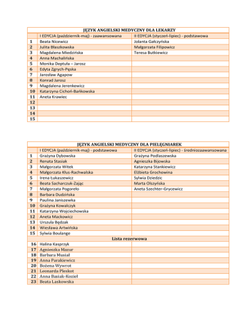 JĘZYK ANGIELSKI MEDYCZNY DLA LEKARZY I EDYCJA (październik-maj) - zaawansowana II EDYCJA (styczeo-lipiec) - podstawowa 1 Beata Nicewicz Jolanta Gałczyoska 2 Julita Błaszkowska Małgorzata Filipowicz 3 Magdalena Miedzioska Teresa Butkiewicz 4 Anna Machalioska 5 Monika Deptuła – Jarosz 6 Edyta Zgrych-Pęska 7 Jarosław Agapow 8 Konrad Jarosz 9 Magdalena Jerenkewicz 10 Katarzyna Cichoo-Baokowska 11 Aneta Krawiec 12 13 14 15 1 2 3 4 5 6 7 8 9 10 11 12 13 14 15 16 17 18 19 20 21 22 23 JĘZYK ANGIELSKI MEDYCZNY DLA PIELĘGNIAREK I EDYCJA (październik-maj) - podstawowa II EDYCJA (styczeo-lipiec) - średniozaawansowana Grażyna Dybowska Grażyna Podlaszewska Renata Stasiak Agnieszka Bijowska Małgorzata Witek Katarzyna Stankiewicz Małgorzata Kłus-Rachwalska Elżbieta Grochowina Irena Łukaszewicz Sylwia Dziedzic Beata Sacharczuk-Zając Marta Olszyoska Małgorzata Pogoreło Aneta Szechter-Grycewicz Barbara Dudzioska Paulina Janiszewka Grażyna Kowalczyk Katarzyna Wojciechowska Aneta Mackowicz Urszula Będzak Wiesława Artwioska Sylwia Boulange Lista rezerwowa Halina Kasprzyk Agnieszka Mazur Barbara Musiał Anna Parakiewicz Bożena Wywrot Leonarda Pleskot Anna Basiak-Kozieł Beata Laskowska 1 2 3 4 5 6 7 8 9 10 11 12 13 14 15 16 17 18 19 JĘZYK ANGIELSKI DLA ADMINISTRACJI I EDYCJA (październik-maj) - zaawansowana II EDYCJA (styczeo-lipiec) - podstawowa Agnieszka Jaszczak Marek Podlaszewski Tomasz Moskal Aneta Iwaoska Marta Lodzioska Urszula Zając Dominika Gmitrzuk Barbara Morawska Zofia Czajkowska Krystyna Mazur Marek Zboioski Anna Lorenc Sylwia Zagiczek Małgorzata Rożniak Magdalena Wyborska Wiesława Łuszczak Karolina Zielioska Anna Nowosad Adriana Pniewska Zdzisława Wutke Lilia Gorzko Aneta Olas Teresa Kustra Andżelika Skobel Lista rezerwowa Marta Osioska Przemysław Piątkowski Małgorzata Witkowska Elżbieta Kaczorowska-Wojciechowska