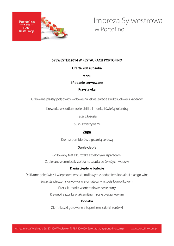 Impreza Sylwestrowa w Portofino SYLWESTER 2014 W RESTAURACJI PORTOFINO Oferta 200 zł/osoba Menu I Podanie serwowane Przystawka Grilowane plastry polędwicy wołowej na lekkiej sałacie z rukoli, oliwek i kaparów Krewetka w słodkim sosie chilli z limonką i świeżą kolendrą Tatar z łososia Sushi z warzywami Zupa Krem z pomidorów z grzanką serową Danie ciepłe Grillowany filet z kurczaka z zielonymi szparagami Zapiekane ziemniaczki z ziołami, sałatka ze świeżych warzyw Dania ciepłe w bufecie Delikatne polędwiczki wieprzowe w sosie truflowym z dodatkiem koniaku i białego wina Soczysta pieczona karkówka w aromatycznym sosie borowikowym Filet z kurczaka w orientalnym sosie curry Krewetki z szynką w aksamitnym sosie pieczarkowym Dodatki Ziemniaczki gotowane z koperkiem, sałatki, surówki Al. Kazimierza Wielkiego 6e, 87-800 Włocławek, T: 785 800 000, E: [email protected] www.portofino.com.pl Impreza Sylwestrowa w Portofino Przekąski Pieczony karczek ze śliwką Pieczony schab z pieczarkami Zestawy sushi Szparagi zawijane w szynkę Galantynki z kurczaka Sałatka śledziowa Sałatka jarzynowa w szynce II podanie serwowane Zupa gulaszowa z wołowiną Deser Mini desery Tiramisu z biszkoptami nasączonymi kawą espresso oraz likierem Amaretto, przekładane pysznym kremem na bazie sera mascarpone Napoje Woda mineralna, soki owocowe, kawa, herbata Al. Kazimierza Wielkiego 6e, 87-800 Włocławek, T: 785 800 000, E: [email protected] www.portofino.com.pl