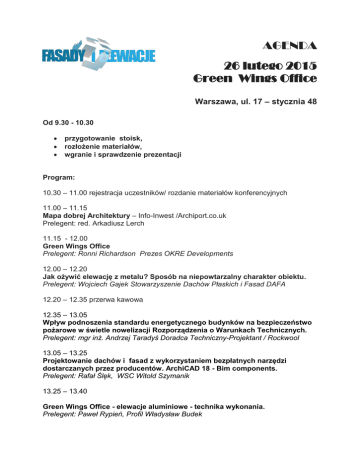 AGENDA 26 lutego 2015 Green Wings Office Warszawa, ul. 17 – stycznia 48 Od 9.30 - 10.30 przygotowanie stoisk, rozłożenie materiałów, wgranie i sprawdzenie prezentacji Program: 10.30 – 11.00 rejestracja uczestników/ rozdanie materiałów konferencyjnych 11.00 – 11.15 Mapa dobrej Architektury – Info-Inwest /Archiport.co.uk Prelegent: red. Arkadiusz Lerch 11.15 - 12.00 Green Wings Office Prelegent: Ronni Richardson Prezes OKRE Developments 12.00 – 12.20 Jak ożywić elewację z metalu? Sposób na niepowtarzalny charakter obiektu. Prelegent: Wojciech Gajek Stowarzyszenie Dachów Płaskich i Fasad DAFA 12.20 – 12.35 przerwa kawowa 12.35 – 13.05 Wpływ podnoszenia standardu energetycznego budynków na bezpieczeństwo pożarowe w świetle nowelizacji Rozporządzenia o Warunkach Technicznych. Prelegent: mgr inż. Andrzej Taradyś Doradca Techniczny-Projektant / Rockwool 13.05 – 13.25 Projektowanie dachów i fasad z wykorzystaniem bezpłatnych narzędzi dostarczanych przez producentów. ArchiCAD 18 - Bim components. Prelegent: Rafał Ślęk, WSC Witold Szymanik 13.25 – 13.40 Green Wings Office - elewacje aluminiowe - technika wykonania. Prelegent: Paweł Rypień, Profil Władysław Budek 13.40 – 14.00 Iluminacja budynków Prelegent: Piotr Linca - Xeno Lighting Concept 14.00 – 14.15 Dyskusja i wręczenie upominków. 14.15 – 15.00 Zwiedzanie Obiektu Green Wings Office 15.00 zakończenie Podczas wydarzenia: konsultacje na stoiskach Partnerów: PERFOPOL, ROCKWOOL POLSKA, STOWARZYSZENIE DAFA, WSC WITOLD SZYMANIK, BAMIX CERAMIKA, XENO LIGHTING POLAND, bezpłatna promocja wybranego projektu na anglojęzycznym portalu ArchiPort.uk.co materiały uzupełniające Pro-Service Ośrodek Wdrożeń Ekonomiczno – Organizacyjnych Budownictwa PROMOCJA Materiały wydawnicze Partnerów oraz upominki od firm: WSC Witold Szymanik – dalmierze laserowe i ipod Shuffle Perfopol ………………………………… Zwiedzanie obiektu Green Wings Office Partner strategiczny: budoskop.pl Patronat Honorowy: OKRE Development Patronat merytoryczny: Stowarzyszenie Dachów Płaskich i Fasad Ośrodek Wdrożeń Ekonomiczno – Organizacyjnych Budownictwa PROMOCJA Partnerzy medialni: Budownictwo 360, E-ściany, Bud News, Świat Szkła, Pasywny-budynek.pl, Elewacje.pl, Tynki, Dom Idealny, Living Room, Świat Betonu, Infoarchitekta, W-A.