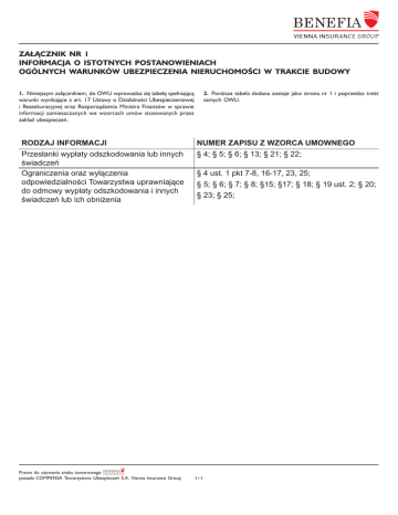 Załącznik nr 1 Informacja o istotnych postanowieniach Ogólnych warunków ubezpieczenia nieruchomości w trakcie budowy 1. Niniejszym załącznikiem, do OWU wprowadza się tabelę spełniającą warunki wynikające z art. 17 Ustawy o Działalności Ubezpieczeniowej i Reasekuracyjnej oraz Rozporządzenia Ministra Finansów w sprawie informacji zamieszczanych we wzorcach umów stosowanych przez zakład ubezpieczeń. 2. Poniższa tabela dodana zostaje jako strona nr 1 i poprzedza treść samych OWU. RODZAJ INFORMACJI NUMER ZAPISU Z WZORCA UMOWNEGO Przesłanki wypłaty odszkodowania lub innych świadczeń Ograniczenia oraz wyłączenia odpowiedzialności Towarzystwa uprawniające do odmowy wypłaty odszkodowania i innych świadczeń lub ich obniżenia § 4; § 5; § 6; § 13; § 21; § 22; Prawo do używania znaku towarowego posiada COMPENSA Towarzystwo Ubezpieczeń S.A. Vienna Insurance Group § 4 ust. 1 pkt 7-8, 16-17, 23, 25; § 5; § 6; § 7; § 8; §15; §17; § 18; § 19 ust. 2; § 20; § 23; § 25; 1/1