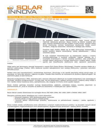 SOLAR INNOVA GREEN TECHNOLOGY, S.L. N.I.F.: ESB-54.627.278 Paseo de los Molinos, 12, Bajo 03660 – NOVELDA (Alicante) SPAIN Tel./Fax: +34 965075767 E-mail: [email protected] Website: www.solarinnova.net ENERGIA SŁONECZNA FOTOWOLTAIKA MODUŁ MONOKRYSTALICZNY - SI-ESF-M-NE-M-10W Do produkcji swoich paneli fotowoltaicznych, Solar Innova stosuje materiały najnowszej generacji. Nasze moduły są idealne wszędzie tam gdzie zjawisko fotoelektryczne jest źródłem czystej energii, wskutek niskiej emisji chemicznej, zerowej kontaminacji akustycznej. Dzięki swoim formatom, mogą być stosowane z łatwością w każdego typu instalcji. Frontowa część modułu składa się ze szkła słonecznego hartowanego o bardzo wysokim stopniu transmitancji, niskiej odblaskowości i niskiej zawartości żelaza. W tych modułach fotowoltaicznych są zastosowane ogniwa z krzemu monolikrystalicznego o wysokiej wydajności (ogniwa składają się z kryształów krzemowych o bardzo wysokiej czystości), żeby przetworzyć energię radiacji słonecznej w energię elektryczną o prądzie stałym. Każde ogniwo jest klasyfikowane elektrycznie żeby usprawnić zachowanie modułu. Układ ogniw jest laminowany stosująć komponent o nazwie EVA (Octan Etylenu Winylowego). Przednia warstwa składa się z polimeru plastycznego (Tedlar), który dostarcza wysokie zabezpieczenie oraz izolację elektryczną i przeciwko warunkom atmosferycznym. Solidna rama jest wyprodukowana z anodowanego aluminium, otrzymując w ten sposób optymalną relację inercja-waga, co powoduje, że rama jest sztywna i odporna na gięcie. Posiada kilka otworów do mocowania do struktury podtrzymującej i do uziemienia gdyby to było konieczne. Skrzynka przyłączeniowa z IP65, wykonana jest z tworzyw sztucznych odpornych na wysokie temperatury oraz zawierających terminale, zacisków przyłączeniowych i by-pass diod. Są one dostarczane z kablami symetrycznymi o średnicy sekcji miedzi 4 mm i bardzo niskiej rezystancji styku, zaprojektowany, aby osiągnąć minimalne straty spadek napięcia. Nasze moduły spełniają wszystkie wymogi bezpieczeństwa, giętkości, podwójnej izolacji, wysokiej promieniowanie UV, przez to wszystko są idealne do stosowania w instalacjach pod "gołym niebem". odporności na GWARANCJE Nasze fabryki zostały dostosowane do wymogów Normy ISO 9001:2008, ISO 14001:2004 e OHSAS 18001:2007. Stosujemy kontrolę jakości składającej się z trzech elementow: √ Okresowe inspekcje, które gwarantują jakośc surowców. √ Kontrola jakości w ciągu procesu produkcyjnego. √ Kontrola jakości wykończonego produktu, wykonywana za pośrednictwem inspekcji i testów zgodności i sprawności. Nasze moduły zostały certyfikowane przez Laboratoria o uznanym międzynarodowym prestiżu i są dowodem naszych starań w przestrzeganiu międzynarodowych norm bezpieczeństwa, długoterminowej sprawności i ogólnej jakości wyrobów. Dane techniczne i specyfikacje mogą ulec zmianie bez uprzedzenia. Ta karta spełnia wymagania określone w standardzie EN 50380:2003. SOLAR INNOVA GREEN TECHNOLOGY, S.L. N.I.F.: ESB-54.627.278 Paseo de los Molinos, 12, Bajo 03660 – NOVELDA (Alicante) SPAIN Tel./Fax: +34 965075767 E-mail: [email protected] Website: www.solarinnova.net ENERGIA SŁONECZNA FOTOWOLTAIKA MODUŁ MONOKRYSTALICZNY - SI-ESF-M-NE-M-10W Moc maksymalna (Pmpp) Tolerancja Napięcie mocy maksymalnej (Vmpp) Natężenie mocy maksymalnej (Impp) Napięcie otwartego obwodu (Voc) Natężenie zwarciowe (Isc) Napięcie maksymalne systemu (Vsyst) Diody (By-pass) Bezpiecznik w szeregu Sprawność (ηm) Współczynnik Formy CECHY ELEKTRYCZNE Wp Wp Wolty Ampery Wolty Ampery Wolty Ilość Ampery % % 10 0 ~ + 0,3 17,60 0,57 22,60 0,61 715 (IEC) 1 10 9,85 ≥ 73 CECHY MECHANICZNE Wysokość 290 mm 11,4 cale Szerokość 350 mm 13,8 cale Grubość 25 mm 0,98 cale Netto 1,4 kg 3,1 funty Materiał Aluminium anodowane AL6063-T5, minimalna 15 µm Materiał Hartowane szkło o wysokiej przepuszczalności Grubość 3,2 ± 0,2 mm 0,13 cale Typ Monokrystaliczne Ilość 4 x 9 jedinice Rozmiar 78 x 21,9 mm 3 x 0,86 cale Ilość 36 jedinice Ilość 1 jedinica Materiały EVA Grubość 0,50 ± 0,03 mm 0,020 ± 0,0012 cale Materiały TPT Grubość 0,32 ± 0,03 mm 0,013 ± 0,0012 cale Materiał PVC Ochrona IP65 Izolacja Przeciwko wilgoci oraz warunkom atmosferycznym Typ Symetryczne w długości Długość 900 mm 35,4 cale Przekrój z miedzi 4 mm2 0,006 cale 2 Niski opór przewodnictwa Cechy Minimalne straty przez spadek napięcia Materiały PVC Typ MC4 Ochrona IP67 Rozmiar Waga Struktura Część przednia Ogniwa Połączenie szeregowe Połączenie równolegle Hermetyzacja-przekładkowa Płyta tylna Puszka łączeniowa Przewody Łączniki CECHY TERMICZNE Współczynnik temperatury natężenia zwarciowego α (Isc) Współczynnik temperatury napięcia otwartego obwodu β (Voc) Współczynnik temperatury mocy γ (Pmpp) Współczynnik temperatury maksymalnej mocy (Impp) Współczynnik temperatury napięcia maksymalnej mocy (Vmpp) NOCT (Znamionowa Temperatura Pracy Ogniwa) %/º C %/º C %/º C %/º C %/º C ºC + 0,0814 - 0,3910 - 0,5141 + 0,10 - 0,38 + 47 ± 2 TOLERANCJE Temperatura pracy Napięcie izolacji dielektrycznej Wilgotność względna Odporność na wiatr ºC Zdolność obciążenia mechanicznego Odporność ogniowa ºF Wolty % m/s kg/m2 funty/stopy2 kg/m2 funty/stopy2 Klasa Dane techniczne i specyfikacje mogą ulec zmianie bez uprzedzenia. Ta karta spełnia wymagania określone w standardzie EN 50380:2003. - 40 ~ + 85 - 40 ~ + 185 3.000 0 ~ 100 60 245 (2.400 Pa) 491,56 551 (5.400 Pa) IEC 75,2 (3.600 Pa) UL C SOLAR INNOVA GREEN TECHNOLOGY, S.L. N.I.F.: ESB-54.627.278 Paseo de los Molinos, 12, Bajo 03660 – NOVELDA (Alicante) SPAIN Tel./Fax: +34 965075767 E-mail: [email protected] Website: www.solarinnova.net ENERGIA SŁONECZNA FOTOWOLTAIKA MODUŁ MONOKRYSTALICZNY - SI-ESF-M-NE-M-10W POMIARY WYKONANE ZGODNIE ZE STANDARDOWYMI METODAMI TESTÓW ASTM E1036, POPR