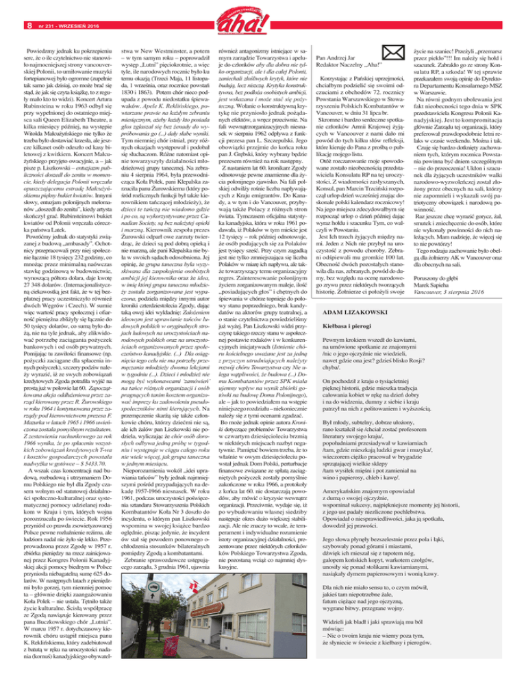 8 nr 231 - WRZESIEŃ 2016 Powiedzmy jednak ku pokrzepieniu serc, ¿e o ile czytelnictwo nie stanowi³o najmocniejszej strony vancouverskiej Polonii, to umi³owanie muzyki fortepianowej by³o ogromne (zupe³nie tak samo jak dzisiaj, co mo¿e braæ siê st¹d, ¿e jak siê czyta ksi¹¿kê, to z regu³y ma³o kto to widzi). Koncert Artura Rubinsteina w roku 1963 odby³ się przy wype³nionej do ostatniego miejsca sali Queen Elizabeth Theatre, a kilka miesiêcy póŸniej, na wystêpie Witolda Ma³cu¿yñskiego nie tylko że trzeba by³o dostawiaæ krzes³a, ale jeszcze kilkaset osób odesz³o od kasy biletowej z kwitkiem. Koncert Małcu¿yñskiego przyjêto owacyjnie, a – jak pisze p. Liszkowski – entuzjazm publiczności doszedł do zenitu w momencie, kiedy delegacja Polonii wręczała opuszczającemu estradę Małcużyńskiemu piękny bukiet kwiatów. Innymi słowy, entuzjam polonijnych melomanów „doszedł do zenitu”, kiedy artysta skończył grać. Rubinsteinowi bukiet kwiatów od Polonii wrêcza³a córeczka pañstwa Latek. Powróæmy jednak do statystyki zwi¹zanej z budow¹ „ambasady”. Ochotnicy przepracowali przy niej spo³ecznie ³¹cznie 18 tysięcy 232 godziny, co mno¿¹c przez minimaln¹ naówczas stawkê godzinow¹ w budownictwie, wynosz¹c¹ pó³tora dolara, daje kwotê 27 348 dolarów. (Internacjonalistyczn¹ ciekawostk¹ jest fakt, ¿e w tej bezp³atnej pracy uczestniczy³o równie¿ dwóch Wêgrów i Czech). W sumie wiêc wartoœæ pracy spo³ecznej i ofiarnoœæ pieniê¿na zbli¿y³y siê ³¹cznie do 50 tysiêcy dolarów, co sum¹ by³o du¿¹, nie na tyle jednak, aby zlikwidowaæ potrzebê zaci¹gania po¿yczek bankowych i od osób prywatnych. Pomijaj¹c tu zawi³oœci finansowe (np. po¿yczki zaci¹gane dla sp³acenia innych po¿yczek), szczery podziw nale¿y wyraziæ, i¿ ze swych zobowi¹zañ kredytowych Zgoda potrafi³a wyjœæ na prost¹ ju¿ w po³owie lat 60. Zapoczątkowana akcja oddłużeniowa przez zarząd kierowany przez R. Żurowskiego w roku 1964 i kontynuowana przez zarządy pod kierownictwem prezesa F. Mazurka w latach 1965 i 1966 uwieńczona została pomyślnym rezultatem. Z zestawienia rachunkowego za rok 1966 wynika, że po spłaceniu wszystkich zobowiązań kredytowych T-wa i kosztów gospodarczych powstała nadwyżka w gotówce – $ 5433.70. A wszak czas koncentracji nad budow¹, rozbudow¹ i utrzymaniem Domu Polskiego nie by³ dla Zgody czasem wolnym od statutowej dzia³alnoœci spo³eczno-kulturalnej oraz systematycznej pomocy udzielanej rodakom w Kraju i tym, których wojna porozrzuca³a po œwiecie. Rok 1956 przyniós³ co prawda zsowietyzowanej Polsce pewne rozluŸnienie re¿imu, ale ludziom nadal nie ¿y³o siê lekko. Przeprowadzona przez Zgodê w 1957 r. zbiórka pieniêdzy na rzecz zainicjowanej przez Kongres Polonii Kanadyjskiej akcji pomocy biednym w Polsce przynios³a niebagateln¹ sumê 625 dolarów. W nastêpnych latach z pieniędzmi by³o gorzej, tym niemniej pomoc ta – g³ównie dziêki zaangażowaniu Ko³a Polek – nie usta³a. Têtni³o tak¿e ¿ycie kulturalne. Œcis³¹ wspó³pracê ze Zgod¹ nawi¹zuje kierowany przez pana Buczkowskiego chór „Lutnia”. W marcu 1957 r. dotychczasowy kierownik chóru ust¹pi³ miejsca panu K. Rekliñskiemu, który zadebiutował z batut¹ w rêku na uroczystoœci nadania (komuœ) kanadyjskiego obywatel- stwa w New Westminster, a potem – w tym samym roku – poprowadzi³ wystêp „Lutni” piêciokrotnie, a wiêc tyle, ile narodowych rocznic by³o ku temu okazj¹ (Trzeci Maja, 11 listopada, 1 wrzeœnia, oraz rocznice powstań 1830 i 1863). Potem chór nieco podupada z powodu niedostatku œpiewawaków. Apele K. Reklińskiego, powtarzane prawie na każdym zebraniu miesięcznym, ażeby każdy kto posiada głos zgłaszał się bez żenady do wypróbowania go (...) dały słabe wyniki. Tym niemniej chór istnia³, przy ró¿nych okazjach wystêpowa³ i podoba³ siê s³uchaczom. Ró¿ne natomiast opinie towarzyszy³y dzia³alnoœci m³odzie¿owej grupy tanecznej. Na zebraniu 4 sierpnia 1964, była przewodnicz¹ca Ko³a Polek, pani Klepalska zarzuci³a panu ¯urowskiemu (który poœród rozlicznych funkcji by³ tak¿e kierownikiem tañcz¹cej młodzieży), że dzieci te tańczą nie wiadomo gdzie i po co, są wykorzystywane przez Canadian Society, są bez należytej opieki i marzną. Kierownik zespo³u prezes ¯urowski odpar³ owe zarzuty twierdz¹c, ¿e dzieci s¹ pod dobr¹ opiek¹ i nie marzn¹, ale pani Klepalska nie by³a w swoich s¹dach odosobniona. Jej opiniê, ¿e grupa taneczna była wyzyskiwana dla zaspokojenia osobistych ambicji jej kierownika oraz że idea, w imię której grupa taneczna młodzieży została zorganizowana jest wypaczona, podziela miêdzy innymi autor kroniki czterdziestolecia Zgody, dając tak¹ owej idei wyk³adniê: Założeniem ideowym jest uprawianie tańców ludowych polskich w oryginalnych strojach ludowych na uroczystościach narodowych polskich oraz na uroczystościach organizowanych przez społeczeństwo kanadyjskie. (...) Dla osiągnięcia tego celu nie ma potrzeby przemęczania młodzieży dwoma lekcjami w tygodniu (...). Dzieci i młodzież nie mogą być wykonawcami ‘zamówień’ na tańce różnych organizacji i osób pragnących tanim kosztem organizować imprezy ku zadowoleniu pseudospołeczników nimi kierujących. Na przemêczenie skar¿¹ się także członkowie chóru, którzy dzieæmi nie s¹, ale ich ¿alów pan Liszkowski nie podziela, wyliczaj¹c ¿e chór osób dorosłych odbywa jedną próbę w tygodniu i występuje w ciągu całego roku nie wiele więcej, jak grupa taneczna w jednym miesiącu. Nieporozumienia wokó³ „idei uprawiania tañców” by³y jednak najmniejszymi poœród przypadaj¹cych na dekadę 1957-1966 niesnasek. W roku 1961, podczas uroczystoœci poświęcenia sztandaru Stowarzyszenia Polskich Kombatantów Ko³a Nr 3 dosz³o do incydentu, o którym pan Liszkowski wspomina w swojej ksi¹¿ce bardzo oglêdn