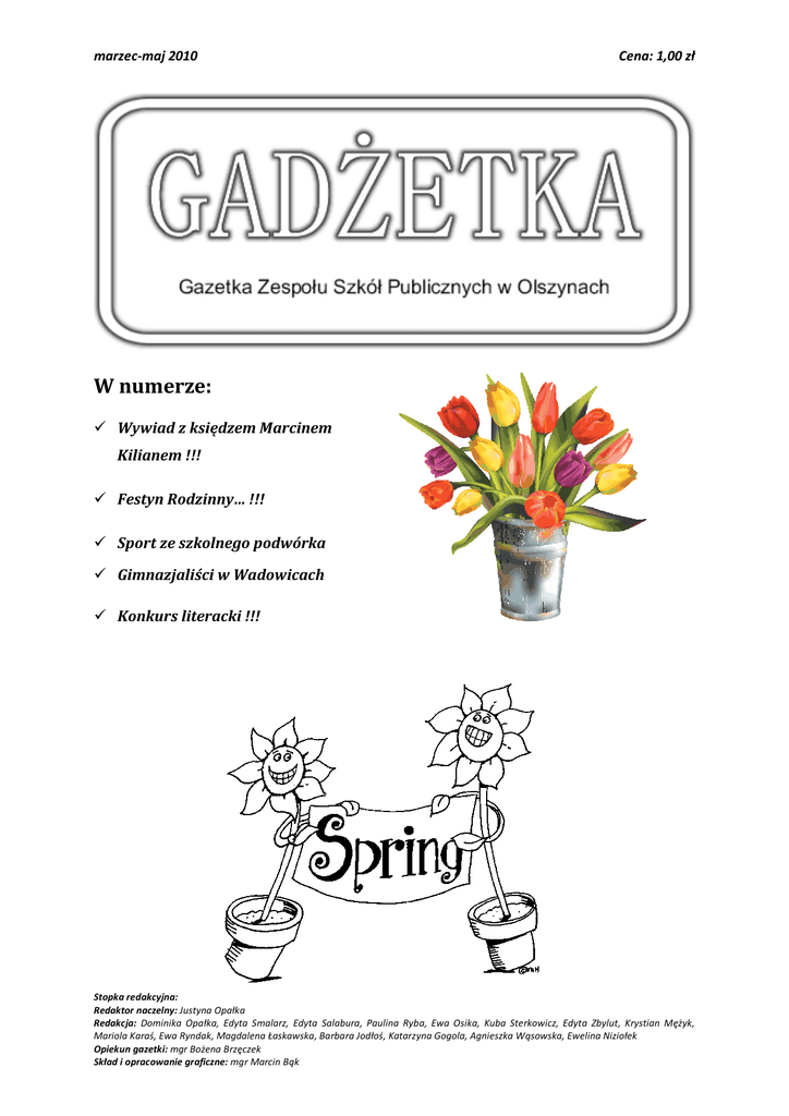 marzec-maj 2010 Cena: 1,00 zł W numerze: ü Wywiad z księdzem Marcinem Kilianem !!! ü Festyn Rodzinny… !!! ü Sport ze szkolnego podwórka ü Gimnazjaliści w Wadowicach ü Konkurs literacki !!! Stopka redakcyjna: Redaktor naczelny: Justyna Opałka Redakcja: Dominika Opałka, Edyta Smalarz, Edyta Salabura, Paulina Ryba, Ewa Osika, Kuba Sterkowicz, Edyta Zbylut, Krystian Mężyk, Mariola Karaś, Ewa Ryndak, Magdalena Łaskawska, Barbara Jodłoś, Katarzyna Gogola, Agnieszka Wąsowska, Ewelina Niziołek Opiekun gazetki: mgr Bożena Brzęczek Skład i opracowanie graficzne: mgr Marcin Bąk G a d ż e t k a Gimnazjaliści w Wadowicach 20 marca 2010 roku uczniowie gimnazjum w Olszynach wraz z opiekunami udali się do Wadowic. Wycieczka rozpoczęła się o godzinie 7:00. Po trzech godzinach jazdy autokarem wszyscy byli już w Wadowicach. W zwiedzaniu tego miasta towarzyszył przewodnik, który opowiedział o poszczególnych miejscach oraz przybliżył historię miasta, z którego pochodził papież Jan Paweł II. Na początek przewidziane było zwiedzanie muzeum – dawnego domu Karola Wojtyły. Znajdowały się tam przedmioty należące do papieża, stroje papieskie oraz różne fotografie z Janem Pawłem II. Po zwiedzaniu muzeum wszyscy udali się wraz z przewodnikiem na dwugodzinny spacer po Wadowicach. Najpierw przewodnik poprowadził ich ulicami Wadowic do kościoła św. Piotra Apostoła. Uczniowie odwiedzili kościół, po czym przewodnik opowiedział historię jego budowy. Po wyjściu z kościoła wszyscy udali się na ścieżkę zbudowaną na wzór Golgoty za kościołem… Następnie uczestnicy wycieczki poszli w stronę Placu Jana Pawła II, po drodze odwiedzając Klasztor Karmelitów Bosych. Na końcu dotarli do Bazyliki Ofiarowania Najświętszej Maryi Panny, która była częstym miejscem pobytu Karola Wojtyły, kiedy mieszkał w Wadowicach. Po zwiedzaniu miasta uczestnicy Strona 2 z 16 G a d ż e t k a udali się na obiad do pobliskiej restauracji, gdzie można było również kupić charakterystyczne dla tego miejsca kremówki . Po obiedzie przewidziano czas na kupowanie pamiątek. Po zebraniu się uczestników wycieczki, wszyscy wsiedli do autokaru i żegnając się z tym pięknym miastem odjechali w stronę Olszyn. Magdalena Łaskawska i Ewelina Niziołek - kl. I gimn. Strona 3 z 16 G a d ż e t k a Wywiad z księdzem Marcinem Kilianem * Ile lat ksiądz jest już kapłanem? - Od 7 lat. * W jakiej parafii wcześniej ksiądz pracował? - W Grywałdzie przez 3 lata. * Czym różni się praca w naszej parafii od poprzedniej? - Dotychczas byłem w parafiach wiejskich. Każda społeczność parafialna jest inna, ale praca księdza w każdej parafii jest podobna. * Jakie ksiądz ma zainteresowania? - Mam kilka pasji, które staram się rozwijać. Jest wśród nich: informatyka, sport: narty, jazda na motorze. * Czy ma ksiądz rodzeństwo? - Tak. Mam starszą siostrę i brata. * Kiedy ksiądz zdecydował się na drogę kapłaństwa? - O wstąpieniu do seminarium zacząłem myśleć w szkole średniej, w klasie maturalnej. * Kiedy została założona i jaki jest cel strony internetowej parafii? - Strona została założona początkiem marca. Jej celem jest informowanie parafian o bieżących wydarzeniach w naszej parafii. Strona 4 z 16 G a d ż e t k a * Kto ją stworzył i kto się nią zajmuje? - Została założona przeze mnie i Mateusza Ryndaka. Ja zajmuje się tekstami i aktualnościami, a Mateusz grafiką. * Jaka jest reakcja mieszkańców Olszyn? - Mieszkańcy są zadowoleni z tego co się na niej znajduje * Bardzo dziękujemy za wywiad. Wywiad przeprowadziły: Katarzyna Gogola kl. I gimn., Ewa Osika kl. II gimn. Festyn Rodzinny już wkrótce! Tradycyjnie już nasza szkoła przygotowuje się do kolejnej edycji Dnia Rodziny. Jak będzie wyglądała tegoroczna impreza opowiedziała nam Pani Halina Duran, opiekunka SU. Redakcja: Na kiedy zaplanowany jest Dzień Rodziny? Pani Duran: Dzień Rodziny zaplanowano na 6 czerwca. Redakcja: Co przewidziane jest w programie tego dnia? Jakieś konkurencje? Pani Duran: Program tegorocznej imprezy jest w toku opracowywania wspólnie z Samorządem Uczniowskim. Jak co roku będzie loteria fantowa, która cieszy się dużym zainteresowaniem. Uczniowie naszej szkoły zaprezentują się wokalnie i tanecznie. Redakcja: Czy będą jakieś inne dodatkowe atrakcje? Pani Duran: Niespodzianki też są przewidziane. Nie będę jeszcze zdradzać, niech pozostaną tajemnicą. Strona 5 z 16 G a d ż e t k a Przewidziana jest nagroda główna. Będą pieczone kiełbaski, stoisko z watą cukrową, napoje i lody oraz bigos przygotowany przez rodziców. Redakcja: Czy tego roku odbędą się mecze piłki siatkowej i nożnej jak w poprzednich latach? Pani Duran: Oczywiście mecze piłki nożnej i siatkowej odbędą się. Cieszą się one dużym zainteresowaniem wśród rodziców i uczniów. Jeśli macie jakieś nowe i ciekawe propozycje, chętnie włączymy je do naszego programu. Dziękuję za rozmowę. Dziękujemy Pani Duran za rozmowę i ze swej strony również zachęcamy wszystkich do aktywnego włączenia się w przygotowanie tej imprezy. Redakcja: Dominika Opałka, Edyta Salabura - kl. I gimn. Nowy sezon sportowy! Nowy sezon 2010 rozpoczęty!! W sobotę, 10 kwietnia nasi Juniorzy zagrali mecz z LKS Olszynka Ołpiny. Mecz był bardzo ekscytujący. Tuż przed meczem minutą ciszy piłkarze oddali cześć ofiarom wypadku w Smoleńsku. W 39 minucie gola dla LKS Olszyny strzelił Miłosz Mężyk. W jego ślady podążył Daniel Ryndak, który w 69 minucie strzelił drugiego gola dla Olszyn. Mecz zakończył się zwycięstwem 2:0 nad Ołpinami. Strona 6 z 16 G a d ż e t k a Pierwszy zwycięski mecz, nie tylko dał naszym piłkarzom dobre miejsce na start, ale także dodał chęci do dalszej walki o czołowe miejsca. Drużyna ma jednak pewne kłopoty. Nieliczne ale na pewno odgrywające się na grze drużyny kontuzje dwóch czołowych obrońców Michała Les