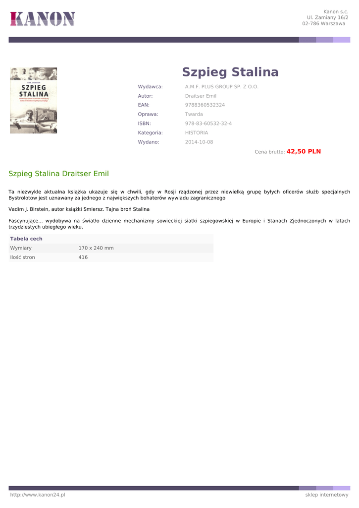 Kanon s.c. Ul. Zamiany 16/2 02-786 Warszawa Szpieg Stalina Wydawca: A.M.F. PLUS GROUP SP. Z O.O. Autor: Draitser Emil EAN: 9788360532324 Oprawa: Twarda ISBN: 978-83-60532-32-4 Kategoria: HISTORIA Wydano: 2014-10-08 Cena brutto: 42,50 PLN Szpieg Stalina Draitser Emil Ta niezwykle aktualna książka ukazuje się w chwili, gdy w Rosji rządzonej przez niewielką grupę byłych oficerów służb specjalnych Bystrolotow jest uznawany za jednego z największych bohaterów wywiadu zagranicznego Vadim J. Birstein, autor książki Smiersz. Tajna broń Stalina Fascynujące... wydobywa na światło dzienne mechanizmy sowieckiej siatki szpiegowskiej w Europie i Stanach Zjednoczonych w latach trzydziestych ubiegłego wieku. Tabela cech Wymiary 170 x 240 mm Ilość stron 416 http://www.kanon24.pl sklep internetowy