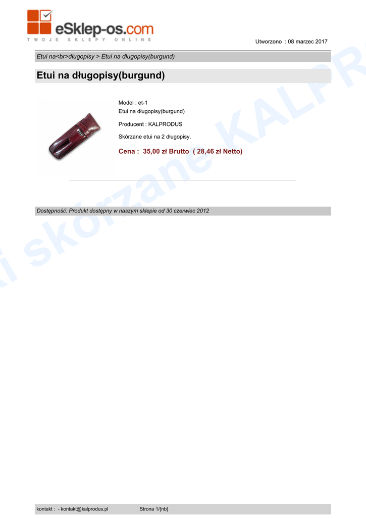 i k Utworzono : 08 marzec 2017 R P Etui na<br>długopisy > Etui na długopisy(burgund) Etui na długopisy(burgund) Model : et-1 Etui na długopisy(burgund) K e Producent : KALPRODUS Skórzane etui na 2 długopisy. Cena : 35,00 zł Brutto ( 28,46 zł Netto) n a z r ó Dostępność: Produkt dostępny w naszym sklepie od 30 czerwiec 2012 k s kontakt : - [email protected] Strona 1/{nb} L A