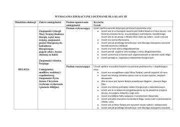 WYMAGANIA EDUKACYJNE I OCENIANIE DLA KLASY III Dziedzina edukacji Zakres umiejętności Poziom opanowania umiejętności Poziom wykraczający Kryteria: Uczeń: Poziom rozszerzający Uczeń spełnia wszystkie kryteria na poziom podstawowy i dopełniający oraz: Znajomości Liturgii Mszy Świętej (budowa liturgii, części mszy świętej, znajomości postaw liturgicznych, kalendarza liturgicznego, pojęcie ofiary Jezusa złożonej za ludzi) Uczeń spełnia warunki dotyczące poniższych poziomów oraz: Uczeń wie że w Ewangelii zawarta jest Dobra Nowina o Panu Jezusie i zna historię uciszenia burzy, zna perykopę o uzdrowieniu niewidomego, Uczeń wie że Jan pisząc o Słowie które stało się ciałem , pisał o Jezusie Uczeń zna scenę ofiarowania. Uczeń wie jak przebiega konsekracja i wie dlaczego okazujemy szacunek konsekrowanemu chlebowi Uczeń zna treść ośmiu błogosławieństw Uczeń potrafi wyjaśnić sens każdego z ośmiu błogosławieństw. Uczeń uczestniczy w konkursach organizowanych w zakresie nauki religii. Uczeń pomaga w organizacji nabożeństw liturgicznych. Znajomości różańca Świętego RELIGIA Umiejętności modlitwy osobistej i wspólnotowej. Znajomości Życia Jezusa Chrystusa (wybrane wydarzenia i postacie biblijne) Uczeń zna szczegółowo części Mszy Świętej i potrafi wyjaśnić ich sens Uczeń ma intuicję istnienia czyśca i wie co to jest czyściec, świętych obcowanie. Wie że Jezus jest Synem Bożym prawdziwym Bogiem , równym Bogu Ojcu. Uczeń zna różnicę pomiędzy rokiem liturgicznym a kalendarzowym . Uczeń wie że w adwencie przygotowujemy się na powtórne przyjście Jezusa, zna pojęcie Adwentu i jego sens. Uczeń zna biblijne fakty związane z narodzeniem Zbawiciela. Uczeń wie jakie znaczenie ma działanie Boga i pracy ludzi w powstawaniu chleba i wina Uczeń wie ze Masz Święta jest wyrazem naszej radości i wdzięczności Uczeń wie jak przebiega konsekracja i wie dlaczego okazujemy szacunek konsekrowanemu chlebowi Uczeń wie ze Masz Święta jest wyrazem naszej radości i wdzięczności Uczeń potrafi powiedzieć jaki jest cel Wielkiego Postu Uczeń potrafi opowiedzieć o Ostatniej Wieczerzy i jej związku z Mszą Świętą Uczeń potrafi powiązać ofiarę na krzyżu z ofiarą Mszy Świętej Uczeń potrafi powiedzieć co znaczy słowo „Eucharystia” oraz „hosanna” Uczeń potrafi wymienić i wyjaśnić podstawowe symbole występujące czasie liturgii Triduum Potrafi wyjaśnić czym jest „stół słowa Bożego” i „stół Ciała Pańskiego” . Poziom podstawowy Uczeń spełnia wszystkie kryteria na poziom dopełniający oraz: Uczeń rozumie, że wezwanie Ojcze nasz wyraża naszą wspólnotę Dzieci Bożych Uczeń zna części różańca świętego Uczeń wie skąd wziął się Kościół, Uczeń wie kim jest apostoł i wie ilu było apostołów. Uczeń potrafi powiedzieć jak można zrezygnować z przemocy Uczeń wie, że Bogu zależy na naszym nawróceniu Uczeń wie ze sam Jezus ustanowił eucharystię podczas ostatniej wieczerzy Uczeń wie, że Bogu zależy na naszym nawróceniu Uczeń wie ze sam Jezus ustanowił eucharystię podczas ostatniej wieczerzy Potrafi czynnie uczestniczyć w Modlitwie eucharystycznej Uczeń potrafi odróżnić działanie Ducha świętego od magii Uczeń potrafi czynnie uczestniczyć w przygotowaniu do Komunii Świętej Uczeń potrafi kojarzyć przykazania kościelne z konkretnymi sytuacjami w życiu. Uczeń potrafi powiedzieć dlaczego czcimy Maryję Poziom dopełniający Uczeń wie jak zachować się w czasie poszczególnych części Mszy świętej, potrafi zaprezentować postawy liturgiczne Uczeń wie co znaczy być apostołem pana Jezusa. Uczeń wie że Bóg jest Stwórcą wszechświata Uczeń zna przykazania miłości Boga i bliźniego , oraz zna przypowieść „O miłosiernym Samarytaninie” Uczeń wie ze Jezus swoją naukę przekazał apostołom. Uczeń wie ze Jezus swoją naukę przekazał apostołom. Uczeń zna Ewangelię o pojmaniu i skazaniu na śmierć Jezusa Poziom konieczny Uczeń Wie czym jest Pismo Święte, zna jego podstawowy podział. Uczeń zna siedem sakramentów świętych Uczeń potrafi modlić się na różańcu Uczeń potrafi wyjaśnić do czego służy chleb i wino podczas liturgii. Uczeń potrafi wymienić czterech ewangelistów Brak umiejętności Uczeń nie spełnia warunków potrzebnych do osiągnięcia poziomu koniecznego.
