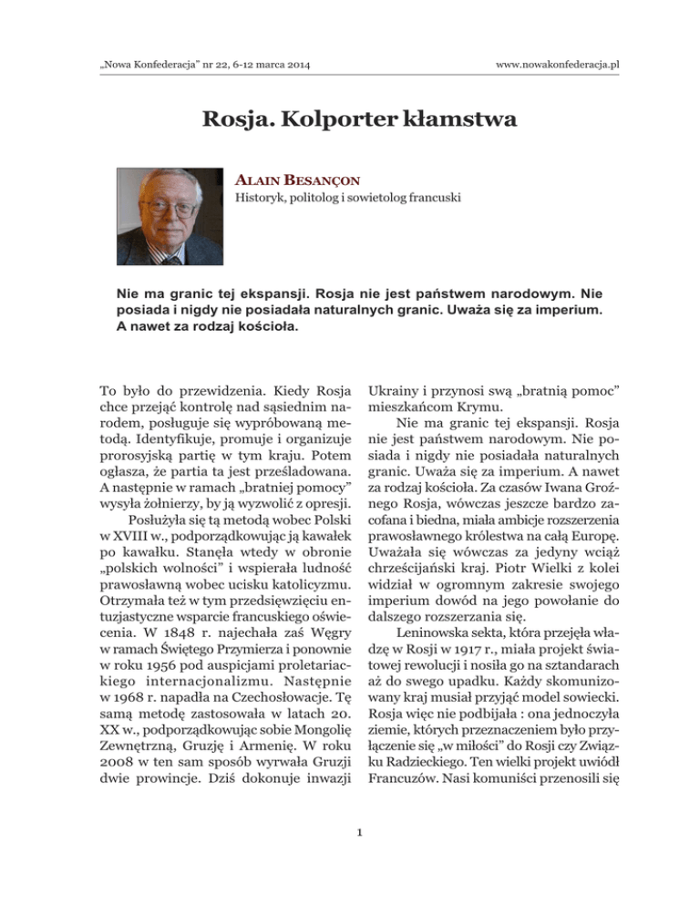„Nowa Konfederacja” nr 22, 6-12 marca 2014 www.nowakonfederacja.pl Rosja. Kolporter kłamstwa AlAin BesAnçon Historyk, politolog i sowietolog francuski Nie ma granic tej ekspansji. Rosja nie jest państwem narodowym. Nie posiada i nigdy nie posiadała naturalnych granic. Uważa się za imperium. A nawet za rodzaj kościoła. To było do przewidzenia. Kiedy Rosja chce przejąć kontrolę nad sąsiednim narodem, posługuje się wypróbowaną metodą. Identyfikuje, promuje i organizuje prorosyjską partię w tym kraju. Potem ogłasza, że partia ta jest prześladowana. A następnie w ramach „bratniej pomocy” wysyła żołnierzy, by ją wyzwolić z opresji. Posłużyła się tą metodą wobec Polski w XVIII w., podporządkowując ją kawałek po kawałku. Stanęła wtedy w obronie „polskich wolności” i wspierała ludność prawosławną wobec ucisku katolicyzmu. Otrzymała też w tym przedsięwzięciu entuzjastyczne wsparcie francuskiego oświecenia. W 1848 r. najechała zaś Węgry w ramach Świętego Przymierza i ponownie w roku 1956 pod auspicjami proletariackiego internacjonalizmu. Następnie w 1968 r. napadła na Czechosłowacje. Tę samą metodę zastosowała w latach 20. XX w., podporządkowując sobie Mongolię Zewnętrzną, Gruzję i Armenię. W roku 2008 w ten sam sposób wyrwała Gruzji dwie prowincje. Dziś dokonuje inwazji Ukrainy i przynosi swą „bratnią pomoc” mieszkańcom Krymu. Nie ma granic tej ekspansji. Rosja nie jest państwem narodowym. Nie posiada i nigdy nie posiadała naturalnych granic. Uważa się za imperium. A nawet za rodzaj kościoła. Za czasów Iwana Groźnego Rosja, wówczas jeszcze bardzo zacofana i biedna, miała ambicje rozszerzenia prawosławnego królestwa na całą Europę. Uważała się wówczas za jedyny wciąż chrześcijański kraj. Piotr Wielki z kolei widział w ogromnym zakresie swojego imperium dowód na jego powołanie do dalszego rozszerzania się. Leninowska sekta, która przejęła władzę w Rosji w 1917 r., miała projekt światowej rewolucji i nosiła go na sztandarach aż do swego upadku. Każdy skomunizowany kraj musiał przyjąć model sowiecki. Rosja więc nie podbijała : ona jednoczyła ziemie, których przeznaczeniem było przyłączenie się „w miłości” do Rosji czy Związku Radzieckiego. Ten wielki projekt uwiódł Francuzów. Nasi komuniści przenosili się 1 „Nowa Konfederacja” nr 22, 6-12 marca 2014 www.nowakonfederacja.pl duchowo do „kraju rad” i naśladowali je w swym życiu publicznym i prywatnym. Dziś ślepota wobec tego, czym jest Rosja, wydaje się przenosić do szeregów prawicy. Skąd ta miłość do miłości po rosyjsku? Nasz wielki historyk Julien Michelet tak pisał w 1853 r. o Rosji i rosyjskiej propagandzie : „Rosja w swej naturze, w swoim charakterze, jest kłamstwem, jej polityka zewnętrzna i jej broń przeciwko Europie to kłamstwo”. My wierzymy jednak w to kłamstwo, bo niesie ono ze sobą uniwersalny przekaz religijny, czasem chrześcijański, czasem świecki, ale zawsze religijny. I znów Michelet : „Wczoraj jeszcze nam mówiła : jestem chrześcijaństwem, jutro nam powie : jestem socjalizmem”. Tak właśnie powiedziała, między Rosja nie podbijała: ona jednoczyła ziemie, których przeznaczeniem było przyłączenie się „w miłości” do Rosji czy Związku Radzieckiego rokiem 1917 a 1989. Dziś znów na przód wysuwa kopuły i krzyże. Zawsze domaga się od nas, byśmy ją kochali. Francja także ma „rosyjską partię” gotową usprawiedliwiać zachowanie – bez względu na to, jakie ono by było – tej drugiej, dziwnej duchowej ojczyzny. 2