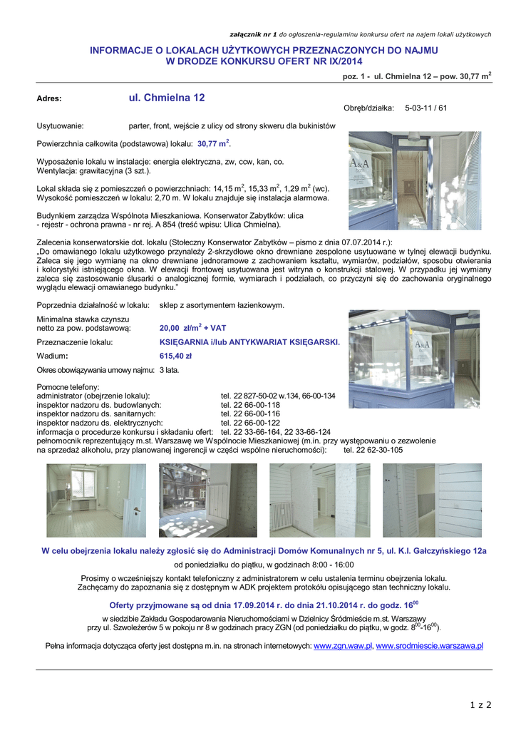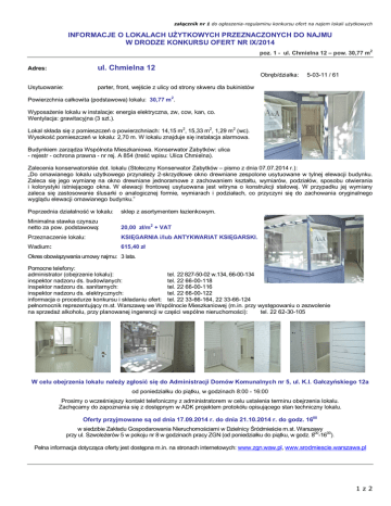 załącznik nr 1 do ogłoszenia-regulaminu konkursu ofert na najem lokali użytkowych INFORMACJE O LOKALACH UŻYTKOWYCH PRZEZNACZONYCH DO NAJMU W DRODZE KONKURSU OFERT NR IX/2014 poz. 1 - ul. Chmielna 12 – pow. 30,77 m 2 ul. Chmielna 12 Adres: Obręb/działka: Usytuowanie: 5-03-11 / 61 parter, front, wejście z ulicy od strony skweru dla bukinistów 2 Powierzchnia całkowita (podstawowa) lokalu: 30,77 m . Wyposażenie lokalu w instalacje: energia elektryczna, zw, ccw, kan, co. Wentylacja: grawitacyjna (3 szt.). 2 2 2 Lokal składa się z pomieszczeń o powierzchniach: 14,15 m , 15,33 m , 1,29 m (wc). Wysokość pomieszczeń w lokalu: 2,70 m. W lokalu znajduje się instalacja alarmowa. Budynkiem zarządza Wspólnota Mieszkaniowa. Konserwator Zabytków: ulica - rejestr - ochrona prawna - nr rej. A 854 (treść wpisu: Ulica Chmielna). Zalecenia konserwatorskie dot. lokalu (Stołeczny Konserwator Zabytków – pismo z dnia 07.07.2014 r.): „Do omawianego lokalu użytkowego przynależy 2-skrzydłowe okno drewniane zespolone usytuowane w tylnej elewacji budynku. Zaleca się jego wymianę na okno drewniane jednoramowe z zachowaniem kształtu, wymiarów, podziałów, sposobu otwierania i kolorystyki istniejącego okna. W elewacji frontowej usytuowana jest witryna o konstrukcji stalowej. W przypadku jej wymiany zaleca się zastosowanie ślusarki o analogicznej formie, wymiarach i podziałach, co przyczyni się do zachowania oryginalnego wyglądu elewacji omawianego budynku.” Poprzednia działalność w lokalu: sklep z asortymentem łazienkowym. Minimalna stawka czynszu netto za pow. podstawową: 20,00 zł/m + VAT Przeznaczenie lokalu: KSIĘGARNIA i/lub ANTYKWARIAT KSIĘGARSKI. Wadium: 615,40 zł 2 Okres obowiązywania umowy najmu: 3 lata. Pomocne telefony: administrator (obejrzenie lokalu): tel. 22 827-50-02 w.134, 66-00-134 inspektor nadzoru ds. budowlanych: tel. 22 66-00-118 inspektor nadzoru ds. sanitarnych: tel. 22 66-00-116 inspektor nadzoru ds. elektrycznych: tel. 22 66-00-122 informacja o procedurze konkursu i składaniu ofert: tel. 22 33-66-164, 22 33-66-124 pełnomocnik reprezentujący m.st. Warszawę we Wspólnocie Mieszkaniowej (m.in. przy występowaniu o zezwolenie na sprzedaż alkoholu, przy planowanej ingerencji w części wspólne nieruchomości): tel. 22 62-30-105 W celu obejrzenia lokalu należy zgłosić się do Administracji Domów Komunalnych nr 5, ul. K.I. Gałczyńskiego 12a od poniedziałku do piątku, w godzinach 8:00 - 16:00 Prosimy o wcześniejszy kontakt telefoniczny z administratorem w celu ustalenia terminu obejrzenia lokalu. Zachęcamy do zapoznania się z dostępnym w ADK projektem protokółu opisującego stan techniczny lokalu. Oferty przyjmowane są od dnia 17.09.2014 r. do dnia 21.10.2014 r. do godz. 1600 w siedzibie Zakładu Gospodarowania Nieruchomościami w Dzielnicy Śródmieście m.st. Warszawy 00 00 przy ul. Szwoleżerów 5 w pokoju nr 8 w godzinach pracy ZGN (od poniedziałku do piątku, w godz. 8 -16 ). Pełna informacja dotycząca oferty jest dostępna m.in. na stronach internetowych: www.zgn.waw.pl, www.srodmiescie.warszawa.pl 1z2 załącznik nr 1 do ogłoszenia-regulaminu konkursu ofert na najem lokali użytkowych INFORMACJE O LOKALACH UŻYTKOWYCH PRZEZNACZONYCH DO NAJMU W DRODZE KONKURSU OFERT NR IX/2014 poz. 2 - ul. Złota 11 – pow. 90,54 m Adres: ul. Złota 11 Usytuowanie: parter, piwnica, front, wejście od strony ul. Złotej 2 Obręb/działka: 5-03-10 / 59, 63 Wyposażenie lokalu w instalacje: energia elektryczna, co, zw, kan. Wentylacja: grawitacyjna. Powierzchnia całkowita lokalu: 90,54 m 2 2 Powierzchnia podstawowa lokalu: 4,61 m 2 Powierzchnia dodatkowa lokalu: 85,93 m Minimalna stawka czynszu netto: - za pow. podstawową: - za pow. dodatkową: 2 1,00 zł/m + VAT 2 1,00 zł/m + VAT Najemca oprócz stawki czynszu będzie pokrywał opłaty niezależne od Wynajmującego (tzw. „opłaty za media”). Zakład Gospodarowania Nieruchomościami w Dzielnicy Śródmieście m.st. Warszawy będzie pokrywał rzeczywiste koszty utrzymania 2 m nieruchomości, w której znajduje się szalet publiczny tj.: zaliczek na fundusz eksploatacyjny i fundusz remontowy oraz kosztów utrzymania jednostki. Lokal składa się z pomieszczeń o powierzchniach: 2 PARTER – 4,61 m , 2 2 2 2 2 2 PIWNICA – 4,88 m , 8,21 m , 2,09 m , 4,17 m , 25,31 m , 3,36 m , 2 2 2 2 2 4,56 m , 8,57 m , 8,12 m , 14,77 m , 1,89 m . Wysokość pomieszczeń w lokalu: od 2,47 m do 3,20 m. Budynkiem zarządza Wspólnota Mieszkaniowa. Poprzednia działalność w lokalu: szalet. Przeznaczenie lokalu: SZALET. Wadium: 90,54 zł Okres obowiązywania umowy najmu: 3 lata ( z możliwością rozwiązania umowy w terminie 30 dni ). Pomocne telefony: administrator (obejrzenie lokalu): tel. 22 66-00-136 inspektor nadzoru ds. budowlanych: tel. 22 66-00-118 inspektor nadzoru ds. sanitarnych: tel. 22 66-00-116 inspektor nadzoru ds. elektrycznych: tel. 22 66-00-122 informacja o procedurze konkursu i składaniu ofert: tel. 22 33-66-164, 22 33-66-124 pełnomocnik reprezentujący m.st. Warszawę we Wspólnocie Mieszkaniowej (m.in. przy występowaniu o zezwolenie na sprzedaż alkoholu, przy planowanej ingerencji w części wspólne nieruchomości): tel. 22 62-30-108 W celu obejrzenia lokalu należy zgłosić się do Administracji Domów Komunalnych nr 5, ul. K.I. Gałczyńskiego 12a od poniedziałku do piątku, w godzinach 8:00 - 16:00 Prosimy o wcześniejszy kontakt telefoniczny z administratorem w celu ustalenia terminu obejrzenia lokalu. Zachęcamy do zapoznania się z dostępnym w ADK projektem protokółu opisującego stan techniczny lokalu. Oferty przyjmowane są od dnia 17.09.2014 r. do dnia 21.10.2014 r. do godz. 1600 w siedzibie Zakładu Gospodarowania Nieruchomościami w Dzielnicy Śródmieście m.st. Warszawy 00 00 przy ul. Szwoleżerów 5 w pokoju nr 8 w godzinach pracy ZGN (od poniedziałku do piątku, w godz. 8 -16 ). Pełna informacja dotycząca oferty jest dostępna m.in. na stronach inter
