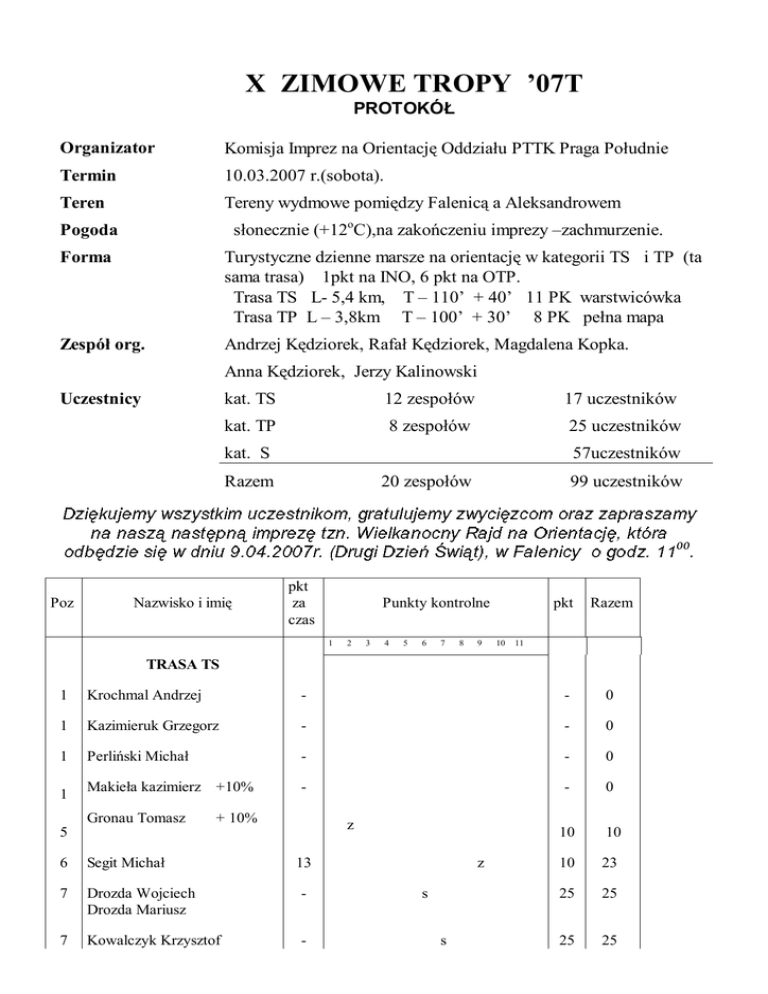X ZIMOWE TROPY ’07T PROTOKÓŁ Organizator Komisja Imprez na Orientację Oddziału PTTK Praga Południe Termin 10.03.2007 r.(sobota). Teren Tereny wydmowe pomiędzy Falenicą a Aleksandrowem słonecznie (+12oC),na zakończeniu imprezy –zachmurzenie. Pogoda Forma Turystyczne dzienne marsze na orientację w kategorii TS i TP (ta sama trasa) 1pkt na INO, 6 pkt na OTP. Trasa TS L- 5,4 km, T – 110’ + 40’ 11 PK warstwicówka Trasa TP L – 3,8km T – 100’ + 30’ 8 PK pełna mapa Zespół org. Andrzej Kędziorek, Rafał Kędziorek, Magdalena Kopka. Anna Kędziorek, Jerzy Kalinowski Uczestnicy kat. TS 12 zespołów 17 uczestników kat. TP 8 zespołów 25 uczestników kat. S 57uczestników Razem Poz Nazwisko i imię 20 zespołów ! " # pkt za czas $ % 99 uczestników & ' 2 3 4 5 6 7 8 9 10 Punkty kontrolne 1 Razem 11 1 Krochmal Andrzej - - 0 1 Kazimieruk Grzegorz - - 0 1 Perliński Michał - - 0 1 Makieła kazimierz +10% - - 0 10 10 10 23 25 25 25 25 Gronau Tomasz + 10% z 6 Segit Michał 13 7 Drozda Wojciech Drozda Mariusz - 7 Kowalczyk Krzysztof - z s s pkt TRASA TS 5 ( ( ) ) 9 Krawędkowska Agata Rosiński Mikołaj Wołowiec Maciej 10 Siwiec Mariusz 11 Błoński Marcin Szabuńko Magdalena 10% 10 s 34 s - s 12 Cudziło Andrzej 250 Alberska Aleksandra LEGENDA potwierdzony PK właściwy s potwierdzony PK stowarzyszony (-25) z zmiana PK (-10) brak PK (-90) pkt Poz Nazwisko i imię za czas 1 TRASA TP 25 35 35 69 s s z 85 85 s 25 275 z Punkty kontrolne 2 3 4 5 6 7 8 9 10 11 pkt Razem 12 1 Ślimaczki Wrzosek Agata Wrzosek Zbigniew 18 0 0 0 0 - 18 2 Żbiki Wrzosek Bożena Wrzosek Marta Wrzosek Krystyna 24 0 0 0 0 - 24 3 Rzadki Ryszard Tomczysyn Edyta Ignatowicz Maciej Kusowski Lukasz - s 0 0 0 0 25 25 Błękitni Kurek Olga Kurek Alicja - z z z 0 0 0 0 30 30 0 0 0 0 35 60 4 5 Arendt Julia Sztajnykier Ida Sztajnykier Zbigniew 25 s z 5 Vista Ziółkowski Bogdan 30 z z z 0 0 0 0 30 60 7 SP 336 Jagiełło Paweł Koranda Daniel Karkoszka Adam ,Tanchul U Orliński Marek, Lesiczka Kuba 100 z z z 0 0 0 0 30 100 8 SP 336 Pietrzak Magda, Zielińska Beata Łozińska Agnieszka Palada Karolina Kowalczyk Ania 130 - - - - - 0 0 0 0 450 580