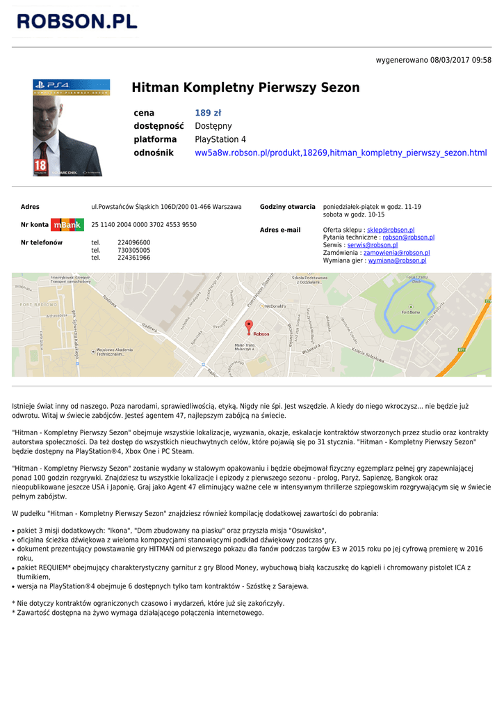 wygenerowano 08/03/2017 09:58 Hitman Kompletny Pierwszy Sezon cena 189 zł dostępność Dostępny platforma PlayStation 4 odnośnik ww5a8w.robson.pl/produkt,18269,hitman_kompletny_pierwszy_sezon.html Adres ul.Powstańców Śląskich 106D/200 01-466 Warszawa Nr konta 25 1140 2004 0000 3702 4553 9550 Nr telefonów tel. 224096600 tel. 730305005 tel. 224361966 Godziny otwarcia poniedziałek-piątek w godz. 11-19 sobota w godz. 10-15 Adres e-mail Oferta sklepu : [email protected] Pytania techniczne : [email protected] Serwis : [email protected] Zamówienia : [email protected] Wymiana gier : [email protected] Istnieje świat inny od naszego. Poza narodami, sprawiedliwością, etyką. Nigdy nie śpi. Jest wszędzie. A kiedy do niego wkroczysz... nie będzie już odwrotu. Witaj w świecie zabójców. Jesteś agentem 47, najlepszym zabójcą na świecie. "Hitman - Kompletny Pierwszy Sezon" obejmuje wszystkie lokalizacje, wyzwania, okazje, eskalacje kontraktów stworzonych przez studio oraz kontrakty autorstwa społeczności. Da też dostęp do wszystkich nieuchwytnych celów, które pojawią się po 31 stycznia. "Hitman - Kompletny Pierwszy Sezon" będzie dostępny na PlayStation®4, Xbox One i PC Steam. "Hitman - Kompletny Pierwszy Sezon" zostanie wydany w stalowym opakowaniu i będzie obejmował fizyczny egzemplarz pełnej gry zapewniającej ponad 100 godzin rozgrywki. Znajdziesz tu wszystkie lokalizacje i epizody z pierwszego sezonu - prolog, Paryż, Sapienzę, Bangkok oraz nieopublikowane jeszcze USA i Japonię. Graj jako Agent 47 eliminujący ważne cele w intensywnym thrillerze szpiegowskim rozgrywającym się w świecie pełnym zabójstw. W pudełku "Hitman - Kompletny Pierwszy Sezon" znajdziesz również kompilację dodatkowej zawartości do pobrania: ● ● ● ● ● pakiet 3 misji dodatkowych: "Ikona", "Dom zbudowany na piasku" oraz przyszła misja "Osuwisko", oficjalna ścieżka dźwiękowa z wieloma kompozycjami stanowiącymi podkład dźwiękowy podczas gry, dokument prezentujący powstawanie gry HITMAN od pierwszego pokazu dla fanów podczas targów E3 w 2015 roku po jej cyfrową premierę w 2016 roku, pakiet REQUIEM* obejmujący charakterystyczny garnitur z gry Blood Money, wybuchową białą kaczuszkę do kąpieli i chromowany pistolet ICA z tłumikiem, wersja na PlayStation®4 obejmuje 6 dostępnych tylko tam kontraktów - Szóstkę z Sarajewa. * Nie dotyczy kontraktów ograniczonych czasowo i wydarzeń, które już się zakończyły. * Zawartość dostępna na żywo wymaga działającego połączenia internetowego.