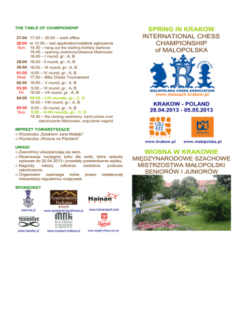 THE TABLE OF CHAMPIONSHIP 27.04 17.00 – 20.00 – work office 28.04 to 12.00 – last application/ostatnie zgłoszenia Sun. 14.30 – hang out the starting list/listy startowe 15.45 – opening ceremony/otwarcie Mistrzostw 16.00 – I round, gr.: A, B 29.04 16.00 - II round, gr.: A, B 30.04 16.00 – III round, gr.: A, B 01.05 9.00 – IV round, gr.: A, B Wed. 17.00 – Blitz Chess Tournament 02.05 16.00 – V round, gr.: A, B 03.05 9.00 – VI round, gr.: A, B Fri. 16.00 – VII round, gr.: A, B 04.05 09.00 – I-IV rounds, gr.: C, D 16.00 – VIII round, gr.: A, B 05.05 9.00 – IX round, gr.: A, B Sun. 9.00 – V-VII rounds, gr.: C, D 14.30 – the closing ceremony, hand prizes over zakończenie Mistrzostw, wręczenie nagród IMPREZY TOWARZYSZĄCE • Wycieczka „Szlakiem Jana Matejki” • Wycieczka „Wiosna na Plantach” SPRING IN KRAKOW INTERNATIONAL CHESS CHAMPIONSHIP of MALOPOLSKA www.mzszach.krakow.pl KRAKOW - POLAND 28.04.2013 - 05.05.2013 www.krakow.pl UWAGI • Zawodnicy ubezpieczają się sami. • Rezerwacja noclegów tylko dla osób, które opłaciły wpisowe do 20.04.2013 i przesłały potwierdzenie wpłaty. • Nagrody należy odbierać osobiście podczas zakończenia. • Organizator zastrzega sobie prawo ostatecznej interpretacji regulaminu rozgrywek. SPONSORZY 1 www.he.pl Szczyrk www.apartamentyparkowe.pl www.hainansport.com www.transfer.pl www.muzeum.krakow.pl www.wegiel-chess.com.pl www.malopolska.pl WIOSNA W KRAKOWIE MIĘDZYNARODOWE SZACHOWE MISTRZOSTWA MAŁOPOLSKI SENIORÓW I JUNIORÓW ORGANIZATORZY Małopolski Związek Szachowy Urząd Miasta Krakowa Urząd Marszałkowski Województwa Małopolskiego ORGANIZER The Malopolska Chess Association The Mayor of Krakow The Marshal Office of the Malopolska Region TERMIN 28.04.2013 – 05.05.2013 DATE 28.04.2013 – 05.05.2013 MIEJSCE GRY I BIURO MISTRZOSTW Hotel Europejski, Kraków, ul. Lubicz 5 czynne od godz. 17.00, 27.04.2013 PLACE OF GAME & OFFICE OF CHAMPIONSHIP Poland, Krakow, 5 Lubicz Str., Europejski Hotel open from 17.00, 27.04.2013 SYSTEM ROZGRYWEK System szwajcarski; IX rund gr. A, B; VII rund gr. C, D Spóźnienie 15 minut. Aktualne przepisy FIDE. GAME SYSTEM Swiss system; IX rounds gr. A, B; VII gr. C, D. A fifteen-minute delay permitted. ZAKWATEROWANIE Hotel Europejski, ul. Lubicz 5 1-osobowy z łazienką i śniadaniem 260 zł/dzień 2-osobowy z łazienką i śniadaniem 360 zł/dzień Hotel Optima, ul. Malborska 65 1-osobowy pokój z łazienką i śniadaniem 90 zł/dzień 2-osobowy pokój z łazienką i śniadaniem 150 zł/dzień 3-osobowy z łazienką i śniadaniem195 zł/dzień Internat ZSE nr 1, ul. Kamieńskiego 49 pokój 3-osobowy bez łazienki 90 zł/dzień pokój 3-osobowy z łazienką 120 zł/dzień ACCOMMODATION Europejski Hotel, 5 Lubicz Str. 1-person room with breakfast; price 260 zl/day 2-person room with breakfast; price 360 zl/day Optima Hotel, 65 Malborska Str. 1-person room with breakfast; price 90 zl/day 2-person room with breakfast; price 150 zl/day 3-person room with breakfast; price 195 zl/day Boarding school, 49 Kamienskiego Str. 3-person room without bath 90 zl/day 3-person room with bath 120 zl/day ZGŁOSZENIA I INFORMACJA APPLICATIONS & INFORMATION CALL Zgłoszenia do dnia 20.04.2013 (nazwisko i imię, Deadline 20.04.2013 (surname, name, ranking, kategoria, ranking, data urodzenia: dzień-miesiąc-rok, date of birth: day-month-year, country, information klub, informacja dotycząca zakwaterowania): about accommodation and board) • tel./fax. (+48)12-411-48-01; 607-059-125 • by phone/fax (+48)12-411-48-01 • e-mail:[email protected] • by e-mail:[email protected] WPISOWE należy wpłacać na konto: EXCURSIONS Małopolski Związek Szachowy PKO BP S.A. Matejko’s route in Krakow Planty Garden I/O Kraków 63 1020 2892 0000 5902 0141 1297 GRUPY TURNIEJOWE TOURNAMENT GROUPS Group Pace of Fee Participants Awards minus tax (PLN) Nagrody brutto (PLN) Grupa game (PLN) Rating ELO 40 A I II III IV V VI >2400 moves/1,5h 2400-2200 80 PLN 1500 1000 750 600 500 350 + 0,5h + 2199-2000 100 PLN 300 250 200 until ELO 2000 / do ELO 2000 30sec. 1999-1800 120 PLN 300 woman / kobieta increments <1800 150 PLN from one no ELO 200 PLN move B I II III IV V VI 2 h / one >2000 400 PLN person 2000-1800 200 PLN 750 600 500 450 300 250 <1800 100 PLN 200 until ELO 1600 / do ELO 1600 no ELO 100 PLN 200 woman / kobieta C I II III IV V VI 1 h / one U13 40 PLN prizes in kind / nagrody rzeczowe person 250 150 100 D I II III IV V VI 1 h / one U10 40 PLN prizes in kind / nagrody rzeczowe person 250 150 100 Grupy A, B są klasyfikowane do FIDE. The Groups A, B are classified in the FIDE Chess ratings.