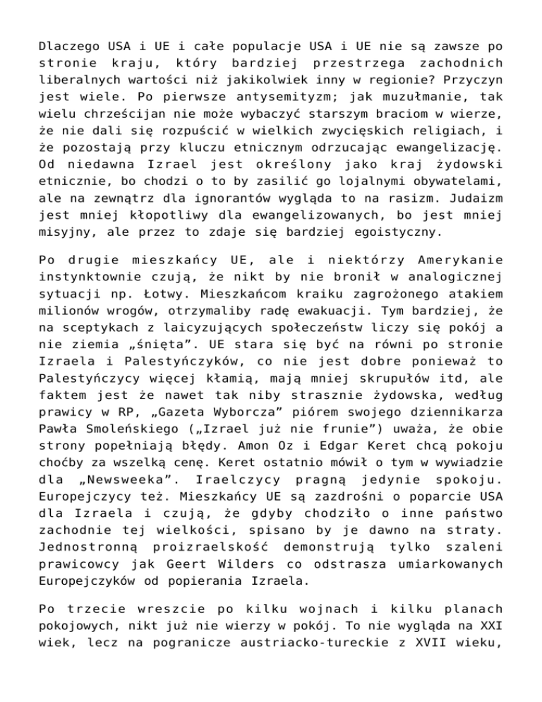 Dlaczego USA i UE i całe populacje USA i UE nie są zawsze po stronie kraju, który bardziej przestrzega zachodnich liberalnych wartości niż jakikolwiek inny w regionie? Przyczyn jest wiele. Po pierwsze antysemityzm; jak muzułmanie, tak wielu chrześcijan nie może wybaczyć starszym braciom w wierze, że nie dali się rozpuścić w wielkich zwycięskich religiach, i że pozostają przy kluczu etnicznym odrzucając ewangelizację. Od niedawna Izrael jest określony jako kraj żydowski etnicznie, bo chodzi o to by zasilić go lojalnymi obywatelami, ale na zewnątrz dla ignorantów wygląda to na rasizm. Judaizm jest mniej kłopotliwy dla ewangelizowanych, bo jest mniej misyjny, ale przez to zdaje się bardziej egoistyczny. Po drugie mieszkańcy UE, ale i niektórzy Amerykanie instynktownie czują, że nikt by nie bronił w analogicznej sytuacji np. Łotwy. Mieszkańcom kraiku zagrożonego atakiem milionów wrogów, otrzymaliby radę ewakuacji. Tym bardziej, że na sceptykach z laicyzujących społeczeństw liczy się pokój a nie ziemia „śnięta”. UE stara się być na równi po stronie Izraela i Palestyńczyków, co nie jest dobre ponieważ to Palestyńczycy więcej kłamią, mają mniej skrupułów itd, ale faktem jest że nawet tak niby strasznie żydowska, według prawicy w RP, „Gazeta Wyborcza” piórem swojego dziennikarza Pawła Smoleńskiego („Izrael już nie frunie”) uważa, że obie strony popełniają błędy. Amon Oz i Edgar Keret chcą pokoju choćby za wszelką cenę. Keret ostatnio mówił o tym w wywiadzie dla „Newsweeka”. Iraelczycy pragną jedynie spokoju. Europejczycy też. Mieszkańcy UE są zazdrośni o poparcie USA dla Izraela i czują, że gdyby chodziło o inne państwo zachodnie tej wielkości, spisano by je dawno na straty. Jednostronną proizraelskość demonstrują tylko szaleni prawicowcy jak Geert Wilders co odstrasza umiarkowanych Europejczyków od popierania Izraela. Po trzecie wreszcie po kilku wojnach i kilku planach pokojowych, nikt już nie wierzy w pokój. To nie wygląda na XXI wiek, lecz na pogranicze austriacko-tureckie z XVII wieku, niby spokojne, ale… Żeby chociaż zaczynało wyglądać jak pogranicze austriacko-tureckie z XVIII wieku… Izrael prawicowy „Likudowy” chciałby mieć i zielone światło na zwalczanie Hamasu i poparcie Zachodu, a zwłaszcza USA, niestety elektorat DP już ma dość wspierania Izraela, administracja Obamy uważa Netanjahu i lobby żydowskie w Waszyngtonie za utrapienie. Stąd szef izraelskiego rządu spotyka się z kongresmenami GOP za plecami Obamy. Ale baptyści będą w USA słabnąć. Wspólny miraż dostępu do „ziemi świętej” może się wyczerpać. Religijna prawica chce czasem poprawiać Żydów, mając nadzieję, że zostaną oni chrześcijanami, wsprost mówiła o tym m.in. Ann Coulter. Żydzi w USA nie byli specjalnie oburzeni, nawet żydowski redaktor, który robił z nią wywiad na ten temat. „Żydzie wróć” słychać w UE i Polsce obok sloganów: „żydami do gazu”, antysemityzm i filozsemityzm zawsze istniały obok siebie. Po prostu judaizm wzbudza wiele emocji. Poza tym Zachód nie łapie się w tym czemu to jest państwo na „ziemi świętej” zbudowane przez ateistów z Ben Gurionowej lewicy? A potem nie chcą tam opuszczać spornych osiedli ze względów religijnych. Zachód nie wie kim właściwie są Żydzi i uważa ich za nieprzewidywalnych, to zwykle jest przyczyną niechęci. To państwo laickie czy religijne? USA jest państwem laickim, interpretowanym przez niektórych GOP-owców jako boskie, a tu? Pojawiają się tam i znikają busy dla ortodoksów, i od niedawna średniowieczni pejsowcy muszą służyć w armii, który to nakaz próbują znieść. Żydzi są narodem, który nie jest ani narodem kulturowym jak np. UK, czy Polska, anie narodem stworzonym wokół idei jak USA, Kanada, Australia czy po trosze Francja. Stąd brak zrozumienia, i niezdecydowanie polityków. Państwa Europy południowej jak Francja i Włochy zwykle, z powodu bliskości świata islamu jest mniej proizraelska niż Północ, która raczej zapatrzona jest w postawę Amerykanów, lub wciąż przeżywa swe winy z WWII (Niemcy, Holandia), lub szczyci się pomocą Żydom podczas WWII (Dania, Norwegia). Jeszcze inaczej patrzą pacyfiści tacy jak Szwedzi i Finowie. UE ma jednak poważniejsze problemy niż Izrael, w końcu ma przed sobą Rosję, stąd optyka europejska jest inna niż amerykańska. Nie sądzę by „brunatna fala” bardzo rosła, myślę, że raczej rozwój mediów i pogoń za każdym spędem idiotów wykrzykujących: „Żydzi do gazu” ujawnił rozmiary niechęci do Izraela. Poza tym Izrael przywodzi na myśl kolonializm, którego nienawidzić przez dekady uczyli marksiści i Amerykanie, choć jak słusznie zauważył Dinesh D’Souza jest też sporo argumentów za kolonializmem. Jeśli do tego dołączymy twardszą postawę Bibi N i Likudu wobec Arabów, niechęć zamienia się w sprzeciw. UE nie rozumie żadnej innej postawy niż postawa Kereta, w kontekście sytuacji w jakiej jest Izrael. Stąd niechęć do Izraela. Palestyńscy Arabowie to fanatycy, mają własny kraj – Jordanię, a mimo to chcą więcej. Nigdy nie zmienią zdania. Odkąd Hamas przejął stery będzie tylko gorzej. Można by oczywiście skolonizować na nowo te rejony i chwycić terrorystów za pysk, ale kto to poprze? Być może więc kiedyś wszyscy Żydzi będą mieli dość zastanawiania się czy autobus dziś wybuchnie czy nie i przeniosą się tam, skąd według kawału żydowskiego mądry Żyd dzwoni do głupiego” – do Nowego Jorku. Tam będą bezpieczni i już jest ich tam prawie tylu co w Izraelu. W USA w gąszczu protestanckich sekt są tolerowani i lepiej widziani niż gdziekolwiek indziej na świecie. Oczywiście każdy zrobi co zechce, ale moja rada jako raczej filosemity i miłośnika Spinozy, Mahlera, Berlina i Mendelssohna jest taka.