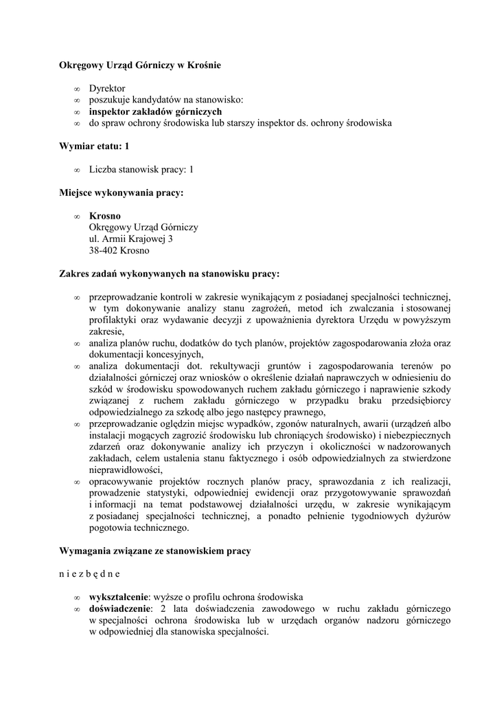 Ogłoszenie inspektor lub starszy inspektor zakładów górniczych ds