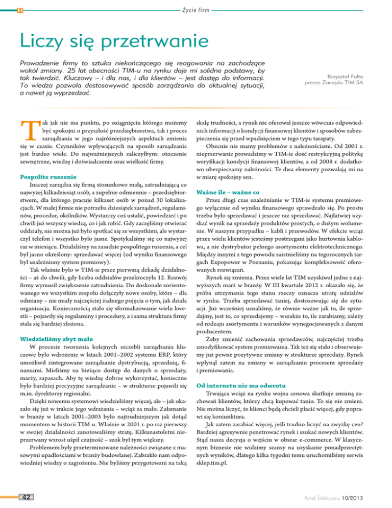 Życie firm Liczy się przetrwanie Prowadzenie firmy to sztuka niekończącego się reagowania na zachodzące wokół zmiany. 25 lat obecności TIM-u na rynku daje mi solidne podstawy, by tak twierdzić. Kluczowy – i dla nas, i dla klientów – jest dostęp do informacji. To wiedza pozwala dostosowywać sposób zarządzania do aktualnej sytuacji, a nawet ją wyprzedzać. T ak jak nie ma punktu, po osiągnięciu którego możemy być spokojni o przyszłość przedsiębiorstwa, tak i proces zarządzania w jego najróżniejszych aspektach zmienia się w czasie. Czynników wpływających na sposób zarządzania jest bardzo wiele. Do najważniejszych zaliczyłbym: otoczenie zewnętrzne, wiedzę i doświadczenie oraz wielkość firmy. Pospolite ruszenie Inaczej zarządza się firmą stosunkowo małą, zatrudniającą co najwyżej kilkadziesiąt osób, a zupełnie odmiennie – przedsiębiorstwem, dla którego pracuje kilkaset osób w ponad 30 lokalizacjach. W małej firmie nie potrzeba dziesiątek zarządzeń, regulaminów, procedur, okólników. Wystarczy coś ustalić, powiedzieć i po chwili już wszyscy wiedzą, co i jak robić. Gdy zaczęliśmy otwierać oddziały, nie można już było spotkać się ze wszystkimi, ale wystarczył telefon i wszystko było jasne. Spotykaliśmy się co najwyżej raz w miesiącu. Działaliśmy na zasadzie pospolitego ruszenia, a cel był jasno określony: sprzedawać więcej (od wyniku finansowego był uzależniony system premiowy). Tak właśnie było w TIM-ie przez pierwszą dekadę działalności – aż do chwili, gdy liczba oddziałów przekroczyła 12. Rozwój firmy wymusił zwiększenie zatrudnienia. Do doskonale zorientowanego we wszystkim zespołu dołączyły nowe osoby, które – dla odmiany – nie miały najczęściej żadnego pojęcia o tym, jak działa organizacja. Koniecznością stało się sformalizowanie wielu kwestii – pojawiły się regulaminy i procedury, a i sama struktura firmy stała się bardziej złożona. Wiedzieliśmy zbyt mało W procesie tworzenia kolejnych szczebli zarządzania kluczowe było wdrożenie w latach 2001–2002 systemu ERP, który umożliwił zintegrowane zarządzanie dystrybucją, sprzedażą, finansami. Mieliśmy na bieżąco dostęp do danych o sprzedaży, marży, zapasach. Aby tę wiedzę dobrze wykorzystać, konieczne było bardziej precyzyjne zarządzanie – w strukturze pojawili się m.in. dyrektorzy regionalni. Dzięki nowemu systemowi wiedzieliśmy więcej, ale – jak okazało się już w trakcie jego wdrażania – wciąż za mało. Załamanie w branży w latach 2001–2003 było najtrudniejszym jak dotąd momentem w historii TIM-u. Właśnie w 2001 r. po raz pierwszy w swojej działalności zanotowaliśmy stratę. Kilkunastoletni nieprzerwany wzrost uśpił czujność – szok był tym większy. Problemem były przeterminowane należności związane z masowymi upadłościami w branży budowlanej. Zabrakło nam odpowiedniej wiedzy o zagrożeniu. Nie byliśmy przygotowani na taką 42 Krzysztof Folta prezes Zarządu TIM SA skalę trudności, a rynek nie oferował jeszcze wówczas odpowiednich informacji o kondycji finansowej klientów i sposobów zabezpieczenia się przed wpadnięciem w tego typu tarapaty. Obecnie nie mamy problemów z należnościami. Od 2001 r. nieprzerwanie prowadzimy w TIM-ie dość restrykcyjną politykę weryfikacji kondycji finansowej klientów, a od 2008 r. dodatkowo ubezpieczamy należności. Te dwa elementy pozwalają mi na w miarę spokojny sen. Ważne ile – ważne co Przez długi czas uzależnianie w TIM-ie systemu premiowego wyłącznie od wyniku finansowego sprawdzało się. Po prostu trzeba było sprzedawać i jeszcze raz sprzedawać. Najłatwiej uzyskać wynik na sprzedaży produktów prostych, o dużym wolumenie. W naszym przypadku – kabli i przewodów. W efekcie wciąż przez wielu klientów jesteśmy postrzegani jako hurtownia kablowa, a nie dystrybutor pełnego asortymentu elektrotechnicznego. Między innymi z tego powodu zaistnieliśmy na tegorocznych targach Expopower w Poznaniu, pokazując kompleksowość oferowanych rozwiązań. Rynek się zmienia. Przez wiele lat TIM uzyskiwał jedne z najwyższych marż w branży. W III kwartale 2012 r. okazało się, że próba utrzymania tego stanu rzeczy oznacza utratę udziałów w rynku. Trzeba sprzedawać taniej, dostosowując się do sytuacji. Już wcześniej uznaliśmy, że równie ważne jak to, ile sprzedajmy, jest to, co sprzedajemy – wszakże to, ile zarabiamy, zależy od rodzaju asortymentu i warunków wynegocjowanych z danym producentem. Żeby zmienić zachowania sprzedawców, najczęściej trzeba zmodyfikować system premiowania. Tak też się stało i obserwujemy już pewne pozytywne zmiany w strukturze sprzedaży. Rynek wpłynął zatem na zmiany w zarządzaniu procesem sprzedaży i premiowania. Od internetu nie ma odwrotu Trwająca wciąż na rynku wojna cenowa skutkuje zmianą zachowań klientów, którzy chcą kupować tanio. To się nie zmieni. Nie można liczyć, że klienci będą chcieli płacić więcej, gdy poprawi się koniunktura. Jak zatem zarabiać więcej, jeśli trudno liczyć na zwyżkę cen? Bardziej agresywnie penetrować rynek i szukać nowych klientów. Stąd nasza decyzja o wejściu w obszar e-commerce. W klasycznym biznesie nie widzimy szansy na uzyskanie ponadprzeciętnych wyników, dlatego kilka tygodni temu uruchomiliśmy serwis sklep.tim.pl. Rynek Elektryczny 10/2013 Życie firm To propozycja nie tylko dla dotychczasowych klientów B2B, lecz także dla konsumentów, którzy dotąd praktycznie nas nie znali. Zresztą, od internetu nie ma odwrotu – dla najmłodszych klientów prawdziwe życie jest właśnie tam. Trudno oczekiwać, by przeszli na offline, gdzie dotychczas byliśmy. To my musimy się dostosować i pokazać w świecie wirtualnym. Udział handlu internetowego w Polsce w ogólnym wolumenie zakupów wynosi ok. 4 proc., jednak dynamika wzrostu sektora e-commerce na