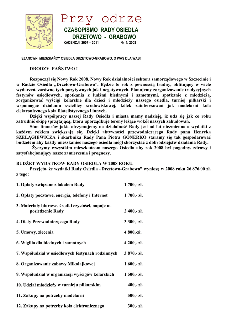 Przy odrze CZASOPISMO RADY OSIEDLA DRZETOWO - GRABOWO KADENCJI 2007 – 2011 Nr 1/ 2008 SZANOWNI MIESZKAŃCY OSIEDLA DRZETOWO-GRABOWO, O WAS DLA WAS! DRODZY PAŃSTWO ! Rozpoczął się Nowy Rok 2008. Nowy Rok działalności sektora samorządowego w Szczecinie i w Radzie Osiedla „Drzetowo-Grabowo”. Będzie to rok z pewnością trudny, obfitujący w wiele wydarzeń, zarówno tych pozytywnych jak i negatywnych. Planujemy zorganizowanie tradycyjnych festynów osiedlowych, spotkania z ludźmi biednymi i samotnymi, spotkanie z młodzieŜą, zorganizować wyścigi kolarskie dla dzieci i młodzieŜy naszego osiedla, turniej piłkarski i wspomagać działaniu świetlicy środowiskowej, kółek zainteresowań jak modelarni koła elektronicznego koła filatelistycznego i innych. Dzięki współpracy naszej Rady Osiedla i miasta mamy nadzieję, iŜ uda się jak co roku zatrudnić ekipę sprzątającą, która uporządkuje tereny leŜące wokół naszych zabudowań. Stan finansów jakie otrzymujemy na działalność Rady jest od lat niezmienna a wydatki z kaŜdym rokiem zwiększają się. Dzięki aktywności przewodniczącego Rady pana Henryka SZELĄGIEWICZA i skarbnika Rady Pana Piotra GONERKO staramy się tak gospodarować budŜetem aby kaŜdy mieszkaniec naszego osiedla mógł skorzystać z dobrodziejstw działania Rady. śyczymy wszystkim mieszkańcom naszego Osiedla aby rok 2008 był pogodny, zdrowy i satysfakcjonujący nasze zamierzenia i prognozy. BUDśET WYDATKÓW RADY OSIEDLA W 2008 ROKU. Przyjęto, Ŝe wydatki Rady Osiedla „Drzetowo-Grabowo” wyniosą w 2008 roku 26 876,00 zł. z tego: 1. Opłaty związane z lokalem Rady 1 700,- zł. 2. Opłaty pocztowe, energia, telefony i Internet 1 700,- zł. 3. Materiały biurowe, środki czystości, napoje na posiedzenie Rady 2 400,- zł. 4. Diety Przewodniczącego Rady 3 300,- zł. 5. Umowy, zlecenia 4 800,-zł. 6. Wigilia dla biednych i samotnych 4 200,- zł. 7. Współudział w osiedlowych festynach rodzinnych 3 870,- zł. 8. Organizowanie zabawy Mikołajkowej 1 600,- zł. 9. Współudział w organizacji wyścigów kolarskich 1 500,- zł. 10. Udział młodzieŜy w turnieju piłkarskim 400,- zł. 11. Zakupy na potrzeby modelarni 500,- zł. 12. Zakupy na potrzeby koła elektronicznego 300,- zł. 13. Zakupy na potrzeby koła filatelistycznego 14. Wydatki na potrzeby świetlicy środowiskowej 15. Wydatki na potrzeby Klubu Seniora 300,- zł. 1 500,- zł. 400,- zł. 16. Wynajem sal w szkołach dla potrzeb mieszkańców 1 500,- zł. 17. Wydawnictwo biuletynu informacyjnego Rady 2 000,- zł. Ponadto z dodatkowych środków Miasta Szczecin otrzymaliśmy 15 000,- zł. na doinwestowanie w plac zabaw dla dzieci na osiedlu Drzetowo – Rugiańska i toru kolarskiego dla BMX. BudŜet został zatwierdzony na posiedzeniu Rady Osiedla w dniu 29 stycznia 2008 roku 8 głosami „za” przy 4 przeciwnych. Z śYCIA RADY OSIEDLA. Rada wydała BIULETYN w ilości 4 000 sztuk, z braku środków na wysyłkę Biuletynu wśród mieszkańców, Radni zostali zobowiązani do rozniesienia Biuletynu po osiedlu w ramach prac społecznych. RYMOWANKA O OSIEDLU DRZETWO (części osiedla „Drzetowo-Grabowo”) W historii juŜ Gallowie pisali te słowo O istnieniu osiedla pod nazwą Drzetowo Po wojnie choć spalona osiedla połowa KaŜdy starał się zamieszkać w okolicy Drzetowa Huta postawiła kilka domów na gotowo By się rozwijało osiedle Drzetowo Spółdzielnia wybudowała kilka domów wzorowo By stoczniowcy mogli zaludnić Drzetowo Przybywało w okolicy rodzin napływowo Coraz więcej mieszkańców na osiedle Drzetowo Ojciec, matka i dzieci z ukochaną teściową Wszyscy chcą zamieszkać na osiedlu Drzetowo Później dzieci namnoŜyło się raz na ludowo które zawładnęło osiedlem Drzetowo Za dziećmi wnuki przyszła gromadka wesoło Przybyła do dziadków na osiedle Drzetowo Jedni jadą na grzyby inni do kościoła Tak zróŜnicowana jest ludność Drzetowa Zima, wiosna i lato pełno szumu w głowie Dla emeryta jak jesień to tylko na Drzetowie Jesień choć chłodna i drzŜysta zawsze kolorowa Umieją się bawić mieszkańcy Drzetowa Co czytam teraz kierując te słowa Do Was moi mili mieszkańcy Drzetowa I na zakończenie ostatnie juŜ słowo Niech Ŝyje i rozkwita osiedle DRZETOWO. Bronisław WINIARSKI Członek Rady Osiedla „D-G”