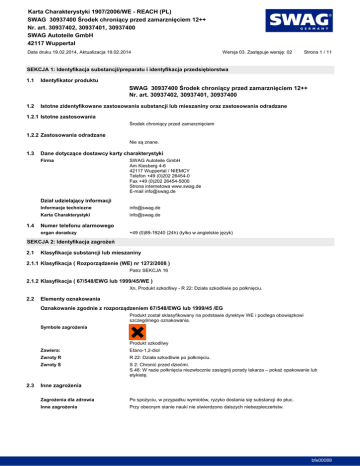 Karta Charakterystyki 1907/2006/WE - REACH (PL) Nr. art. 30937402, 30937401, 30937400 SWAG Autoteile GmbH 42117 Wuppertal Data druku 19.02.2014, Aktualizacja 19.02.2014 1.1 Strona 1 / 11 Identyfikator produktu Nr. art. 30937402, 30937401, 30937400 1.2 Istotne zidentyfikowane zastosowania substancji lub mieszaniny oraz zastosowania odradzane 1.2.1 Istotne zastosowania 1.2.2 Zastosowania odradzane 1.3 1.4 Firma SWAG Autoteile GmbH Am Kiesberg 4-6 42117 Wuppertal / NIEMCY Telefon +49 (0)202 26454-0 Fax +49 (0)202 26454-5000 Strona internetowa www.swag.de E-mail [email protected] Informacje techniczne [email protected] Karta Charakterystyki [email protected] Numer telefonu alarmowego organ doradczy 2.1 Klasyfikacja substancji lub mieszaniny 2.1.1 Patrz SEKCJA 16 2.1.2 Klasyfikacja ( 67/548/EWG lub 1999/45/WE ) 2.2 Elementy oznakowania szczególnego oznakowania. Produkt szkodliwy Zawiera: Etano-1,2-diol Zwroty R Zwroty S 2.3 bfe00089 Karta Charakterystyki 1907/2006/WE - REACH (PL) Nr. art. 30937402, 30937401, 30937400 SWAG Autoteile GmbH 42117 Wuppertal Data druku 19.02.2014, Aktualizacja 19.02.2014 Strona 2 / 11 Produkt typu: 90 - < 100 Etano-1,2-diol CAS: 107-21-1, EINECS/ELINCS: 203-473-3, EU-INDEX: 603-027-00-1, ECB-Nr.: 01-2119456816-28-XXXX GHS/CLP: Acute Tox. 4: H302 - STOT RE 2: H373 EEC: Xn, R 22 <1 (benzothiazol-2-ylthio)acetic acid CAS: 6295-57-4, EINECS/ELINCS: 228-565-0 GHS/CLP: Acute Tox. 4: H302 - Eye Irrit. 2: H319 - Aquatic Chronic 2: H411 EEC: Xn-N, R 22-36-51/53 Lista SVHC (Candidate List of Substances of Very High Concern for authorisation): nie SEKCJA 4: Pierwsza pomoc 4.1 Informacje ogólne oddechowych swobodnego oddychania. Kontakt z oczami 4.2 Skurcze 4.3 poszkodowanym Leczenie objawowe. 5.1 5.2 5.3 bfe00089 Karta Charakterystyki 1907/2006/WE - REACH (PL) Nr. art. 30937402, 30937401, 30937400 SWAG Autoteile GmbH 42117 Wuppertal Data druku 19.02.2014, Aktualizacja 19.02.2014 Strona 3 / 11 6.1 6.2 lub bariery olejowej). 6.3 ziemia okrzemkowa). 6.4 Odniesienia do innych sekcji Patrz SEKCJA 8+13 7.1 przyjmowanie lekarstw. 7.2 7.3 Patrz sekcja 1.2 bfe00089 Karta Charakterystyki 1907/2006/WE - REACH (PL) Nr. art. 30937402, 30937401, 30937400 SWAG Autoteile GmbH 42117 Wuppertal Data druku 19.02.2014, Aktualizacja 19.02.2014 Strona 4 / 11 8.1 granicznych, nad którymi konieczny jest dozór w miejscu pracy (PL) 90 - < 100 Etano-1,2-diol CAS: 107-21-1, EINECS/ELINCS: 203-473-3, EU-INDEX: 603-027-00-1, ECB-Nr.: 01-2119456816-28-XXXX granicznych, nad którymi konieczny jest dozór w miejscu pracy (EU) 90 - < 100 Etano-1,2-diol CAS: 107-21-1, EINECS/ELINCS: 203-473-3, EU-INDEX: 603-027-00-1, ECB-Nr.: 01-2119456816-28-XXXX 8-godzinne: 20 ppm, 52 mg/m³, H Krótkoterminowe (15-minutowego): 40 ppm, 104 mg/m³ DNEL 90 - < 100 Etano-1,2-diol, CAS: 107-21-1 PNEC 90 - < 100 Etano-1,2-diol, CAS: 107-21-1 gleba, 1,53 mg/kg. Woda (morska), 1 mg/l. 8.2 Ochrona oczu Okulary ochronne. kauczuk nitrylowy, >120 min (EN 374). Ochrona skóry Inne Ochrona dróg oddechowych Brak. Ograniczenie i kontrola naturalnego bfe00089 Karta Charakterystyki 1907/2006/WE - REACH (PL) Nr. art. 30937402, 30937401, 30937400 SWAG Autoteile GmbH 42117 Wuppertal Data druku 19.02.2014, Aktualizacja 19.02.2014 Strona 5 / 11 9.1 Stan skupienia ciecz Kolor czerwony-fiolet Zapach charakterystyczny Próg zapachu nieoznaczony ~8 nieoznaczony Temperatura wrzenia [°C] nieoznaczony > 100 > 400 nieoznaczony nieoznaczony Utlenianie brak <0,01 (20°C) ~ 1,13 (20 °C / 68,0 °F) nie dotyczy mieszalny Log Pow -1,34 oktanol/woda] nieoznaczony nieoznaczony do powietrza nieoznaczony 9.2 Temperatura topnienia [°C] nieoznaczony Samozapalenie [°C] nie dotyczy Temperatura rozpadu [°C] nieoznaczony Inne informacje 10.1 10.2 W normalnych warunkach otoczenia (temperatura pokojowa) stabilny. 10.3 Reaguje z kwasami. 10.4 Mocne ogrzewanie. 10.5 Patrz SEKCJA 10.3. 10.6 bfe00089 Karta Charakterystyki 1907/2006/WE - REACH (PL) Nr. art. 30937402, 30937401, 30937400 SWAG Autoteile GmbH 42117 Wuppertal Data druku 19.02.2014, Aktualizacja 19.02.2014 Strona 6 / 11 SEKCJA 11: Informacje toksykologiczne 11.1 90 - < 100 Etano-1,2-diol, CAS: 107-21-1 LD50, skórne, Mysz: > 3500 mg/kg. LD50, ustne, Szczur: 7712 mg/kg. LC50, wdechowe, Szczur: > 2,5 mg/l 6h. LDLo, ustne, Human: ca. 1600 mg/kg. nieoznaczony nieoznaczony nieoznaczony nieoznaczony nieoznaczony nieoznaczony nieoznaczony reprodukcji nieoznaczony Uwagi ogólne SEKCJA 12: Informacje ekologiczne 12.1 90 - < 100 Etano-1,2-diol, CAS: 107-21-1 LC50, (96h), Pimephales promelas: 72860 mg/l. EC50, (96h), Selenastrum capricornutum: 6500 - 13000 mg/l. EC50, (48h), Daphnia magna: > 100 mg/l OECD 202. 12.2 nieoznaczony nieoznaczony Biodegradacja Produkt jest rozkladany biologicznie. 12.3 12.4 12.5 bfe00089 Karta Charakterystyki 1907/2006/WE - REACH (PL) Nr. art. 30937402, 30937401, 30937400 SWAG Autoteile GmbH 42117 Wuppertal Data druku 19.02.2014, Aktualizacja 19.02.2014 Strona 7 / 11 12.6 Brak danych ekologicznych. 13.1 Metody unieszkodliwiania odpadów Produkt Kod substancji odpadowej (zalecany) 160114* Nieoczyszczone opakowania Kod substancji odpadowej (zalecany) 150110* SEKCJA 14: Informacje o transporcie 14.1 Numer UN (numer ONZ) 14.2 Transport morski wg IMDG NOT CLASSIFIED AS "DANGEROUS GOODS" Transport lotniczy wg IATA NOT CLASSIFIED AS "DANGEROUS GOODS" 14.3 14.4 Grupa pakowania 14.5 14.6 14.7 nie dotyczy bfe00089 Karta Charakterystyki 1907/2006/WE - REACH (PL) Nr. art. 30937402, 30937401, 30937400 SWAG Autoteile GmbH 42117 Wuppertal Data druku 19.02.2014, Aktualizacja 19.02.2014 Strona 8 / 11 15.1 mieszaniny EEC-PRZEPISY 1967/548 (1999/45); 1991/689 (2001/118); 1999/13; 2004/42; 648/2004; 1907/2006 (Reach); 1272/2008; 75/324/EWG (2008/47/WE); 453/2010/WE TRANSPORT-PRZEPISY ADR (2013); IMDG-Code (2013, 36. Amdt.); IATA-DGR (2014) PRZEPISY NARODOWE (PL): 1. Ustawa z dnia 25 lutego 2011 r. o substancjach chemicznych i ich mieszaninach (Dz. U. 2. klasyfikacji substancji chemicznych i ich mieszanin (Dz. 