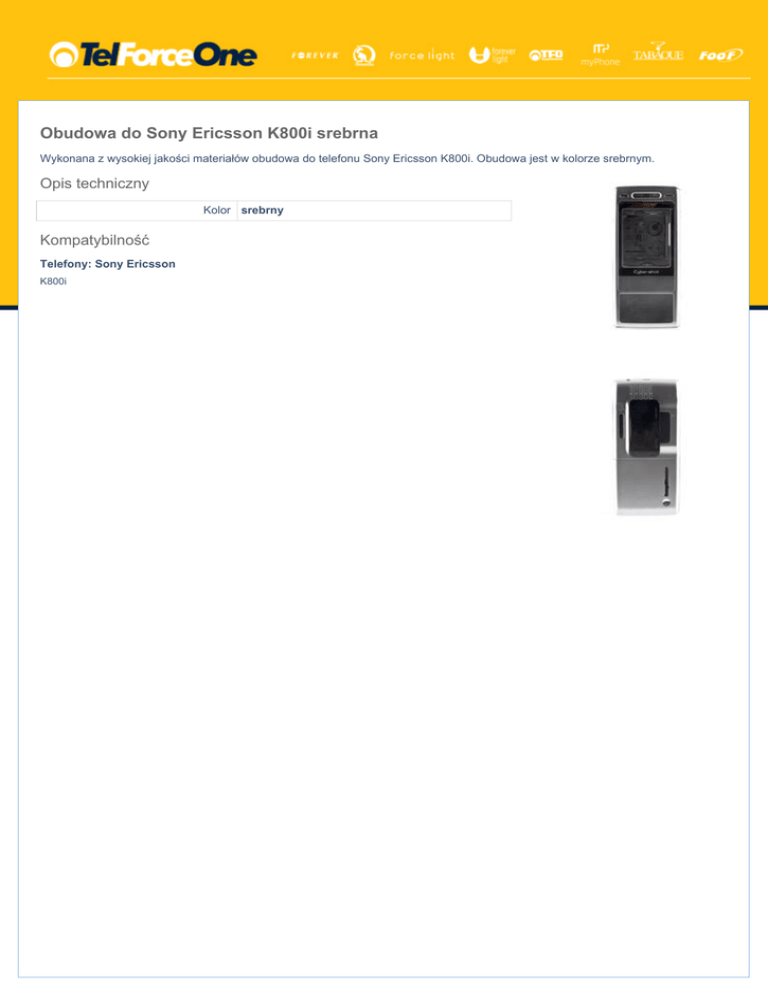 Obudowa do Sony Ericsson K800i srebrna Wykonana z wysokiej jakości materiałów obudowa do telefonu Sony Ericsson K800i. Obudowa jest w kolorze srebrnym. Opis techniczny Kolor srebrny Kompatybilność Telefony: Sony Ericsson K800i