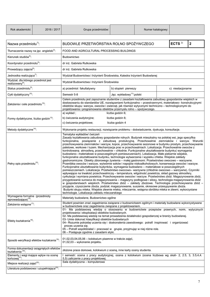 Rok akademicki: Grupa przedmiotów: 2016 / 2017 Numer katalogowy: Nazwa przedmiotu1): BUDOWLE PRZETWÓRSTWA ROLNO SPOŻYWCZEGO Tłumaczenie nazwy na jęz. angielski3): FOOD AND AGRICULTURAL PROCESSING BUILDINGS Kierunek studiów4): Budownictwo 5) Koordynator przedmiotu : 6) dr inż. Gabriela Rutkowska Jednostka realizująca7): Wydział Budownictwa i Inżynierii Środowiska, Katedra Inżynierii Budowlanej Wydział, dla którego przedmiot jest realizowany8): Wydział Budownictwa i Inżynierii Środowiska Status przedmiotu9): a) przedmiot fakultatywny Cykl dydaktyczny : Założenia i cele przedmiotu12): Formy dydaktyczne, liczba godzin13): 2 dr inż. Gabriela Rutkowska Prowadzący zajęcia : 10) ECTS 2) Semestr 5-8 b) stopień pierwszy c) niestacjonarne 11) Jęz. wykładowy :polski Celem przedmiotu jest zapoznanie studentów z zasadami kształtowania zabudowy gospodarstw wiejskich w dostosowaniu do standardów UE, rozwiązaniami funkcjonalno – przestrzennymi, materiałowo– konstrukcyjnymi obiektów skupu: warzyw, owoców i zwierząt, jak również wytycznymi techniczno – technologicznymi do projektowania i programowania obiektów przemysłu rolno – spożywczego. a) wykład ; liczba godzin 6; b) ćwiczenia audytoryjne; liczba godzin 6; c) ćwiczenia projektowe; liczba godzin 4 Metody dydaktyczne14): Wykonanie projektu restauracji, rozwiązanie problemu - doświadczenie, dyskusja, konsultacje. Pełny opis przedmiotu15): Tematyka wykładów/ ćwiczeń Zasady kształtowania zabudowy gospodarstw rolnych. Budynek mieszkalny na polskiej wsi, jego specyfika funkcjonalna, powiązanie z zabudową produkcyjną. Przechowalnie ziemniaków i warzyw. Warunki przechowywania ziemniaków i warzyw, kopce, przechowywanie sezonowe w budynku prostym, przechowywanie paletowe, workowe i luzem. Mechanizacja prac w przechowalniach. Lokalizacja. Przechowalnie owoców z kontrolowaną atmosferą, przechowalnie – chłodnie. Funkcjonalne ukształtowanie budynku( wymagania budowlano– materiałowe w poszczególnych pomieszczeniach). Lokalizacja. Małe piekarnie wiejskie, funkcjonalne ukształtowanie budynku, technologia wytwarzania i wypieku chleba. Wiejskie zakłady gastronomiczne. Obiekty zbiorowego żywienia – małej gastronomi. Przetwórstwo owocowo – warzywne. Przeróbka owoców i warzyw, wytwórnie soków i napojów niskoalkoholowych, konserwacja owoców i warzyw. Funkcjonalne ukształtowanie budynków, wymagania budowlano – materiałowe w poszczególnych pomieszczeniach. Lokalizacja. Przetwórstwo owocowo– warzywne (chłodnie owocowo – warzywne). Czynniki wpływające na trwałość przechowalniczą – temperatura, wilgotność powietrza, skład gazowy atmosfery, cyrkulacja i wymiana powietrza. Przechowywanie owoców i warzyw. Przetwórstwo zbóż. Magazynowanie zbóż, przygotowanie surowca do magazynowania – magazyny podłogowe i silosy, technologia magazynowania zbóż w gospodarstwach wiejskich. Przetwórstwo zbóż – zakłady zbożowe. Technologia przechowywania zbóż – przyjęcie, czyszczenie zboża, podział, magazynowanie, suszenie, okresowe przesypywanie zboża. Budynki skupu mleka. Wiejskie zlewnie mleka, mleczarnie, wstępna obróbka mleka w zlewni, wykorzystane technologie. Lokalizacja zakładu mleczarskiego Wymagania formalne (przedmioty wprowadzające)16): Materiały budowlane, Budownictwo ogólne Założenia wstępne17): Efekty kształcenia18): Sposób weryfikacji efektów kształcenia19): Student powinien znać zagadnienia związane z budownictwem ogólnym i materiały budowlane wykorzystywane w budownictwie oraz zagadnienia związane z projektowaniem. 01- Ma podstawową wiedzę o stosowaniu w budownictwie przepisów prawnych, norm, wytycznych projektowania i eksploatacji obiektów budowlanych. 02- Ma podstawową wiedzę na temat prowadzenia działalności gospodarczej w branży budowlanej. 03- Umie dokonać klasyfikacji obiektów budowlanych 04– Rozumie potrzebę uczenia się i doskonalenia zawodowego: potrafi inspirować i organizować proces uczenia się. 05 – Potrafi współdziałać i pracować w grupie, przyjmując w niej różne role. 06 – Postępuje zgodnie z zasadami etyki. 01,02,03,04,05,06 – kolokwium pisemne w trakcie zajęć, 01,02,03 – wykonanie projektu. Forma dokumentacji osiągniętych efektów złożone prace domowe, kolokwium z oceną, inne karty oceny studenta. kształcenia 20): Elementy i wagi mające wpływ na ocenę I semestr: ocena z pracy audytoryjnej, ocena z kolokwium (ocena liczbowa wg skali- 2, 2.5, 3, 3.5,4,4. końcową21): 5,5) zaliczenie z pracy projektowej. Sala dydaktyczna – komputerowa 22) Miejsce realizacji zajęć : Literatura podstawowa i uzupełniająca23): 7 UWAGI24): 1. Budownictwo ogólne. Materiały i wyroby budowlane . Tom 1, 2007, praca zbiorowa pod kierunkiem Stefańczyka B. Arkady, Warszawa. 2. Lenart J. 1993; Budownictwo wiejskie, SGGW Warszawa 3. Biuletyn Informacyjny Instytutu Przemysłu Zbożowego. 4. Wytyczne technologiczne obiektów przechowalniczych płodów rolnych. BISPROL Warszawa. 5. Wydział Technologii Żywności – biblioteka. 6. Instytut Budownictwa, Mechanizacji i Elektryfikacji Rolnictwa IBMER. 7.Centralna biblioteka Rolnicza, Warszawa. Wskaźniki ilościowe charakteryzujące moduł/przedmiot 25) : Szacunkowa sumaryczna liczba godzin pracy studenta (kontaktowych i pracy własnej) niezbędna dla osiągnięcia zakładanych efektów kształcenia18) - na tej podstawie należy wypełnić pole ECTS2: 30 h Łączna liczba punktów ECTS, którą student uzyskuje na zajęciach wymagających bezpośredniego udziału nauczycieli akademickich: 1 ECTS Łączna liczba punktów ECTS, którą student uzyskuje w ramach zajęć o charakterze praktycznym, takich jak zajęcia laboratoryjne, projektowe, itp.: 1 ECTS Tabela zgodności kierunkowych efektów kształcenia efektami przedmiotu Nr /symbol efektu 01 02 03 26) Wymienione w wierszu efekty kształcenia: Ma wiedzę o najczęściej stosowanych materiałach budow