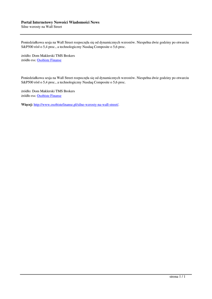 Portal Internetowy Nowości Wiadomości News Silne wzrosty na Wall Street Poniedziałkowa sesja na Wall Street rozpoczęła się od dynamicznych wzrostów. Niespełna dwie godziny po otwarciu S&P500 rósł o 5,4 proc., a technologiczny Nasdaq Composite o 5,6 proc. żródło: Dom Maklerski TMS Brokers żródło rss: Osobiste Finanse Poniedziałkowa sesja na Wall Street rozpoczęła się od dynamicznych wzrostów. Niespełna dwie godziny po otwarciu S&P500 rósł o 5,4 proc., a technologiczny Nasdaq Composite o 5,6 proc. żródło: Dom Maklerski TMS Brokers żródło rss: Osobiste Finanse Więcej: http://www.osobistefinanse.pl/silne-wzrosty-na-wall-street/. strona 1 / 1
