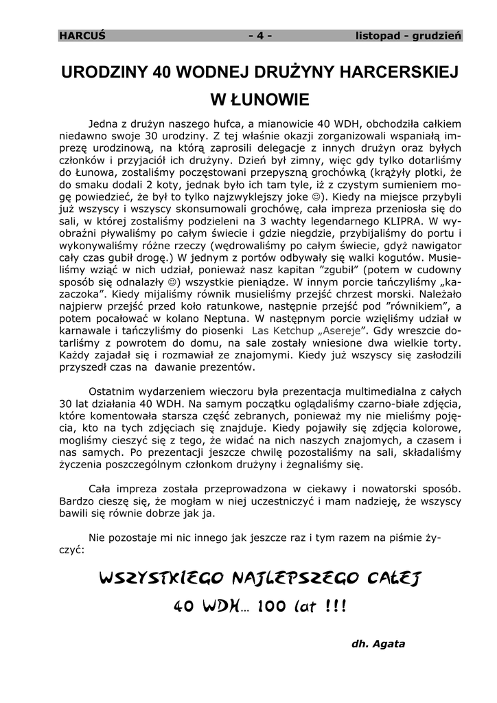 HARCUŚ -4- listopad - grudzień URODZINY 40 WODNEJ DRUśYNY HARCERSKIEJ W ŁUNOWIE Jedna z druŜyn naszego hufca, a mianowicie 40 WDH, obchodziła całkiem niedawno swoje 30 urodziny. Z tej właśnie okazji zorganizowali wspaniałą imprezę urodzinową, na którą zaprosili delegacje z innych druŜyn oraz byłych członków i przyjaciół ich druŜyny. Dzień był zimny, więc gdy tylko dotarliśmy do Łunowa, zostaliśmy poczęstowani przepyszną grochówką (krąŜyły plotki, Ŝe do smaku dodali 2 koty, jednak było ich tam tyle, iŜ z czystym sumieniem mogę powiedzieć, Ŝe był to tylko najzwyklejszy joke ☺). Kiedy na miejsce przybyli juŜ wszyscy i wszyscy skonsumowali grochówę, cała impreza przeniosła się do sali, w której zostaliśmy podzieleni na 3 wachty legendarnego KLIPRA. W wyobraźni pływaliśmy po całym świecie i gdzie niegdzie, przybijaliśmy do portu i wykonywaliśmy róŜne rzeczy (wędrowaliśmy po całym świecie, gdyŜ nawigator cały czas gubił drogę.) W jednym z portów odbywały się walki kogutów. Musieliśmy wziąć w nich udział, poniewaŜ nasz kapitan ”zgubił” (potem w cudowny sposób się odnalazły ☺) wszystkie pieniądze. W innym porcie tańczyliśmy „kazaczoka”. Kiedy mijaliśmy równik musieliśmy przejść chrzest morski. NaleŜało najpierw przejść przed koło ratunkowe, następnie przejść pod ”równikiem”, a potem pocałować w kolano Neptuna. W następnym porcie wzięliśmy udział w karnawale i tańczyliśmy do piosenki Las Ketchup „Asereje”. Gdy wreszcie dotarliśmy z powrotem do domu, na sale zostały wniesione dwa wielkie torty. KaŜdy zajadał się i rozmawiał ze znajomymi. Kiedy juŜ wszyscy się zasłodzili przyszedł czas na dawanie prezentów. Ostatnim wydarzeniem wieczoru była prezentacja multimedialna z całych 30 lat działania 40 WDH. Na samym początku oglądaliśmy czarno-białe zdjęcia, które komentowała starsza część zebranych, poniewaŜ my nie mieliśmy pojęcia, kto na tych zdjęciach się znajduje. Kiedy pojawiły się zdjęcia kolorowe, mogliśmy cieszyć się z tego, Ŝe widać na nich naszych znajomych, a czasem i nas samych. Po prezentacji jeszcze chwilę pozostaliśmy na sali, składaliśmy Ŝyczenia poszczególnym członkom druŜyny i Ŝegnaliśmy się. Cała impreza została przeprowadzona w ciekawy i nowatorski sposób. Bardzo cieszę się, Ŝe mogłam w niej uczestniczyć i mam nadzieję, Ŝe wszyscy bawili się równie dobrze jak ja. Nie pozostaje mi nic innego jak jeszcze raz i tym razem na piśmie Ŝyczyć: WSZYSTKIEGO NAJLEPSZEGO CAŁEJ 40 WDH… WDH 100 lat !!! dh. Agata