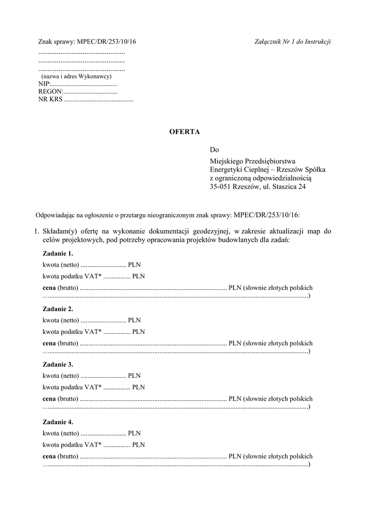 Znak sprawy: MPEC/DR/253/10/16 Załącznik Nr 1 do Instrukcji ............................................... ............................................... ............................................... (nazwa i adres Wykonawcy) NIP:....................................... REGON:................................ NR KRS ......................................... OFERTA Do Miejskiego Przedsiębiorstwa Energetyki Cieplnej – Rzeszów Spółka z ograniczoną odpowiedzialnością 35-051 Rzeszów, ul. Staszica 24 Odpowiadając na ogłoszenie o przetargu nieograniczonym znak sprawy: MPEC/DR/253/10/16: 1. Składam(y) ofertę na wykonanie dokumentacji geodezyjnej, w zakresie aktualizacji map do celów projektowych, pod potrzeby opracowania projektów budowlanych dla zadań: Zadanie 1. kwota (netto) ........................... PLN kwota podatku VAT* ................ PLN cena (brutto) ....................................................................................... PLN (słownie złotych polskich ….........................................................................................................................................................) Zadanie 2. kwota (netto) ........................... PLN kwota podatku VAT* ................ PLN cena (brutto) ....................................................................................... PLN (słownie złotych polskich ….........................................................................................................................................................) Zadanie 3. kwota (netto) ........................... PLN kwota podatku VAT* ................ PLN cena (brutto) ....................................................................................... PLN (słownie złotych polskich ….........................................................................................................................................................) Zadanie 4. kwota (netto) ........................... PLN kwota podatku VAT* ................ PLN cena (brutto) ....................................................................................... PLN (słownie złotych polskich ….........................................................................................................................................................) Zadanie 5. kwota (netto) ........................... PLN kwota podatku VAT* ................ PLN cena (brutto) ....................................................................................... PLN (słownie złotych polskich ….........................................................................................................................................................) Zadanie 6. kwota (netto) ........................... PLN kwota podatku VAT* ................ PLN cena (brutto) ....................................................................................... PLN (słownie złotych polskich ….........................................................................................................................................................) Zadanie 7. kwota (netto) ........................... PLN kwota podatku VAT* ................ PLN cena (brutto) ....................................................................................... PLN (słownie złotych polskich ….........................................................................................................................................................) Zadanie 8. kwota (netto) ........................... PLN kwota podatku VAT* ................ PLN cena (brutto) ....................................................................................... PLN (słownie złotych polskich ….........................................................................................................................................................) Zadanie 9. kwota (netto) ........................... PLN kwota podatku VAT* ................ PLN cena (brutto) ....................................................................................... PLN (słownie złotych polskich ….........................................................................................................................................................) Zadanie 10. kwota (netto) ........................... PLN kwota podatku VAT* ................ PLN cena (brutto) ....................................................................................... PLN (słownie złotych polskich ….........................................................................................................................................................) Zadanie 11. kwota (netto) ........................... PLN kwota podatku VAT* ................ PLN cena (brutto) ....................................................................................... PLN (słownie złotych polskich ….........................................................................................................................................................) Zadanie 12. kwota (netto) ........................... PLN kwota podatku VAT* ................ PLN cena (brutto) ....................................................................................... PLN (słownie złotych polskich ….........................................................................................................................................................) 2 Zadanie 13. kwota (netto) ........................... PLN kwota podatku VAT* ................ PLN cena (brutto) ....................................................................................... PLN (słownie złotych polskich ….........................................................................................................................................................) Zadanie 14. kwota (netto) ........................... PLN kwota podatku VAT* ................ PLN cena (brutto) ................................................