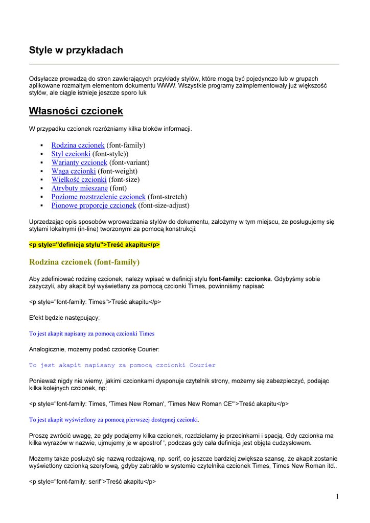 Style w przykładach Własności czcionek
