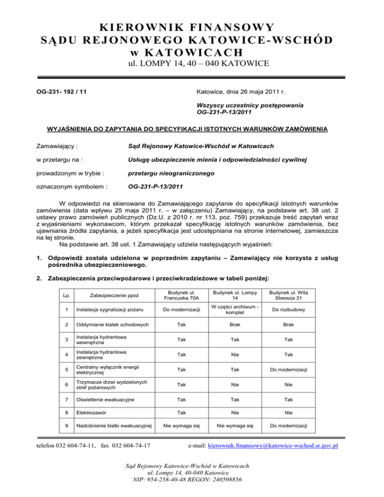 KIEROWNIK FINANSOWY SĄDU REJONOWEGO KATOWICE-WSCHÓD w KATOWICACH ul. LOMPY 14, 40 – 040 KATOWICE OG-231- 192 / 11 Katowice, dnia 26 maja 2011 r. Wszyscy uczestnicy postępowania OG-231-P-13/2011 WYJAŚNIENIA DO ZAPYTANIA DO SPECYFIKACJI ISTOTNYCH WARUNKÓW ZAMÓWIENIA Zamawiający : Sąd Rejonowy Katowice-Wschód w Katowicach w przetargu na : Usługę ubezpieczenie mienia i odpowiedzialności cywilnej prowadzonym w trybie : przetargu nieograniczonego oznaczonym symbolem : OG-231-P-13/2011 W odpowiedzi na skierowane do Zamawiającego zapytanie do specyfikacji istotnych warunków zamówienia (data wpływu 25 maja 2011 r. – w załączeniu) Zamawiający, na podstawie art. 38 ust. 2 ustawy prawo zamówień publicznych (Dz.U. z 2010 r. nr 113, poz. 759) przekazuje treść zapytań wraz z wyjaśnieniami wykonawcom, którym przekazał specyfikację istotnych warunków zamówienia, bez ujawniania źródła zapytania, a jeŜeli specyfikacja jest udostępniana na stronie internetowej, zamieszcza na tej stronie. Na podstawie art. 38 ust. 1 Zamawiający udziela następujących wyjaśnień: 1. Odpowiedź została udzielona w poprzednim zapytaniu – Zamawiający nie korzysta z usług pośrednika ubezpieczeniowego. 2. Zabezpieczenia przeciwpoŜarowe i przeciwkradzieŜowe w tabeli poniŜej: Lp. Zabezpieczenie ppoŜ Budynek ul. Francuska 70A Budynek ul. Lompy 14 Budynek ul. Wita Stwosza 31 Do modernizacji W części archiwum komplet Do rozbudowy 1 Instalacja sygnalizacji poŜaru 2 Oddymianie klatek schodowych Tak Brak Brak 3 Instalacja hydrantowa wewnętrzna Tak Tak Tak 4 Instalacja hydrantowa zewnętrzna Tak Nie Tak 5 Centralny wyłącznik energii elektrycznej Tak Tak Do modernizacji 6 Trzymacze drzwi wydzielonych stref poŜarowych Tak Nie Nie 7 Oświetlenie ewakuacyjne Tak Tak Tak 8 Elektrozawór Tak Nie Nie 9 Nadciśnienie klatki ewakuacyjnej Nie wymaga się Nie wymaga się Do modernizacji telefon 032 604-74-11, fax 032 604-74-17 e-mail: [email protected] Sąd Rejonowy Katowice-Wschód w Katowicach ul. Lompy 14, 40-040 Katowice NIP: 954-258-40-48 REGON: 240598856 KIEROWNIK FINANSOWY SĄDU REJONOWEGO KATOWICE-WSCHÓD w KATOWICACH ul. LOMPY 14, 40 – 040 KATOWICE Lp. Zabezpieczenie przeciw kradzieŜowe Budynek ul. Francuska 70A Budynek ul. Lompy 14 Budynek ul. Wita Stwosza 31 1 Ochrona obiektu Tak Tak Tak 2 Kontrola dostępu Częściowa Nie Tak 3 Monitoring Nie Częściowo Częściowo 4 System przywoławczy Tak Nie Nie 5 System włamaniowe Kasa, Kancelaria Tajna, Serwerownie Serwerownia Nie 6 Kraty, rolety Częściowa Częściowo Brak - XIX piętro 3. Ubezpieczeniu podlega budynek przy ul. Francuskiej 70A. Pozostałe budynku tj. przy ul. Lompy 14 oraz przy ul. Wita Stwosza 31 Zamawiający zajmuje na podstawie tytułu odpowiednio umowy najmu oraz umowy uŜyczenia. Charakterystyka budynku przy ul. Francuskiej 70A: − Rok budowy 1977 − Charakterystyka obiektu: 3 Kubatura: 23.766 m , 2 Powierzchnia uŜytkowa: 5.878,09 m 5 kondygnacji naziemnych + podpiwniczenie, dodatkowo kondygnacja maszynowni z wejściem na dach. − Opis konstrukcji Konstrukcja Ŝelbetowa, szkieletowa, słupowo-ryglowa ze stropami w postaci płyt Ŝelbetowych. Dach wentylowany z pokryciem płytami Ŝelbetowymi prefabrykowanymi z ociepleniem i pokryciem papowym. Posadowienie budynku na monolitycznej Ŝelbetowej skrzyni piwnicznej. Układ nośny budynku to szkielet Ŝelbetowy poprzeczny w rozstawie modułowym. Budynek wyposaŜony w instalacje: Centralnego ogrzewania zasilanego z zewnątrz, Wodno-kanalizacyjną, Siły i światła, Niskoprądową, Wentylacji mechanicznej 4. Przeprowadzone remonty – dotyczy tylko budynku przy ul. Francuskiej 70A Adaptacja 1994 r. prowadzona przez Sąd Okręgowy w Katowicach, Adaptacja 2009-2010 r. prowadzona przez Sąd Rejonowy Katowice-Wschód w Katowicach, w tym: − Modernizacja i rozbudowa zabezpieczeń przeciwpoŜarowych, − Prace ogólnobudowlane mające na celu dostosowanie pomieszczeń biurowych na potrzeby Sądu Rejonowego Katowice-Wschód w Katowicach, w tym remont wejścia głównego, − Modernizacja sieci logicznej, sieci telekomunikacyjnej, − Wymiana pionów wodno-kanalizacyjnych, − Zainstalowanie wentylacji mechanicznej w toaletach i wybranych pomieszczeniach, − Wymiana wind osobowych, telefon 032 604-74-11, fax 032 604-74-17 e-mail: [email protected] Sąd Rejonowy Katowice-Wschód w Katowicach ul. Lompy 14, 40-040 Katowice NIP: 954-258-40-48 REGON: 240598856 KIEROWNIK FINANSOWY SĄDU REJONOWEGO KATOWICE-WSCHÓD w KATOWICACH ul. LOMPY 14, 40 – 040 KATOWICE − Częściowy remont poszycia dachu, 5. W zapytaniu, jest błąd – chodziło zapewne o franszyzę określą w pkt 4.1.5, a nie jak wskazuje Pytający 4.5.1. W pkt 4.1.5 Zamawiający wskazuje na franszyzę redukcyjną. 6. Wykazu sprzętu elektronicznego w załączeniu. W imieniu Zamawiającego Kierownik Finansowy Sądu Rejonowego Katowice-Wschód w Katowicach Wiesława Fuchs Rozdzielnik: 1. www.katowice-wschod.sr.gov.pl 2. a/a Załączniki: 1. Zapytanie do SIWZ z dnia 25.05.2011 r. 2. Wykazy sprzętu elektronicznego. telefon 032 604-74-11, fax 032 604-74-17 e-mail: [email protected] Sąd Rejonowy Katowice-Wschód w Katowicach ul. Lompy 14, 40-040 Katowice NIP: 954-258-40-48 REGON: 240598856
