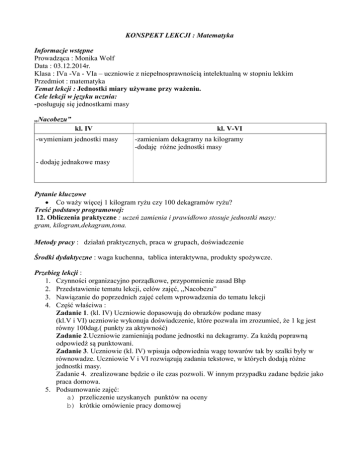 KONSPEKT LEKCJI : Matematyka Informacje wstępne Prowadząca : Monika Wolf Data : 03.12.2014r. Klasa : IVa -Va - VIa – uczniowie z niepełnosprawnością intelektualną w stopniu lekkim Przedmiot : matematyka Temat lekcji : Jednostki miary używane przy ważeniu. Cele lekcji w języku ucznia: -posługuję się jednostkami masy ,,Nacobezu” kl. IV -wymieniam jednostki masy kl. V-VI -zamieniam dekagramy na kilogramy -dodaję różne jednostki masy - dodaję jednakowe masy Pytanie kluczowe Co waży więcej 1 kilogram ryżu czy 100 dekagramów ryżu? Treść podstawy programowej: 12. Obliczenia praktyczne : uczeń zamienia i prawidłowo stosuje jednostki masy: gram, kilogram,dekagram,tona. Metody pracy : działań praktycznych, praca w grupach, doświadczenie Środki dydaktyczne : waga kuchenna, tablica interaktywna, produkty spożywcze. Przebieg lekcji : 1. Czynności organizacyjno porządkowe, przypomnienie zasad Bhp 2. Przedstawienie tematu lekcji, celów zajęć, ,,Nacobezu” 3. Nawiązanie do poprzednich zajęć celem wprowadzenia do tematu lekcji 4. Część właściwa : Zadanie 1. (kl. IV) Uczniowie dopasowują do obrazków podane masy (kl.V i VI) uczniowie wykonuja doświadczenie, które pozwala im zrozumieć, że 1 kg jest równy 100dag.( punkty za aktywność) Zadanie 2.Uczniowie zamieniają podane jednostki na dekagramy. Za każdą poprawną odpowiedź są punktowani. Zadanie 3. Uczniowie (kl. IV) wpisuja odpowiednia wagę towarów tak by szalki były w równowadze. Uczniowie V i VI rozwiązują zadania tekstowe, w których dodają różne jednostki masy. Zadanie 4. zrealizowane będzie o ile czas pozwoli. W innym przypadku zadane będzie jako praca domowa. 5. Podsumowanie zajęć: a) przeliczenie uzyskanych punktów na oceny b) krótkie omówienie pracy domowej