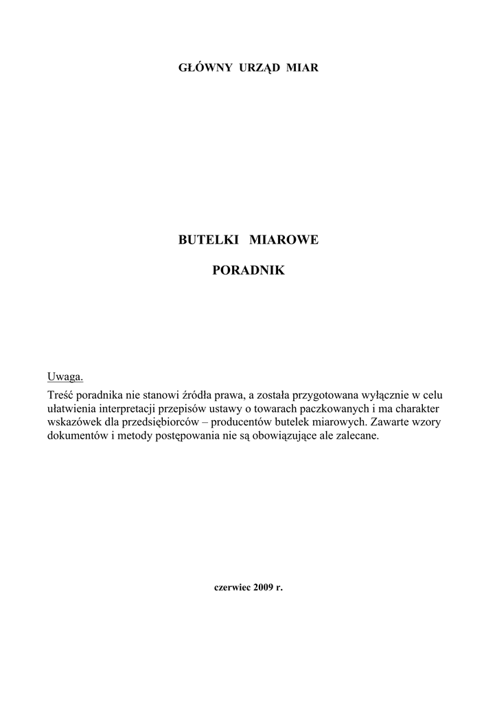 GŁÓWNY URZĄD MIAR BUTELKI MIAROWE PORADNIK Uwaga. Treść poradnika nie stanowi źródła prawa, a została przygotowana wyłącznie w celu ułatwienia interpretacji przepisów ustawy o towarach paczkowanych i ma charakter wskazówek dla przedsiębiorców – producentów butelek miarowych. Zawarte wzory dokumentów i metody postępowania nie są obowiązujące ale zalecane. czerwiec 2009 r. 2 S p i s t r e ś ci 1. Informacje ogólne ....................................................................................................................2 2. System wewnętrznej kontroli butelek miarowych ...................................................................3 3. Pomiary ....................................................................................................................................4 3.1 Przyrządy pomiarowe ..............................................................................................................4 3.2 Metody pomiarowe ..................................................................................................................7 4. 3.2.1 Sprawdzenie zgodności oznaczeń naniesionych na butelkach ........................................7 3.2.2 Sprawdzenie butelek miarowych na zgodność z wymaganiami metrologicznymi..........8 3.2.3 Opracowanie wyników pomiarów ...................................................................................9 Wykorzystanie butelek miarowych przy paczkowaniu towarów ..........................................11 4.1 Kontrola poziomu napełnienia butelek miarowych z zastosowaniem szablonu....................13 5. Dokumentowanie wyników pomiarów ..................................................................................13 6. Podział kompetencji i odpowiedzialności..............................................................................14 Załącznik 1 Protokół sprawdzenia próbki butelek miarowych z zastosowaniem oceny wyników metodą odchylenia standardowego ....................................................................................................16 Załącznik 2 Protokół sprawdzenia próbki butelek miarowych z zastosowaniem oceny wyników metodą średniego zakresu ..................................................................................................................19 1. Informacje ogólne Zasady produkcji i oznaczania znakiem „3” butelek miarowych określa ustawa z dnia 7 maja 2009 r. o towarach paczkowanych (Dz. U. Nr 91, poz. 740), zwana dalej „ustawą”. Producent butelek miarowych zwany dalej „producentem” może na własną odpowiedzialność oznaczać je znakiem „3” o wysokości co najmniej 3 mm, stanowiącym gwarancję producenta, że butelka spełnia wymagania określone w ustawie. Wymagania metrologiczne dotyczące butelek miarowych zawiera załącznik nr 4 do ustawy, a wzór znaku „3” określa załącznik nr 5 do ustawy. Ustawa dotyczy butelek o pojemności nominalnej od 50 ml do 5 l. Zgodnie z art. 30 ust. 1 ustawy producent jest odpowiedzialny za zorganizowanie i przeprowadzanie kontroli wewnętrznej butelek miarowych. Do kontroli wewnętrznej butelek miarowych producent może stosować metodę referencyjną lub inną, o skuteczności co najmniej takiej samej jak skuteczność metody referencyjnej. Opis metody referencyjnej zawiera załącznik nr 6 do ustawy. O przyjęciu lub odrzuceniu partii butelek miarowych decyduje wynik kontroli wewnętrznej butelek miarowych. Art. 30 ust. 3 ustawy stanowi, że producent jest obowiązany sporządzić opis przyjętego systemu kontroli wewnętrznej butelek miarowych. Opis przyjętego systemu kontroli wewnętrznej butelek miarowych producent jest obowiązany udostępnić na każde żądanie organów sprawujących nadzór (zgodnie z art. 30 ust. 4 ustawy). 3 Producent przed rozpoczęciem produkcji, zgodnie z art. 24 ustawy, jest obowiązany do zgłoszenia Prezesowi Głównego Urzędu Miar – w celu rejestracji – znaku umieszczanego na butelce służącego do identyfikacji producenta. Znak powinien posiadać indywidualne cechy graficzne pozwalające jednoznacznie odróżnić go od zarejestrowanych już znaków identyfikacyjnych innych producentów. Poradnik został opracowany na podstawie następujących dokumentów wydanych przez European Cooperation in Legal Metrology (WELMEC): a) Guide for packers and importers of e-marked prepacked products. b) Guidance on Controls for Competent Department’s on „e” marked Pre-packaging. c) Guide for recognition of procedures. Inne przewodniki dotyczące towarów paczkowanych opracowane przez WG6 – Prepackages (numeracja zaczynająca się od cyfry 6) dostępne są na stronie internetowej www.welmec.org w linku Guides. 2. System wewnętrznej kontroli butelek miarowych System kontroli wewnętrznej butelek miarowych powinien zapewniać, że butelki miarowe wprowadzone do obrotu, spełniają wymagania ustawy. Producent powinien stosować system kontroli wewnętrznej w taki sposób, aby mógł udowodnić, że działa zgodnie z określonymi procedurami (np. procedura pobierania próbek, dobór przyrządów pomiarowych). System powinien obejmować, co najmniej: 1) wszystkie dane dotyczące pomiarów, w tym: • zapisy z wynikami badań próbek metodą statystyczną, • sprawdzenie oznaczeń naniesionych na butelkach, • dowody kontroli metrologicznej przyrządów pomiarowych, 2) rejestr zakłóceń w procesie produkcji, w którym powinno się opisać okoliczności zatrzymania partii, ich przyczyny i podejmowane działania korygujące. Wszystkie zapisy powinny być jasne i czytelne. W czasie kontroli wewnętrznej partii powinna być wyznaczana i oceniana: a) pojemność rzeczywista butelek wchodzących w skład próbki, b) pojemność brzegowa butelek wchodzących w skład próbki. Maksymalne dopuszczalne błędy (dodatnie i ujemne) pojemności butelek miarowych, to znaczy największe dopuszczalne różnice (dodatnie i ujemne) pomiędzy pojemnością rz