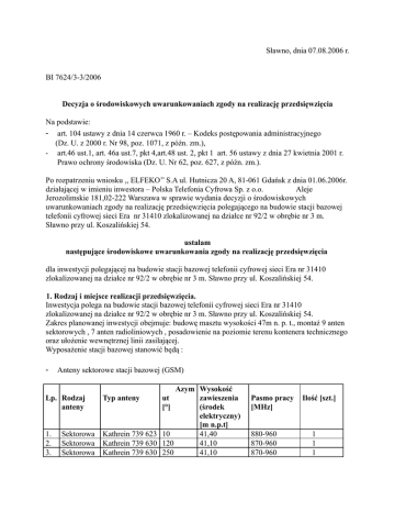 Sławno, dnia 07.08.2006 r. BI 7624/3-3/2006 Decyzja o środowiskowych uwarunkowaniach zgody na realizację przedsięwzięcia Na podstawie: - art. 104 ustawy z dnia 14 czerwca 1960 r. – Kodeks postępowania administracyjnego (Dz. U. z 2000 r. Nr 98, poz. 1071, z późn. zm.), - art.46 ust.1, art. 46a ust.7, pkt 4,art.48 ust. 2, pkt 1 art. 56 ustawy z dnia 27 kwietnia 2001 r. Prawo ochrony środowiska (Dz. U. Nr 62, poz. 627, z późn. zm.). Po rozpatrzeniu wniosku ,, ELFEKO’’ S.A ul. Hutnicza 20 A, 81-061 Gdańsk z dnia 01.06.2006r. działającej w imieniu inwestora – Polska Telefonia Cyfrowa Sp. z o.o. Aleje Jerozolimskie 181,02-222 Warszawa w sprawie wydania decyzji o środowiskowych uwarunkowaniach zgody na realizację przedsięwzięcia polegającego na budowie stacji bazowej telefonii cyfrowej sieci Era nr 31410 zlokalizowanej na działce nr 92/2 w obrębie nr 3 m. Sławno przy ul. Koszalińskiej 54. ustalam następujące środowiskowe uwarunkowania zgody na realizację przedsięwzięcia dla inwestycji polegającej na budowie stacji bazowej telefonii cyfrowej sieci Era nr 31410 zlokalizowanej na działce nr 92/2 w obrębie nr 3 m. Sławno przy ul. Koszalińskiej 54. 1. Rodzaj i miejsce realizacji przedsięwzięcia. Inwestycja polega na budowie stacji bazowej telefonii cyfrowej sieci Era nr 31410 zlokalizowanej na działce nr 92/2 w obrębie nr 3 m. Sławno przy ul. Koszalińskiej 54. Zakres planowanej inwestycji obejmuje: budowę masztu wysokości 47m n. p. t., montaż 9 anten sektorowych , 7 anten radioliniowych , posadowienie na poziomie terenu kontenera technicznego oraz ułożenie wewnętrznej linii zasilającej. Wyposażenie stacji bazowej stanowić będą : - Anteny sektorowe stacji bazowej (GSM) Lp. Rodzaj anteny 1. 2. 3. Sektorowa Sektorowa Sektorowa Azym Wysokość Typ anteny ut zawieszenia [°] (środek elektryczny) [m n.p.t] Kathrein 739 623 10 41,40 Kathrein 739 630 120 41,10 Kathrein 739 630 250 41,10 Pasmo pracy [MHz] 880-960 870-960 870-960 Ilość [szt.] 1 1 1 - Anteny sektorowe stacji bazowej (DCS): Lp. Rodzaj anteny 1. 2. 3. - Sektorowa Sektorowa Sektorowa - ut [°] Pasmo pracy [MHz] 1710-1880 1710-1880 1710-1880 Ilość [szt.] 1 1 1 Anteny sektorowe stacji bazowej (UMTS): Lp. Rodzaj anteny 1. 2. 3. Azym Wysokość zawieszenia (środek elektryczny) [m n.p.t] Kathrein 742 215 10 35,90 Kathrein 742 213 120 36,80 Kathrein 742 213 250 36,80 Typ anteny Sektorowa Sektorowa Sektorowa Azym Wysokość zawieszenia (środek elektryczny) [m n.p.t] Kathrein 742 215 10 35,90 Kathrein 742 213 120 36,80 Kathrein 742 213 250 36,80 Typ anteny ut [°] Pasmo pracy [MHz] 1920-2200 1920-2170 1920-2170 Ilość [szt.] 1 1 1 Anteny Paraboliczne: Lp. Rodzaj anteny Typ anteny 1. 2. 3. 4. 5. 6. 7. ML1 (ML-M) ML 2 (ML-S) ML 3 ( ML-S) ML 4 ( ML-M) ML 5 ( ML-M) L 1 (L ) L2(L) Radiolinia Radiolinia Radiolinia Radiolinia Radiolinia Radiolinia Radiolinia Azym Wysokość ut zawieszenia [°] (środek elektryczny) [m n.p.t] 344 29 33 56 180 90 90 38,8 38,00 39,10 38,80 38,80 42,00 41,00 Pasmo częstotliwości [GHz] 7-26 7-38 7-38 7-26 7-26 26-28 26-28 Przyjęta tolerancja odchylenia w płaszczyźnie poziomej od kierunku pracy anten radiolinii wynosi +/ - 30°. Urządzenia zasilające, sterujące i nadawczo- odbiorcze umieszczone będą w kontenerze u podnóża wieży. Obszar gdzie ma być zlokalizowana inwestycja przeznaczony jest na działalność ponadlokalną, wielokubaturową. W bezpośrednim sąsiedztwie nie występują wysokie zabudowania, ani inne przeszkody terenowe mogące mieć wpływ na warunki propagacji fal emitowanych przez stację bazową. 2.Warunki wykorzystywania terenu w fazie realizacji i eksploatacji, ze szczególnym uwzględnieniem konieczności ochrony cennych wartości przyrodniczych, zasobów naturalnych i zabytków oraz ograniczenia uciążliwości dla terenów sąsiednich. Etap rozbudowy stacji nie będzie negatywnie oddziaływał na przebywających w pobliżu ludzi, nie stanowi on źródła hałasu, ani źródła zanieczyszczenia środowiska. Elementy stacji będą montowane przez kilkuosobową załogę, która nie będzie potrzebowała zaplecza budowy stanowiącego zagrożenie dla środowiska. Okresowe przeglądy techniczne oraz ewentualne naprawy stacji nie są ekologicznie uciążliwe. Stacja bazowa telefonii cyfrowej nie wymaga obsługi. Hermetyczne akumulatory zastosowane w projekcie są również bezobsługowe i nie stwarzają możliwości zanieczyszczenia środowiska. Zarówno tor przewodowy jak i aparatura nie stanowią żadnych zauważalnych uciążliwości dla ludzi i środowiska. Przewiduje się, że oceniana inwestycja nie będzie oddziaływać w sposób niekorzystny na elementy środowiska naturalnego tj. powietrze, glebę, wody powierzchniowe i podziemne, klimat akustyczny oraz świat roślinny i zwierzęcy. Powstanie i funkcjonowanie stacji nie będzie też źródłem powstawania odpadów. Potencjalnymi źródłami hałasu przedmiotowej stacji bazowej mogą być klimatyzator instalowany w szafach technologicznych oraz anteny narażone na działanie wiatru. Wypadkowy poziom hałasu powodowany w/w czynnikami szacuje się jako znacznie mniejszy od dopuszczalnego poziomu hałasu. W fazie eksploatacji dominującym czynnikiem fizycznym, przez który stacja może oddziaływać na środowisko jest elektromagnetyczne promieniowanie niejonizujące, emitowane przez anteny sektorowe i radiolinie. Obszary, w których średnia gęstość mocy promieniowej będzie przekraczała poziom graniczny będą występowały na znacznych wysokościach wolnej przestrzeni i poza miejscami dostępnymi dla ludzi. Urządzenia zasilające i nadawczo-odbiorcze stacji, jako typowe ekranowe urządzenia elektroniczne małej mocy zasilane z sieci niskiego napięcia, jak również ekranowe kable współosiowe przesyłające energię do i z systemów antenowych nie będą źródłami pól elektromagnetycznych istotnych pod względem oddziaływania biologicznego na ludzi i środowisko. W prz