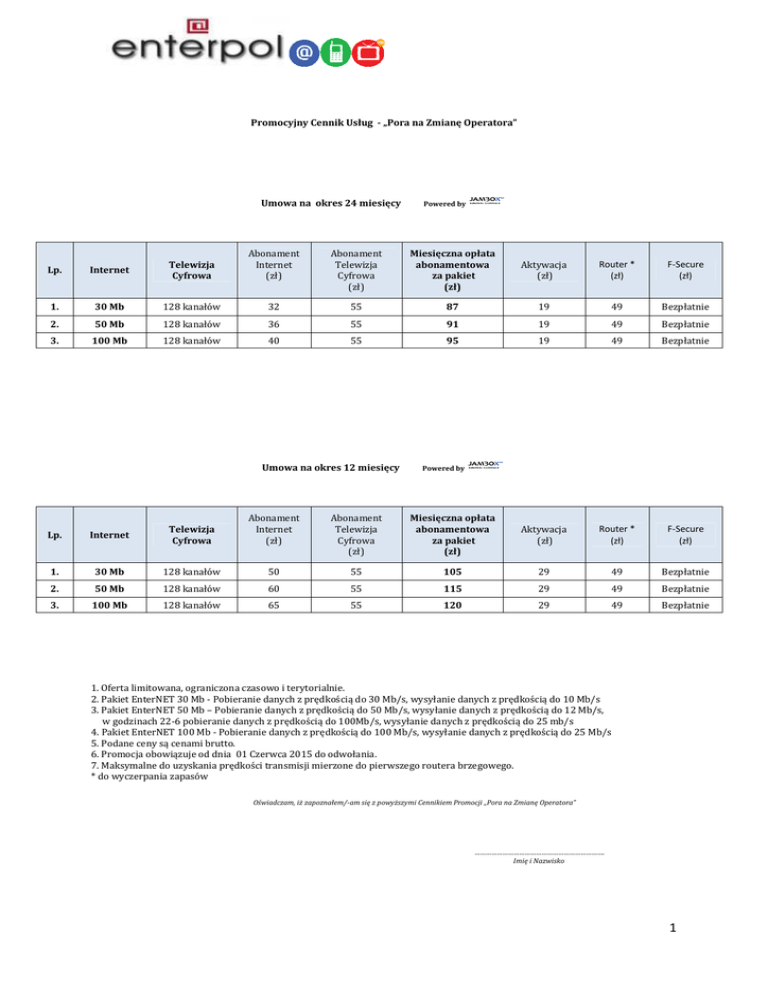 Promocyjny Cennik Usług - „Pora na Zmianę Operatora” Umowa na okres 24 miesięcy Powered by Lp. Internet Telewizja Cyfrowa Abonament Internet (zł) Abonament Telewizja Cyfrowa (zł) Miesięczna opłata abonamentowa za pakiet (zł) Aktywacja (zł) Router * (zł) F-Secure (zł) 1. 30 Mb 128 kanałów 32 55 87 19 49 Bezpłatnie 2. 50 Mb 128 kanałów 36 55 91 19 49 Bezpłatnie 3. 100 Mb 128 kanałów 40 55 95 19 49 Bezpłatnie Umowa na okres 12 miesięcy Lp. Internet Telewizja Cyfrowa 1. 30 Mb 128 kanałów Powered by Abonament Internet (zł) Abonament Telewizja Cyfrowa (zł) Miesięczna opłata abonamentowa za pakiet (zł) Aktywacja (zł) Router * (zł) F-Secure (zł) 50 55 105 29 49 Bezpłatnie 2. 50 Mb 128 kanałów 60 55 115 29 49 Bezpłatnie 3. 100 Mb 128 kanałów 65 55 120 29 49 Bezpłatnie 1. Oferta limitowana, ograniczona czasowo i terytorialnie. 2. Pakiet EnterNET 30 Mb - Pobieranie danych z prędkością do 30 Mb/s, wysyłanie danych z prędkością do 10 Mb/s 3. Pakiet EnterNET 50 Mb – Pobieranie danych z prędkością do 50 Mb/s, wysyłanie danych z prędkością do 12 Mb/s, w godzinach 22-6 pobieranie danych z prędkością do 100Mb/s, wysyłanie danych z prędkością do 25 mb/s 4. Pakiet EnterNET 100 Mb - Pobieranie danych z prędkością do 100 Mb/s, wysyłanie danych z prędkością do 25 Mb/s 5. Podane ceny są cenami brutto. 6. Promocja obowiązuje od dnia 01 Czerwca 2015 do odwołania. 7. Maksymalne do uzyskania prędkości transmisji mierzone do pierwszego routera brzegowego. * do wyczerpania zapasów Oświadczam, iż zapoznałem/-am się z powyższymi Cennikiem Promocji „Pora na Zmianę Operatora” ……………………………………………………………. Imię i Nazwisko 1 Promocyjny Cennik Usług - „Pora na Zmianę Operatora” Umowa na okres 24 miesięcy Lp. Internet Telefon 1. 30 Mb 200 min 2. 50 Mb 200 min 3. 100 Mb 200 min Telewizja Cyfrowa 128 kanałów 128 kanałów 128 kanałów Powered by Abonament Telefon (zł) Abonament Telewizja Cyfrowa (zł) Miesięczna opłata abonamentowa za pakiet (zł) Aktywacja (zł) Router * (zł) F-Secure (zł) 32 10 55 97 19 49 Bezpłatnie 36 10 55 101 19 49 Bezpłatnie 40 10 55 105 19 49 Bezpłatnie Abonament Internet (zł) Umowa na okres 12 miesięcy Lp. Internet Telefon 1. 30 Mb 200 min 2. 50 Mb 200 min 3. 100 Mb 200 min Telewizja Cyfrowa 128 kanałów 128 kanałów 128 kanałów Powered by Abonament Telefon (zł) Abonament Telewizja Cyfrowa (zł) Miesięczna opłata abonamentowa za pakiet (zł) Aktywacja (zł) Router * (zł) F-Secure (zł) 50 10 55 115 29 49 Bezpłatnie 60 10 55 125 29 49 Bezpłatnie 65 10 55 130 29 49 Bezpłatnie Abonament Internet (zł) 1. Oferta limitowana, ograniczona czasowo i terytorialnie. 2. Pakiet EnterNET 30 Mb - Pobieranie danych z prędkością do 30 Mb/s, wysyłanie danych z prędkością do 10 Mb/s 3. Pakiet EnterNET 50 Mb – Pobieranie danych z prędkością do 50 Mb/s, wysyłanie danych z prędkością do 12 Mb/s, w godzinach 22-6 pobieranie danych z prędkością do 100Mb/s, wysyłanie danych z prędkością do 25 mb/s 4. Pakiet EnterNET 100 Mb - Pobieranie danych z prędkością do 100 Mb/s, wysyłanie danych z prędkością do 25 Mb/s 5. Podane ceny są cenami brutto. 6. Promocja obowiązuje od dnia 01 Czerwca 2015 do odwołania. 7. Maksymalne do uzyskania prędkości transmisji mierzone do pierwszego routera brzegowego. * do wyczerpania zapasów Oświadczam, iż zapoznałem/-am się z powyższymi Cennikiem Promocji „Pora na Zmianę Operatora” ……………………………………………………………. Imię i Nazwisko 2