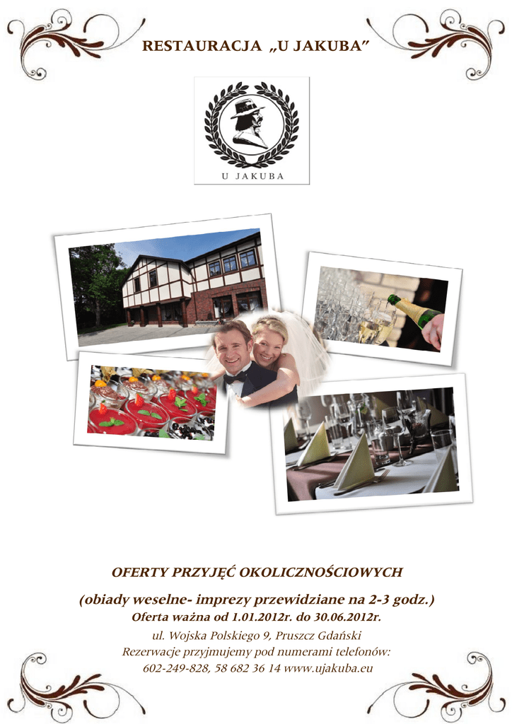 RESTAURACJA „U JAKUBA” OFERTY PRZYJĘĆ OKOLICZNOŚCIOWYCH (obiady weselne- imprezy przewidziane na 2-3 godz.) Oferta ważna od 1.01.2012r. do 30.06.2012r. ul. Wojska Polskiego 9, Pruszcz Gdański Rezerwacje przyjmujemy pod numerami telefonów: 602-249-828, 58 682 36 14 www.ujakuba.eu Oferta nr 11 Powitanie chlebem i solą Wino musujące na toast dla pary młodej i wszystkich gości Przekąska zimna na początek: Sandacz faszerowany po „Kardynalsku” w delikatnej galarecie podany z sosem tatarskim. Pieczywo , masło. Zupa: Rosół z domowym makaronem i młodymi jarzynami. Danie główne: Eskalopki z polędwiczki wieprzowej podane w kremowym sosie z grzybów leśnych , młodymi ziemniakami z koperkiem ,bukietem warzyw gotowanych na parze i kompozycją surówek. Deser: Szarlotka podawana na ciepło z lodami waniliowymi , bitą śmietaną i sosem malinowym. Kawa lub herbata. 1 Oferta ważna od 1.01.2012r. do 30.06.2012r. Oferta nr 22 Powitanie chlebem i solą Wino musujące dla pary młodej i wszystkich gości Przekąska zimna na początek: Tatar z wędzonego łososia podany z aromatycznym sosem koperkowym i jajkami przepiórczymi. Pieczywo , masło. Zupy do wyboru: Rosół z wiejskiej kury z domowym makaronem i paseczkami młodych jarzyn. Wyborny krem ze szparagów z groszkiem ptysiowym. Dania główne podane na półmiskach: Łosoś pieczony podany na sosie koperkowym. Pieczone udko z kaczki na karmelizowanych jabłkach z sosem żurawinowym. Złociste medaliony z indyczki panierowane w płatkach migdałowych. Dodatki: Ziemniaki gotowane z masłem i koperkiem , frytki , modra kapusta z rodzynkami , kompozycja surówek. Deser: Lody waniliowe z ciepłym sosem malinowym i bitą śmietaną. Kawa , herbata. 2 Oferta ważna od 1.01.2012r. do 30.06.2012r. Oferta nr 3 3 Powitanie chlebem i solą Wino musujące dla pary młodej i wszystkich gości Zupy do wyboru: Aromatyczny rosół z drobiowymi knedlikami i paseczkami młodych jarzyn. Krem z grzybów leśnych w aromacie tymianku podany z groszkiem ptysiowym. Dania główne podane na półmiskach: Zraziki „Rublow” nadziewane wędzonym serem , szynką i pieczarkami duszone w sosie własnym z białym winem. Złociste kotlety De volaille nadziewane masłem pietruszkowym Sola w cieście parmezanowym zapiekana z suszonymi pomidorami i wiórkami mozzarelli. Dodatki: Ziemniaki gotowane z masłem i koperkiem , frytki , bukiet sezonowych warzyw gotowanych na parze, kompozycja surówek. Deser i ciasta: Puchar lodów z owocami sezonowymi i bitą śmietaną. Sernik domowy. Jabłecznik z ekologicznych jabłek. Kawa , herbata. 3 Oferta ważna od 1.01.2012r. do 30.06.2012r.