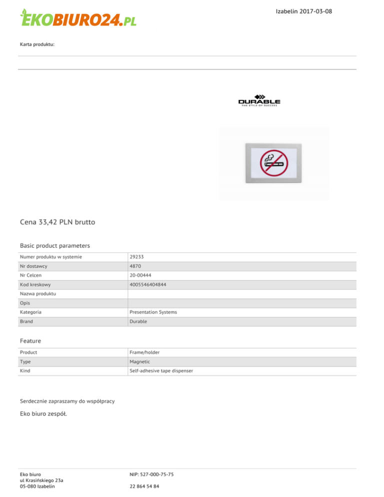 Izabelin 2017-03-08 Karta produktu: Cena 33,42 PLN brutto Basic product parameters Numer produktu w systemie 29233 Nr dostawcy 4870 Nr Celcen 20-00444 Kod kreskowy 4005546404844 Nazwa produktu Opis Kategoria Presentation Systems Brand Durable Feature Product Frame/holder Type Magnetic Kind Self-adhesive tape dispenser Serdecznie zapraszamy do współpracy Eko biuro zespół. Eko biuro ul Krasińskiego 23a 05-080 Izabelin NIP: 527-000-75-75 22 864 54 84