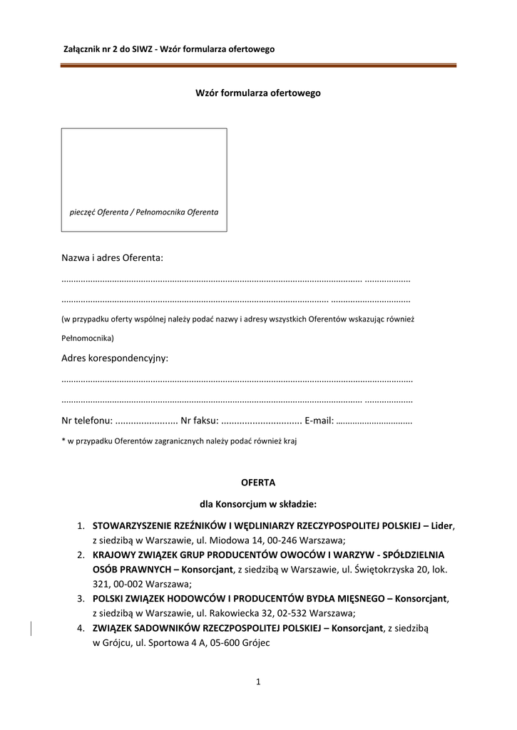 Załącznik nr 2 do SIWZ - Wzór formularza ofertowego Wzór formularza ofertowego pieczęć Oferenta / Pełnomocnika Oferenta Nazwa i adres Oferenta: ............................................................................................................................. ................... ............................................................................................................... ................................. (w przypadku oferty wspólnej należy podać nazwy i adresy wszystkich Oferentów wskazując również Pełnomocnika) Adres korespondencyjny: .................................................................................................................................................. ............................................................................................................................. .................... Nr telefonu: ........................ Nr faksu: ............................... E-mail: …............................. * w przypadku Oferentów zagranicznych należy podać również kraj OFERTA dla Konsorcjum w składzie: 1. STOWARZYSZENIE RZEŹNIKÓW I WĘDLINIARZY RZECZYPOSPOLITEJ POLSKIEJ – Lider, z siedzibą w Warszawie, ul. Miodowa 14, 00-246 Warszawa; 2. KRAJOWY ZWIĄZEK GRUP PRODUCENTÓW OWOCÓW I WARZYW - SPÓŁDZIELNIA OSÓB PRAWNYCH – Konsorcjant, z siedzibą w Warszawie, ul. Świętokrzyska 20, lok. 321, 00-002 Warszawa; 3. POLSKI ZWIĄZEK HODOWCÓW I PRODUCENTÓW BYDŁA MIĘSNEGO – Konsorcjant, z siedzibą w Warszawie, ul. Rakowiecka 32, 02-532 Warszawa; 4. ZWIĄZEK SADOWNIKÓW RZECZPOSPOLITEJ POLSKIEJ – Konsorcjant, z siedzibą w Grójcu, ul. Sportowa 4 A, 05-600 Grójec 1 Załącznik nr 2 do SIWZ - Wzór formularza ofertowego W odpowiedzi na zaproszenie do składania ofert na wdrożenie kampanii informacyjnopromocyjnej pt. „SMAKI EUROPY - JAKOŚĆ I TRADYCJA” składamy niniejszą ofertę oświadczając, że akceptujemy w całości wszystkie warunki zawarte w Specyfikacji Istotnych Warunków Zamówienia (SIWZ) oraz jej załącznikach, w tym wzór Istotnych Postanowień Umowy (IPU). 1. Oferujemy wykonanie całego zamówienia zgodnie z postanowieniami Specyfikacji Istotnych Warunków Zamówienia przedmiotowego postępowania za cenę netto 5 357 143,00 EUR (słownie: pięć milionów trzysta pięćdziesiąt siedem tysięcy sto czterdzieści trzy euro 00/100). 2. Oświadczamy, że powyższa cena zawiera wszystkie koszty jakie poniesie Zamawiający w związku z realizacją zamówienia w przypadku wyboru niniejszej oferty. 3. Oświadczamy, że wykonamy całość przedmiotu zamówienia w terminie określonym w SIWZ. 4. Jednocześnie oświadczamy, że: Posiadamy status przedsiębiorcy w rozumieniu art. 4 ust. 1 ustawy z dnia 2 lipca 2004 r. o swobodzie działalności gospodarczej; Znajdujemy się w sytuacji ekonomicznej i finansowej zapewniającej poprawną i terminową realizację zamówienia; Posiadamy niezbędną wiedzę i doświadczenie zapewniające poprawną i terminową realizację zamówienia; Dysponujemy odpowiednim potencjałem ludzkim zapewniającym poprawną i terminową realizację zamówienia; Dysponujemy odpowiednim potencjałem technicznym gwarantującym poprawną i terminową realizację zamówienia; Posiadamy ubezpieczenie od odpowiedzialności cywilnej; Nie podlegamy wykluczeniu z procedury; Akceptujemy warunki uczestnictwa w postępowaniu, określone w Specyfikacji Istotnych Warunków Zamówienia oraz wzorze Istotnych Postanowień Umowy (IPU). 5. Zobowiązujemy się, w przypadku wyboru naszej Oferty, do wniesienia zabezpieczenia należytego wykonania umowy w wysokości, na warunkach i w sposób określony w SIWZ. 6. Wadium w kwocie 30 000,00 PLN zostało wniesione w dniu ….................. w formie ........................................................................................... . Wadium wpłacone w gotówce należy zwrócić na rachunek bankowy w …………………………………………………………………………..Nr……………………………………………….. 2 Załącznik nr 2 do SIWZ - Wzór formularza ofertowego 7. Oświadczamy, że oferta jest dla nas wiążąca przez okres 16 miesięcy, liczony od daty ustalonej na złożenie oferty. Załączniki do formularza ofertowego: 1. Oferta programu przygotowana zgodnie z pkt. 2 SIWZ; 2. Dokumenty wymagane w Załączniku nr 3 do SIWZ – Tabela oceny oferty. ……………………………… (miejscowość i data) .…………..………….…………………………………..…. (podpis i imienna pieczątka uprawnionego przedstawiciela Wykonawcy**) **w przypadku Wykonawców występujących wspólnie podpisuje Pełnomocnik lub wszyscy Wykonawcy 3