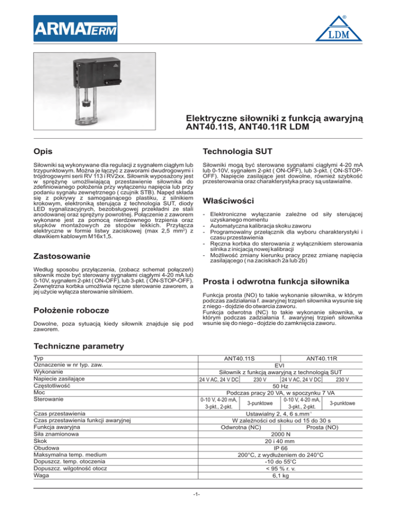 ® Elektryczne siłowniki z funkcją awaryjną ANT40.11S, ANT40.11R LDM Opis Technologia SUT Siłowniki są wykonywane dla regulacji z sygnałem ciągłym lub trzypunktowym. Można je łączyć z zaworami dwudrogowymi i trójdrogowymi serii RV 113 i RV2xx. Siłownik wyposażony jest w sprężynę umożliwiającą przestawienie siłownika do zdefiniowanego położenia przy wyłączeniu napięcia lub przy podaniu sygnału zewnętrznego ( czujnik STB). Napęd składa się z pokrywy z samogasnącego plastiku, z silnikiem krokowym, elektroniką sterująca z technologia SUT, diody LED sygnalizacyjnych, bezobsługowej przekładni ze stali anodowanej oraz sprężyny powrotnej. Połączenie z zaworem wykonane jest za pomocą nierdzewnego trzpienia oraz słupków montażowych ze stopów lekkich. Przyłącza elektryczne w formie listwy zaciskowej (max 2,5 mm2) z dławikiem kablowym M16x1,5. Siłowniki mogą być sterowane sygnałami ciągłymi 4-20 mA lub 0-10V, sygnałem 2-pkt ( ON-OFF), lub 3-pkt. ( ON-STOPOFF). Napięcie zasilające jest dowolne, również szybkość przesterowania oraz charakterystyka pracy są ustawialne. Właściwości - Elektroniczne wyłączanie zależne od siły sterującej uzyskanego momentu - Automatyczna kalibracja skoku zaworu - Programowalny przełącznik dla wyboru charakterystyki i czasu przestawienia - Ręczna korbka do sterowania z wyłącznikiem sterowania silnika z inicjacją nowej kalibracji - Możliwość zmiany kierunku pracy przez zmianę napięcia zasilającego ( na zaciskach 2a lub 2b) Zastosowanie Według sposobu przyłączenia, (zobacz schemat połączeń) siłownik może być sterowany sygnałami ciągłymi 4-20 mA lub 0-10V, sygnałem 2-pkt ( ON-OFF), lub 3-pkt. ( ON-STOP-OFF). Zewnętrzna korbka umożliwia ręczne sterowanie zaworem, a jej użycie wyłącza sterowanie silnikiem. Prosta i odwrotna funkcja siłownika Funkcja prosta (NO) to takie wykonanie siłownika, w którym podczas zadziałania f. awaryjnej trzpień siłownika wysunie się z niego - dojdzie do otwarcia zaworu. Funkcja odwrotna (NC) to takie wykonanie siłownika, w którym podczas zadziałania f. awaryjnej trzpień siłownika wsunie się do niego - dojdzie do zamknięcia zaworu. Położenie robocze Dowolne, poza sytuacją kiedy siłownik znajduje się pod zaworem. Techniczne parametry Typ Oznaczenie w nr typ. zaw. Wykonanie Napiecie zasilające Częstotliwość Moc Sterowanie Czas przestawienia Czas przestawienia funkcji awaryjnej Funkcja awaryjna Siła znamionowa Skok Obudowa Maksymalna temp. medium Dopuszcz. temp. otoczenia Dopuszcz. wilgotność otocz Waga ANT40.11S ANT40.11R EVI Siłownik z funkcją awaryjną z technologią SUT 24 V AC, 24 V DC 230 V 24 V AC, 24 V DC 230 V 50 Hz Podczas pracy 20 VA, w spoczynku 7 VA 0-10 V, 4-20 mA, 0-10 V, 4-20 mA, 3-punktowe 3-punktowe 3-pkt., 2-pkt. 3-pkt., 2-pkt. Ustawialny 2, 4, 6 s.mm-1 W zależności od skoku od 15 do 30 s Odwrotna (NC) Prosta (NO) 2000 N 20 i 40 mm IP 66 200°C, z wydłużeniem do 240°C o -10 do 55 C < 95 % r. v. 6,1 kg -1- ® Akcesoria dodatkowe 0313529 001 0372332 001 0372333 001 0372333 002 0372334 001 0372334 002 0372334 006 0372336 910 0386263 001 0386263 002 1) Jednostka zmiany zakresu i kierunku pracy sygnału sterującego Moduł plug-in dla napięcia 230V AC , 3-pkt sterowanie, (dodatkowe obciążenie 2 VA) Pomocniczy wyłącznik podwójny 5(2) A, 12 do 250V AC, min. 250mA, 12V 1) Pomocniczy wyłącznik podwójny styki złocone. Od 1mA, max 30V, 3(1)A, 12 do 250V AC 1) Potencjometr 2000, 1 W, 24 V 1) Potencjometr 130 Ω, 1 W, 24 V 1) Potencjometr 1000 Ω, 1 W, 24 V 1) Wydłużenie dla medium 200 do 240°C Dławik kablowy M16 x 1,5 Dławik kablowy M20 x 1,5 (1 ks szt. jest standardową częścią dostawy) Można stosować tylko w oznaczonych schematach połączeń Funkcje podaniu zasilania na zacisk 2b trzpień siłownika wysuwa się i zawór jest otwierany, po odłączeniu tego napięcia siłownik przestawi się w drugie położenie i zamknie zawór. Za pomocą mikroprzełączników należy ustawić czas przejścia, przy tym typie sterowania nie ustawia się charakterystyki pracy ( jest ona zgodna z charakterystyką zaworu).Sygnał nadajnika położenia jest aktywny, na zaciskach 21 jest napięcie. Zaciski 3i, 3u nie mogą być podłączone. Przy pierwszym uruchomieniu lub po zadziałaniu f. awaryjnej ( zacisk 21), siłownik będzie gotów do pracy dopiero po upływie czasu 45 s. Inicjacja i sygnał zwrotny położenia Siłowniki sterowane sygnałem ciągłym inicjują się automatycznie zgodnie z opisem. Jeśli siłownik jest po raz pierwszy uruchamiany na zaworze należy ręcznie ustawić siłownik w dolnym położeniu zaworu, podłączyć napięcie zasilające, następnie kręcąc korbką ręczną ustawić zawór w pozycji zamknięty, potem w pozycje otwarty, a skok zaworu zostanie zmierzony i automatycznie zapamiętany. Sygnał sterujący oraz zwrotny położenia zaworu zostaje dopasowany do ustawionego skoku. Jeśli w tym czasie nastąpi przestawienie lub wyłączenie napięcia - inicjacja zostanie przerwana. Wartości inicjacji zostają zapisane i siłownik jest gotowy do pracy. Chcąc ponownie inicjować siłownik należy w czasie 4 sekund dwukrotnie rozłożyć i złożyć korbkę ręczną. Potwierdzeniem wejścia w stan inicjacji jest miganie obu czerwonych diod LED. Podczas inicjacji sygnał zwrotny położenia jest nieaktywny lub równy "0”. Inicjacja jest realizowana z największą dostępną prędkością. Wartości zostają zapisane po dokończeniu procesu. Jeśli siłownik napotka zbyt duży opór związany z zablokowaniem zaworu – wystawia raport o blokadzie – sygnał położenia o wartości "0” po czasie ok. 90 s. W tym czasie siłownik próbuje samoistnie się odblokować otwierając i zamykając zawór. Jeśli ta operacja się powiedzie i zawór się odblokuje, siłownik wraca do normalnej pracy, a sygnał zwrotny jest ponownie dostępny. Siłowniki sterowane 2-pkt lub 3-pkt nie są inic